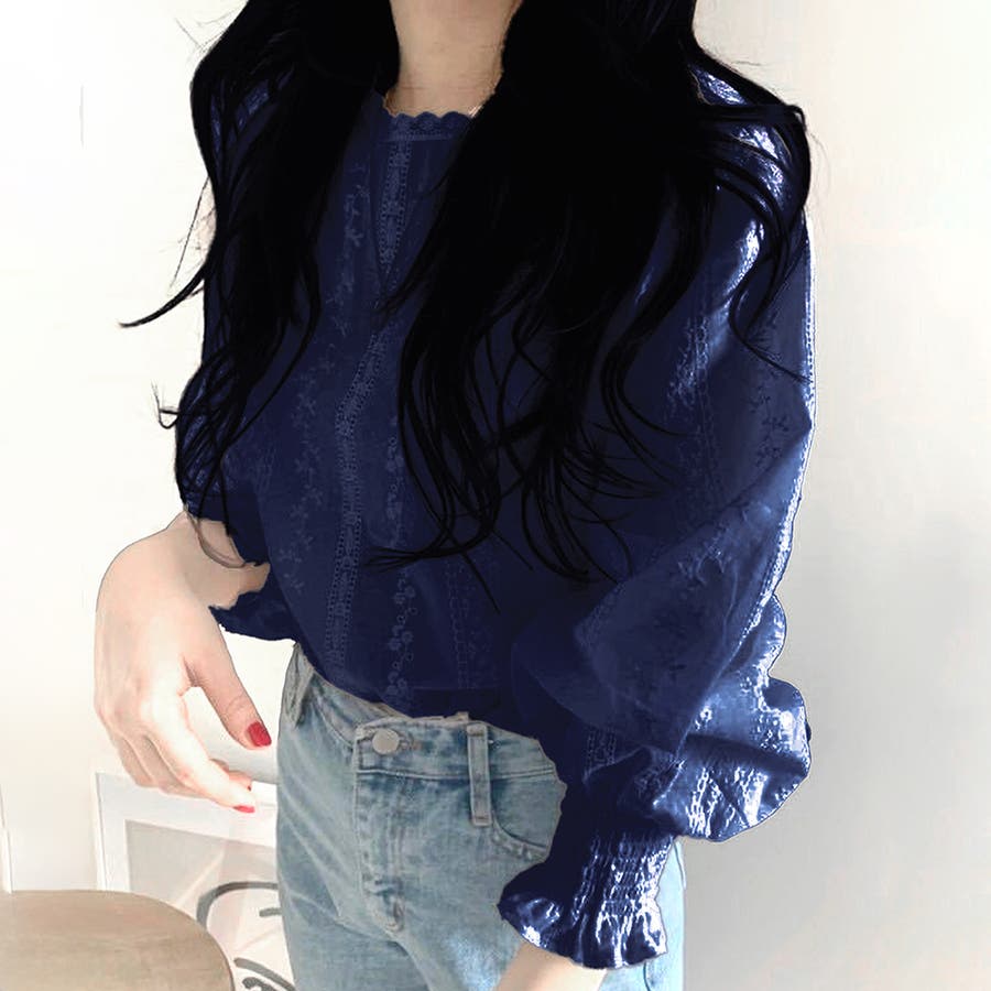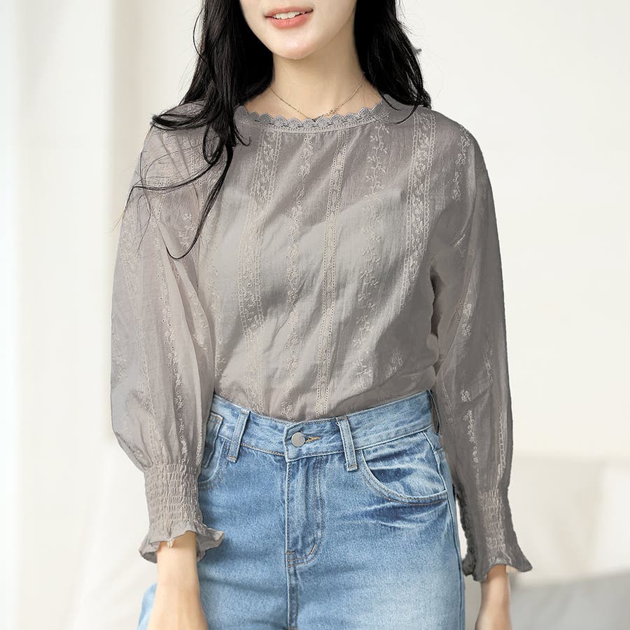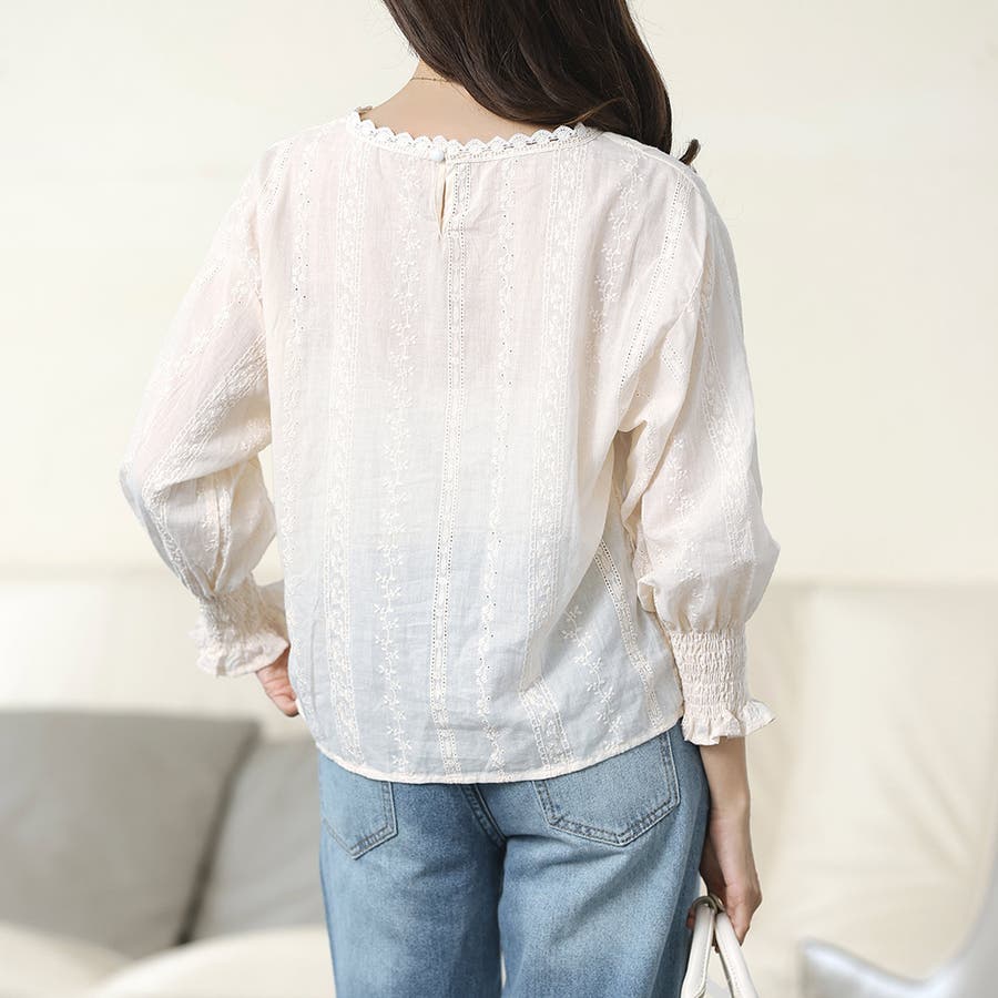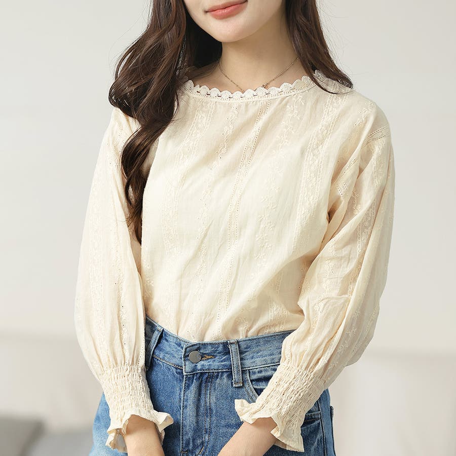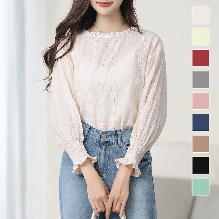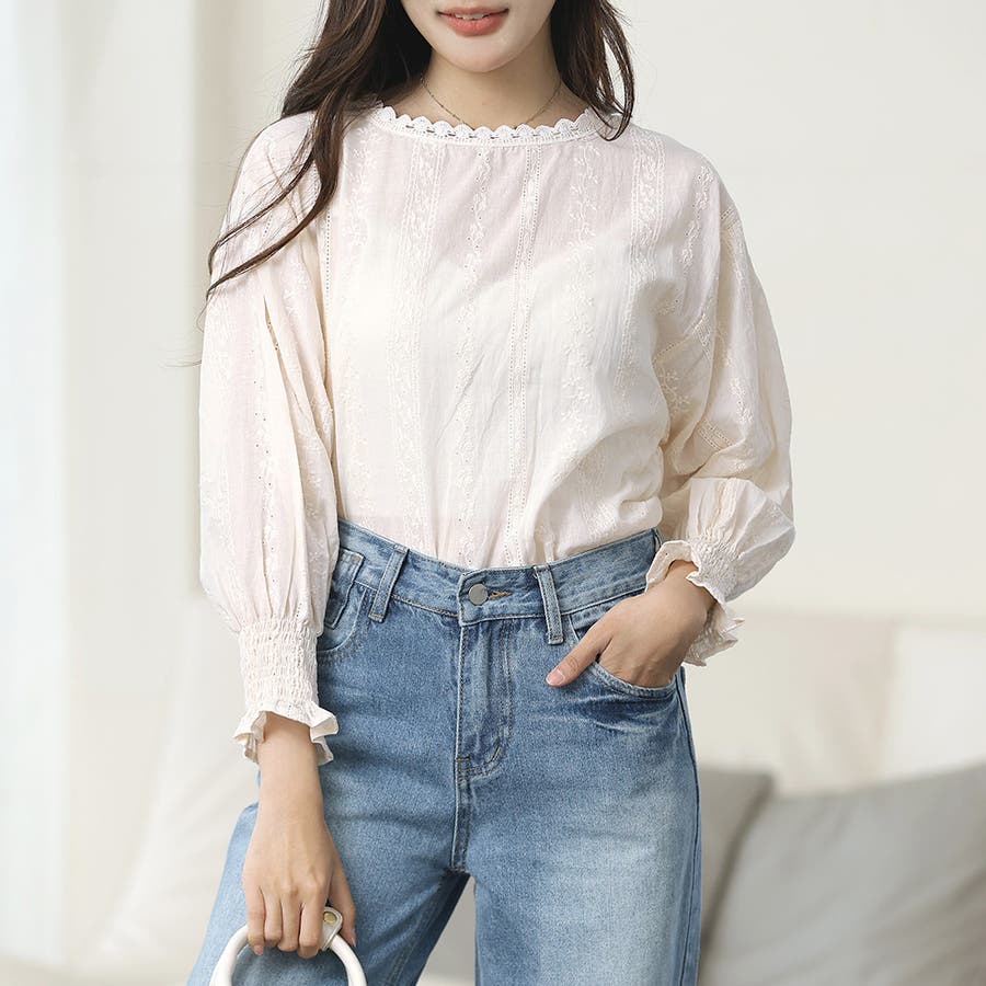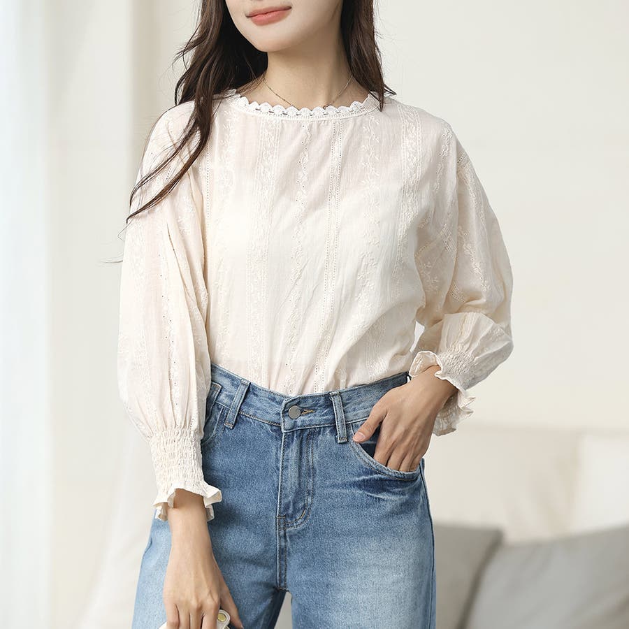・刺繍レースデザインの可愛いブラウス!ふんわりした袖で二の腕もさりげなくカバーできます!甘く可愛らしい雰囲気の1枚です♪