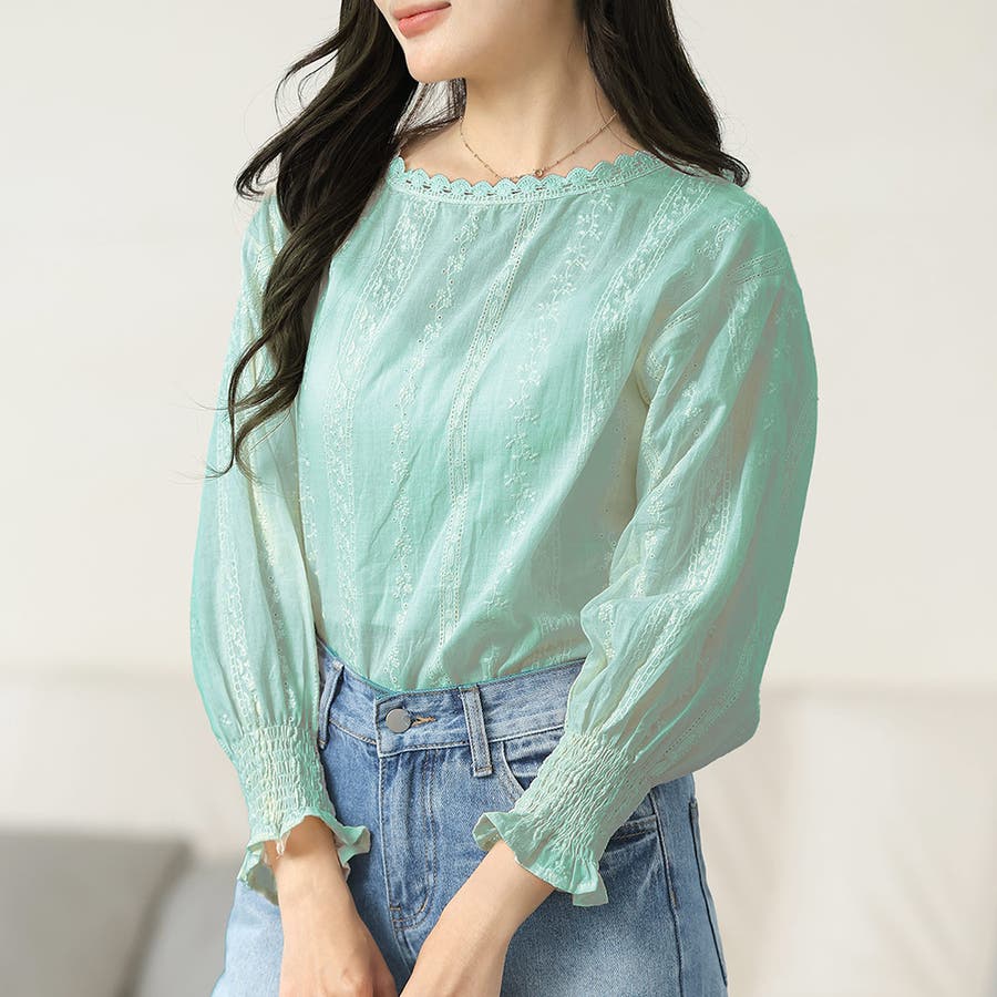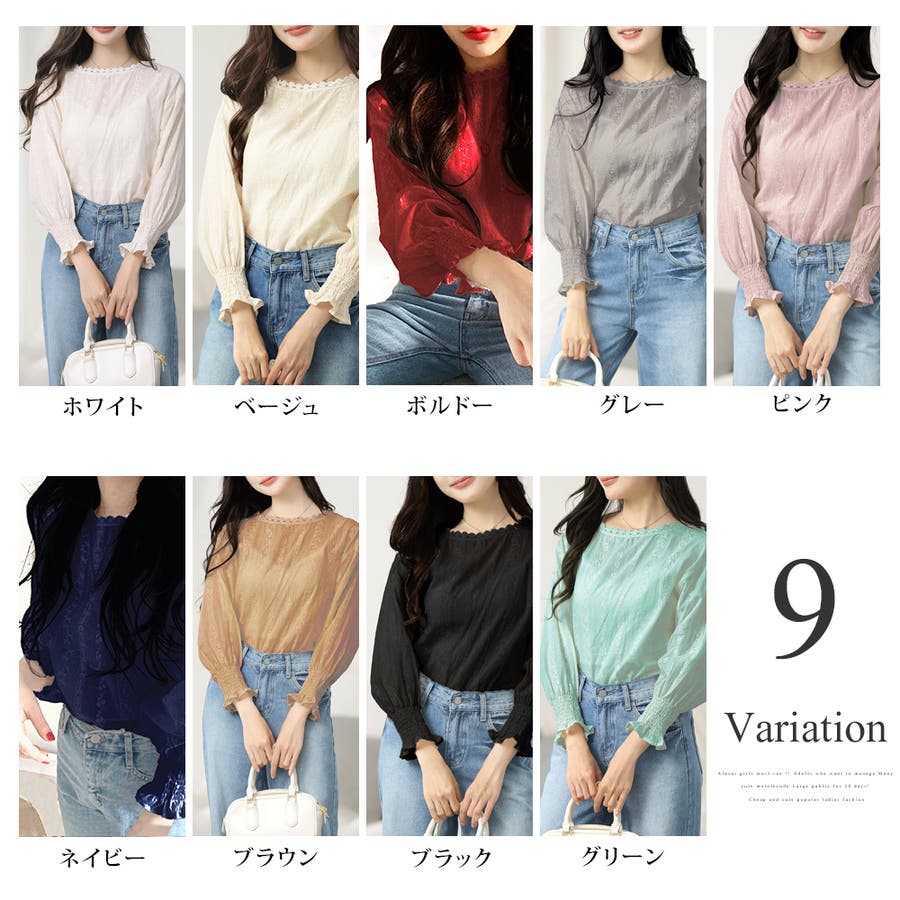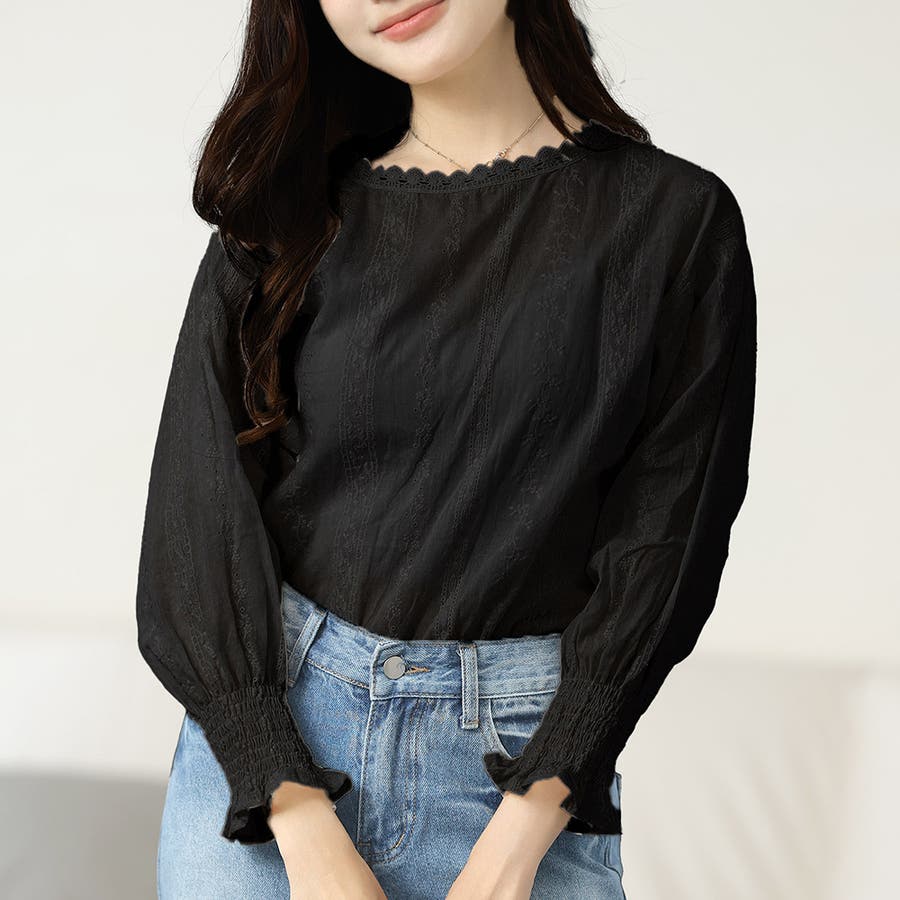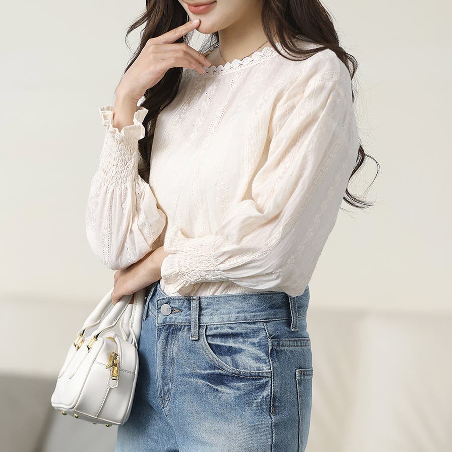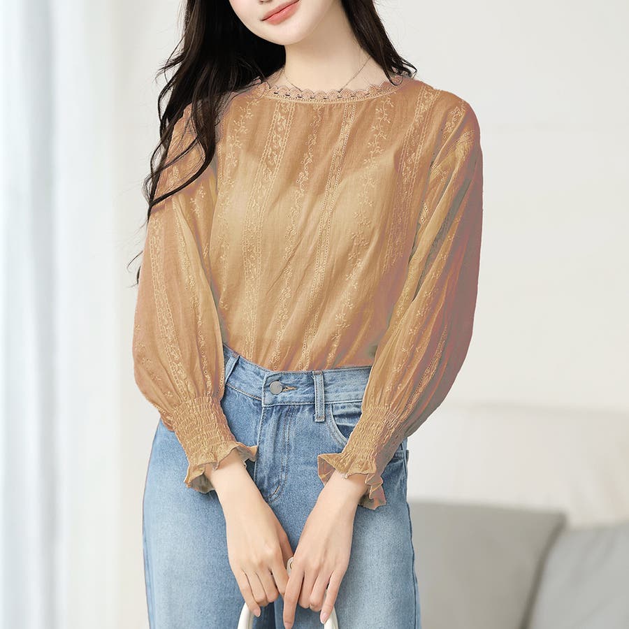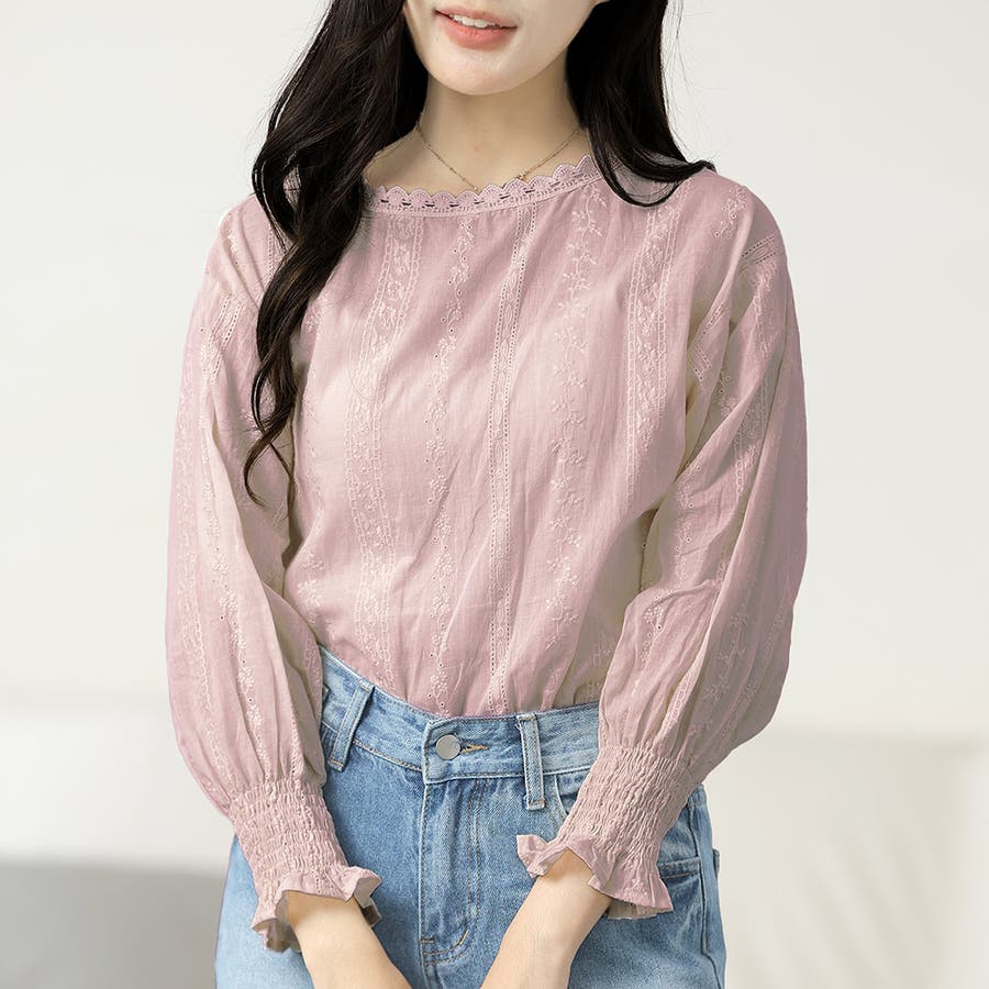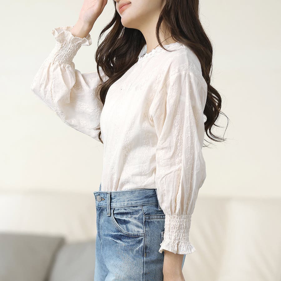 ・刺繍レースデザインの可愛いブラウス!ふんわりした袖で二の腕もさりげなくカバーできます!甘く可愛らしい雰囲気の1枚です♪