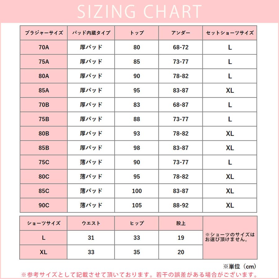 A80(厚パッド内臓)→アンダー:78-82cm トップ:90cm ショーツXL