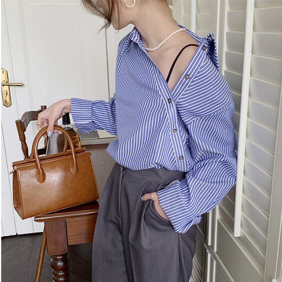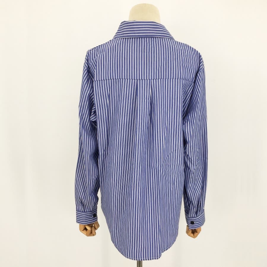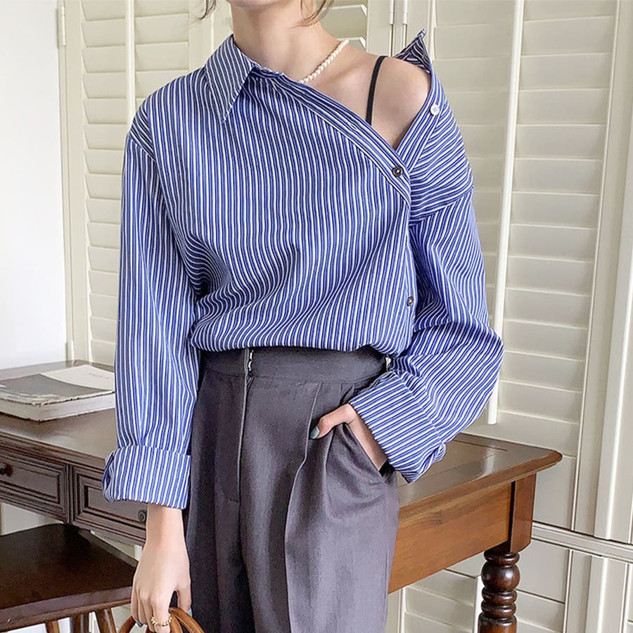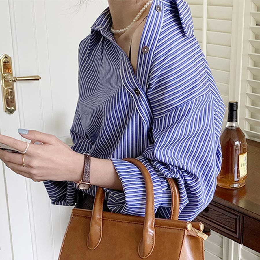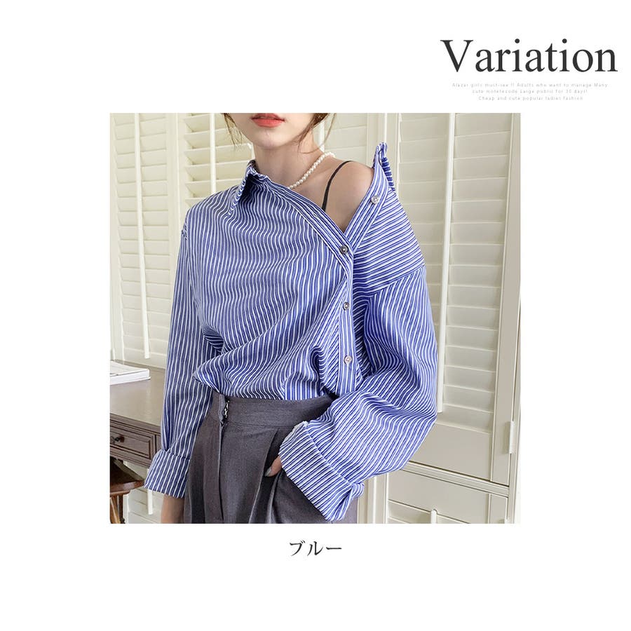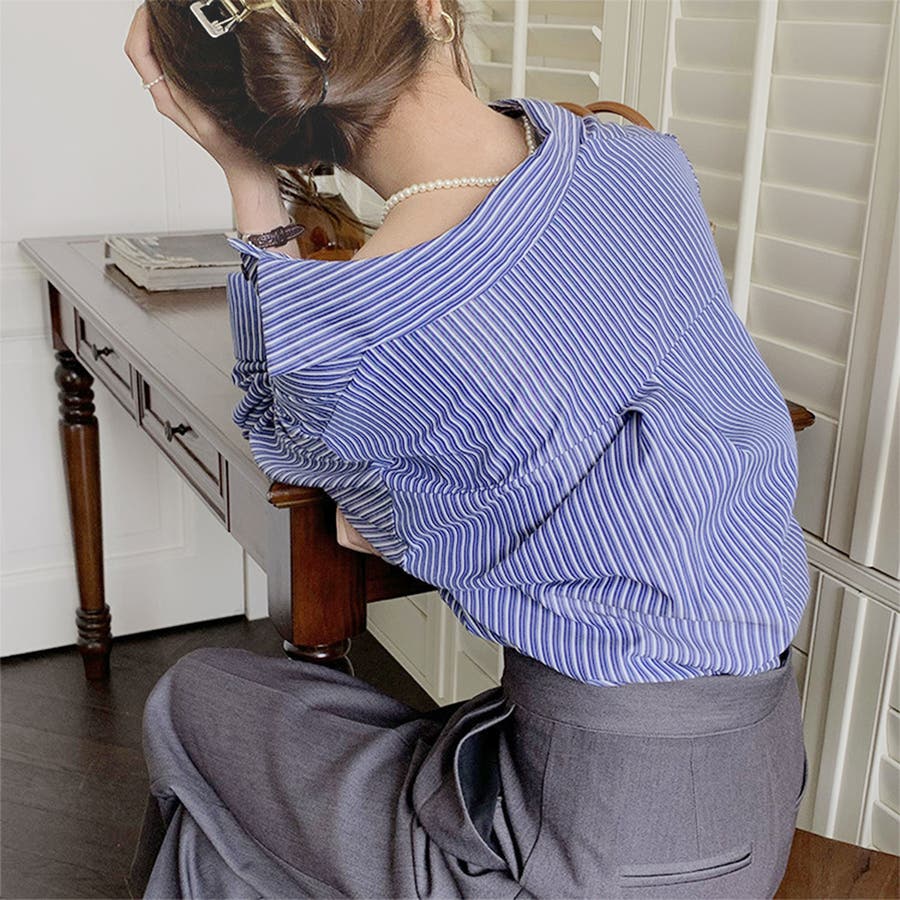 ・ブルーのストライプが爽やかな印象☆ゆったりシルエットで華奢見え効果も◎デザイン性のある個性的なブラウスです。