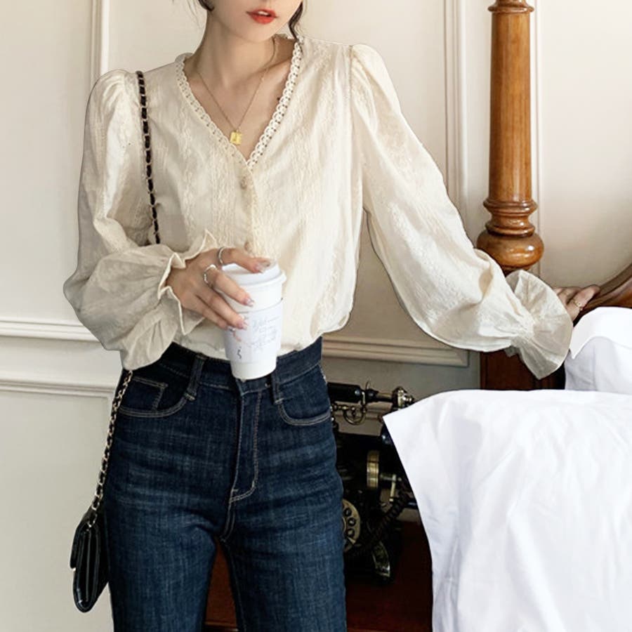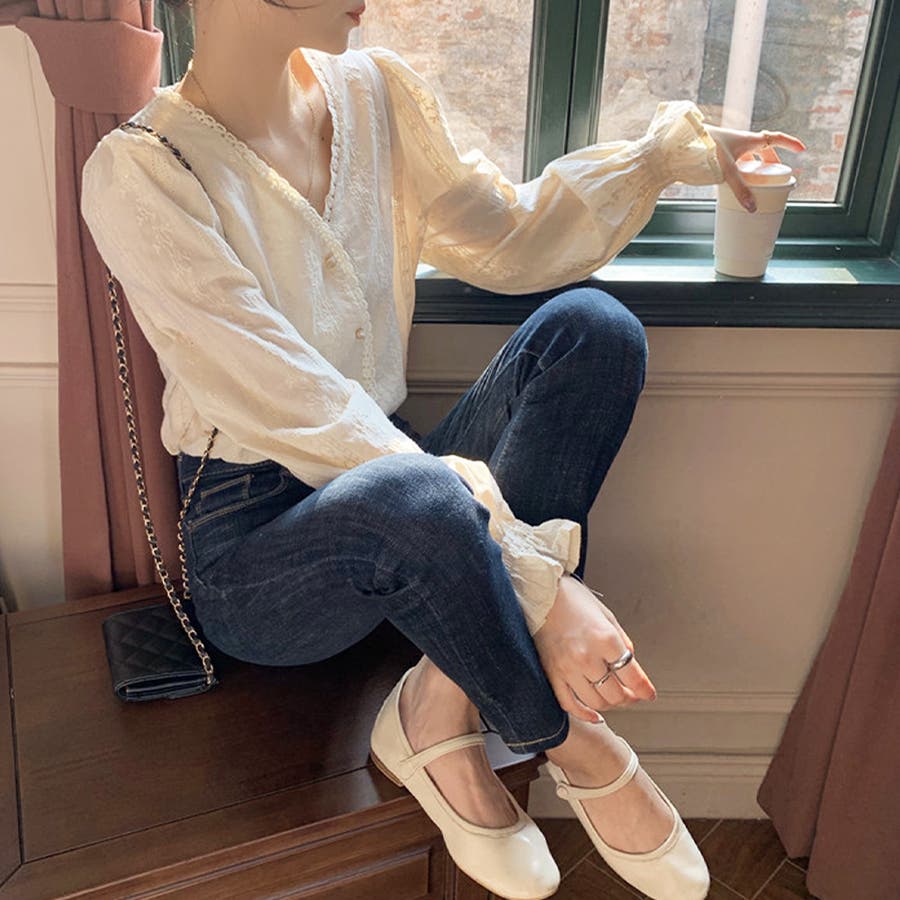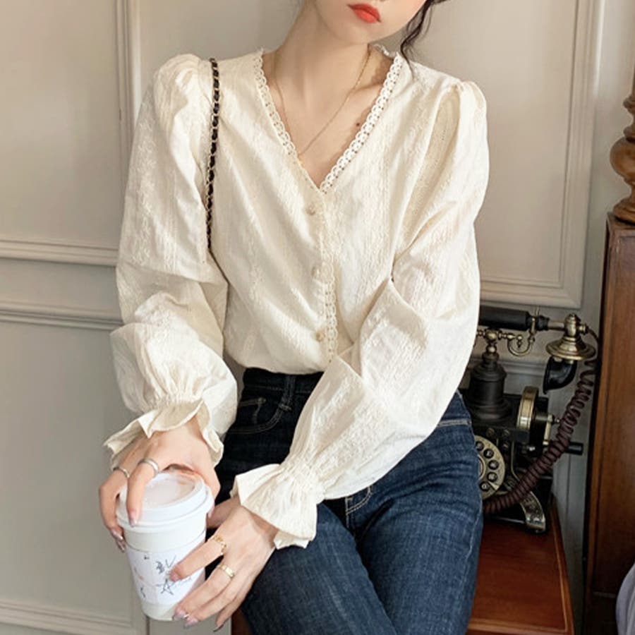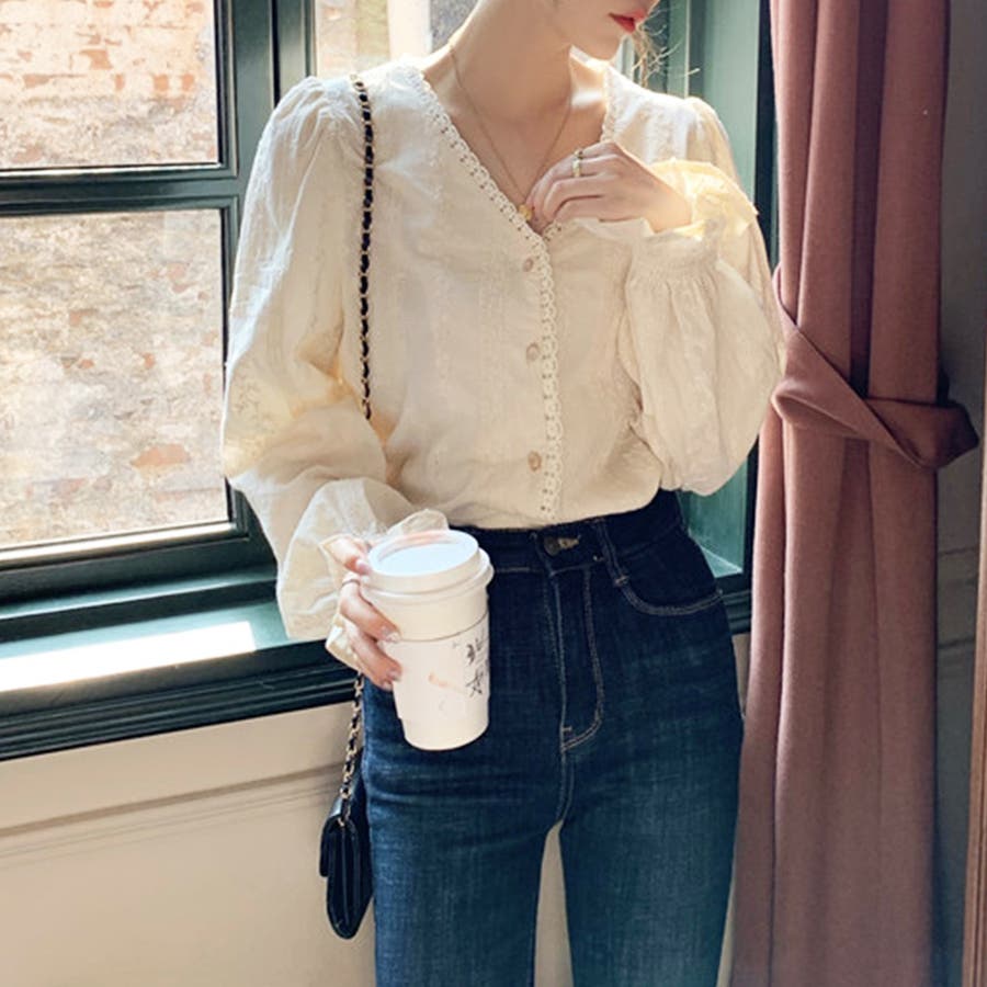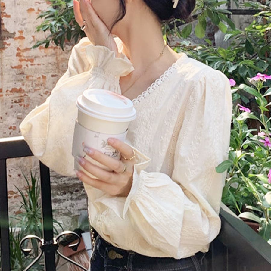 刺繍ブラウストップス 長袖 Vネック