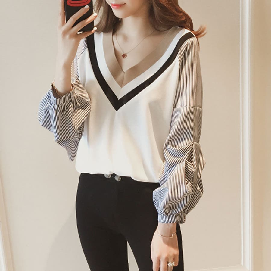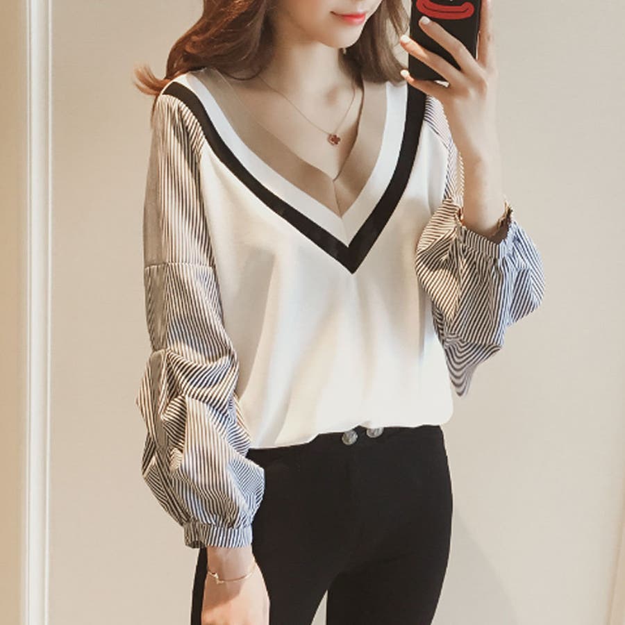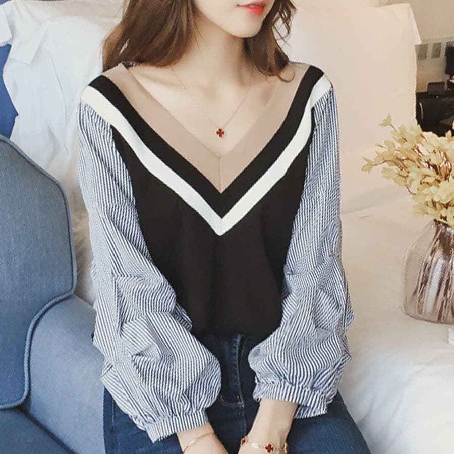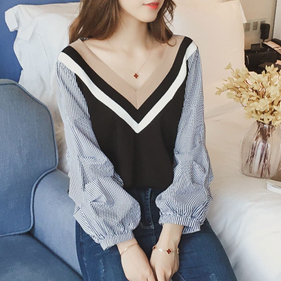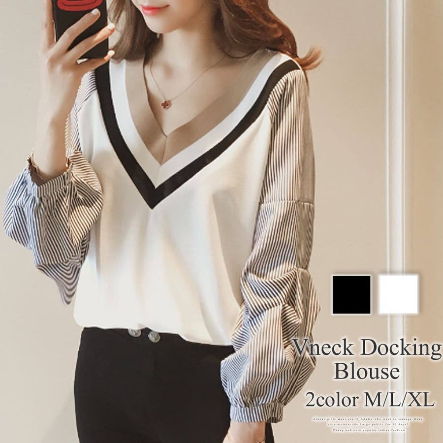 Vネックドッキングブラウス レディース 長袖