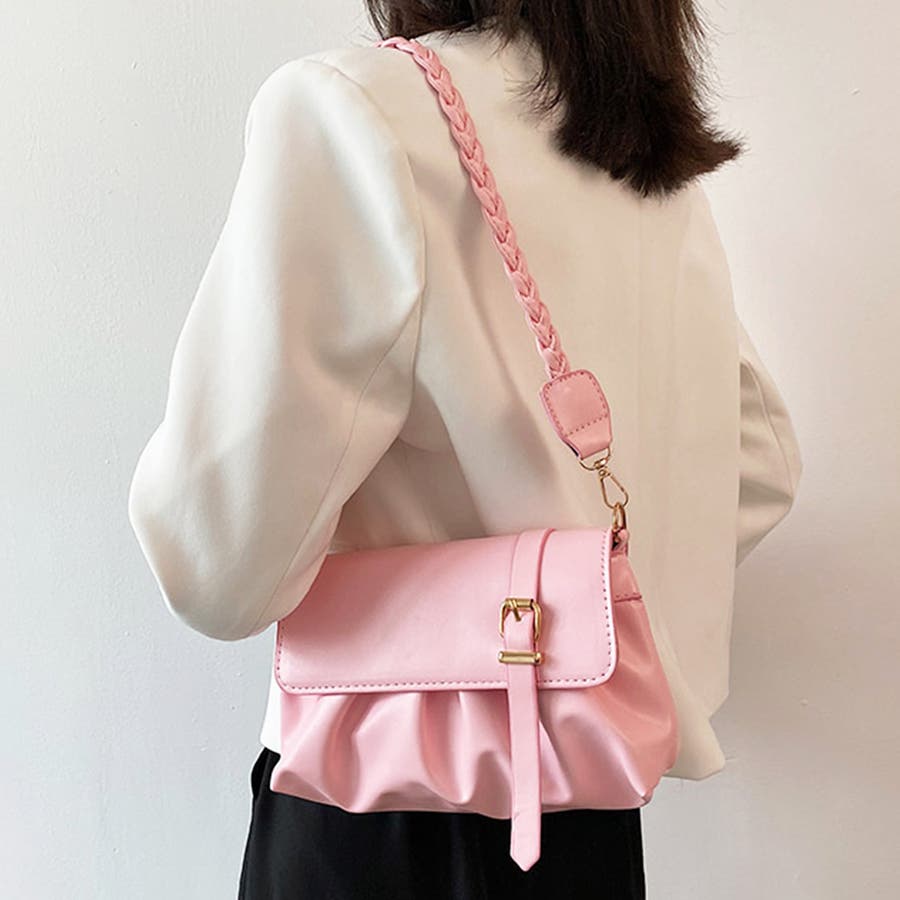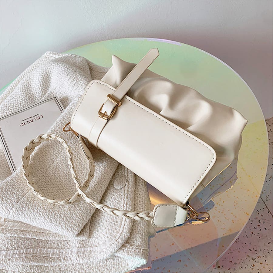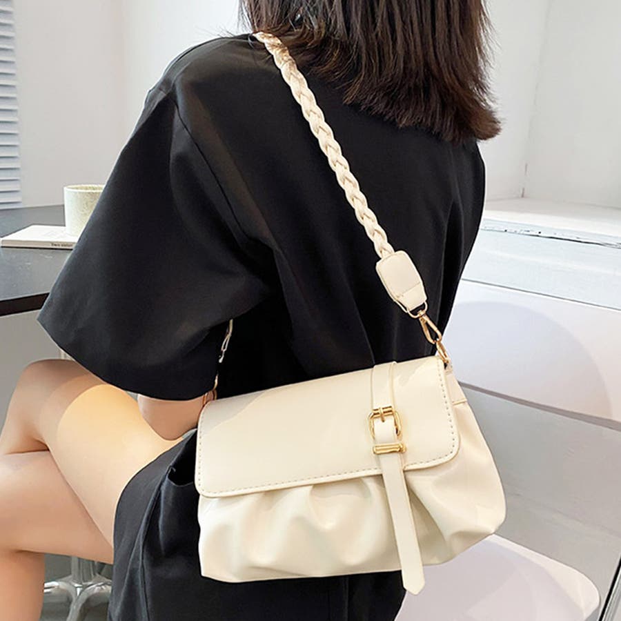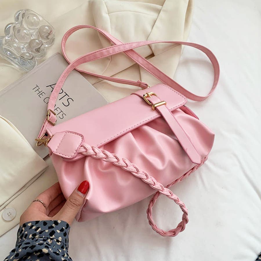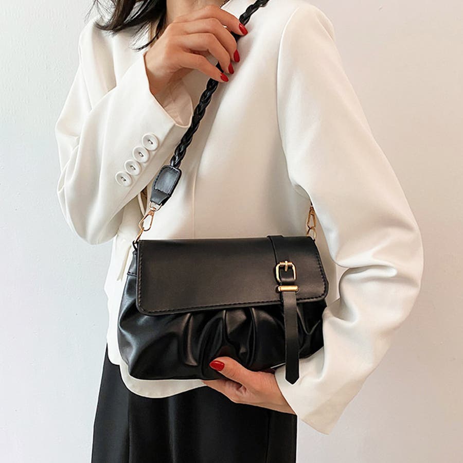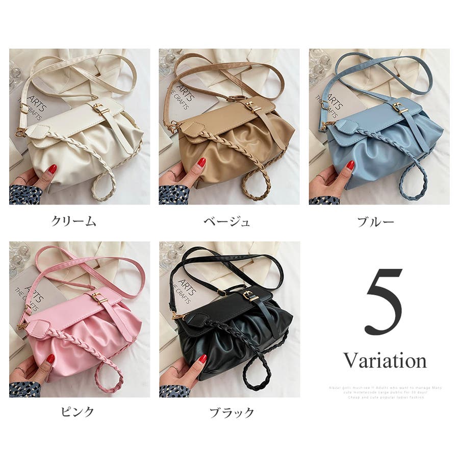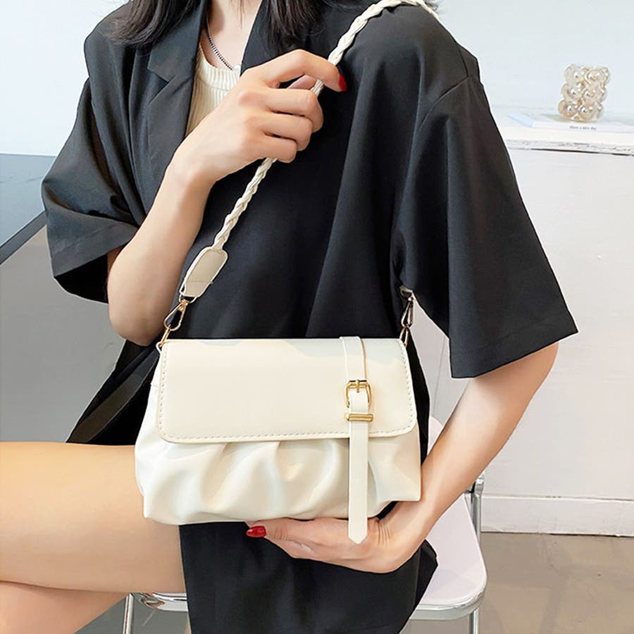 ・ミニマムなサイズ感が可愛らしい、ショルダー部分の三つ編みが特徴のハンドバッグ。