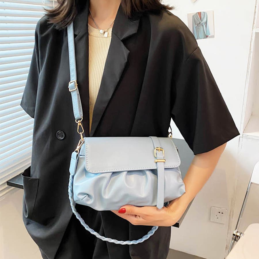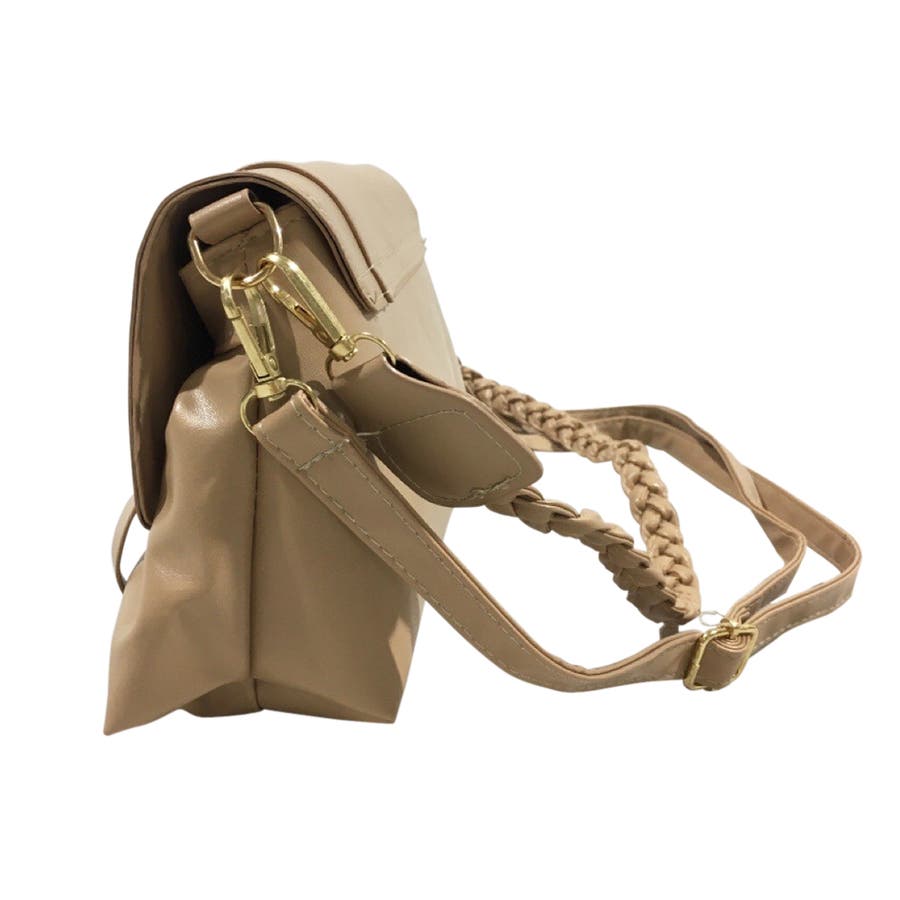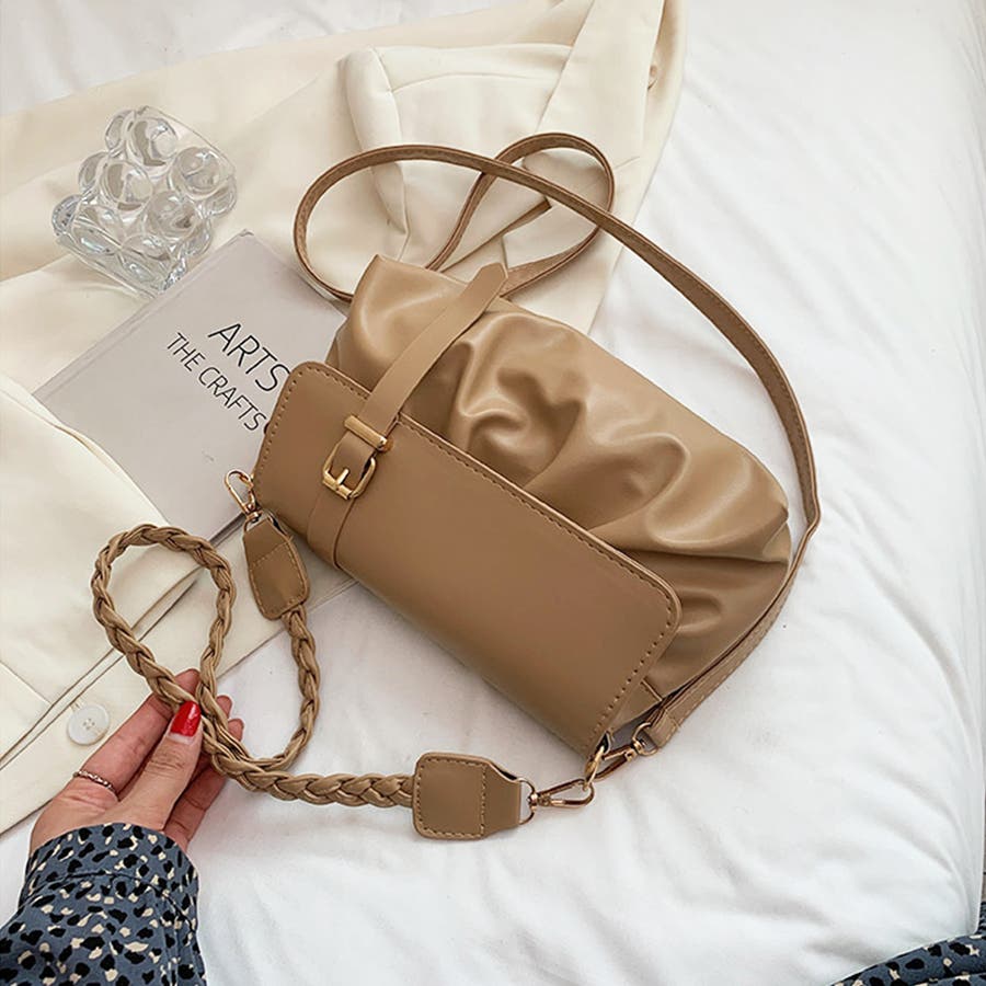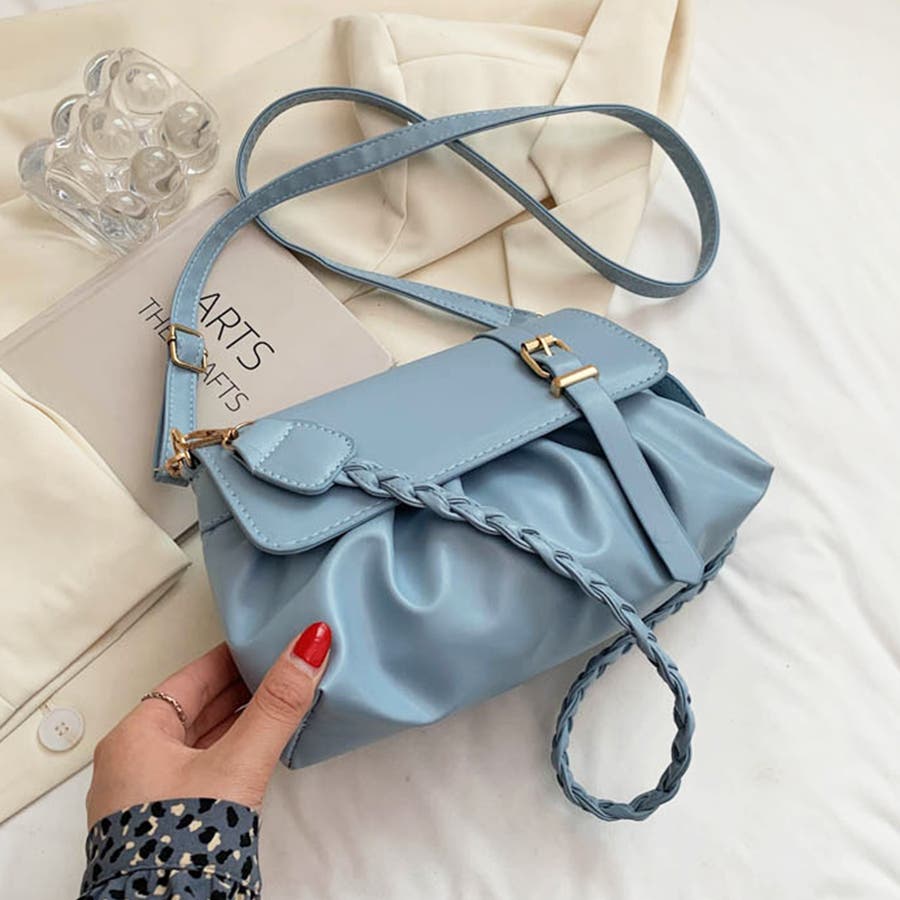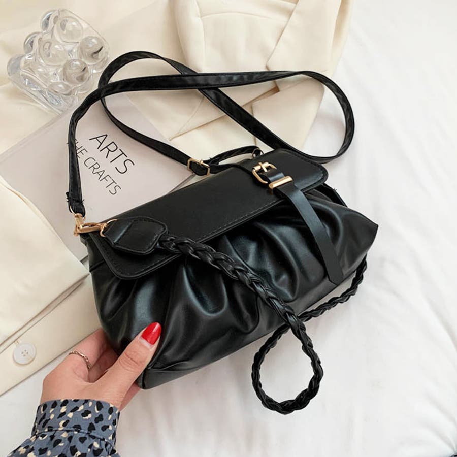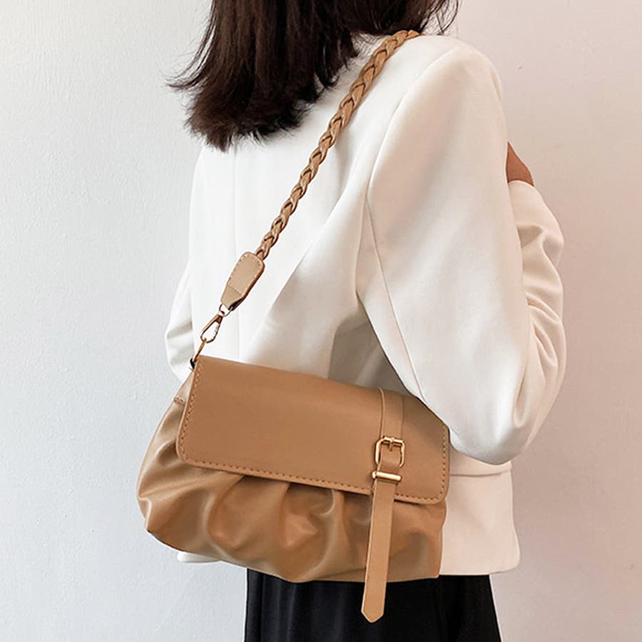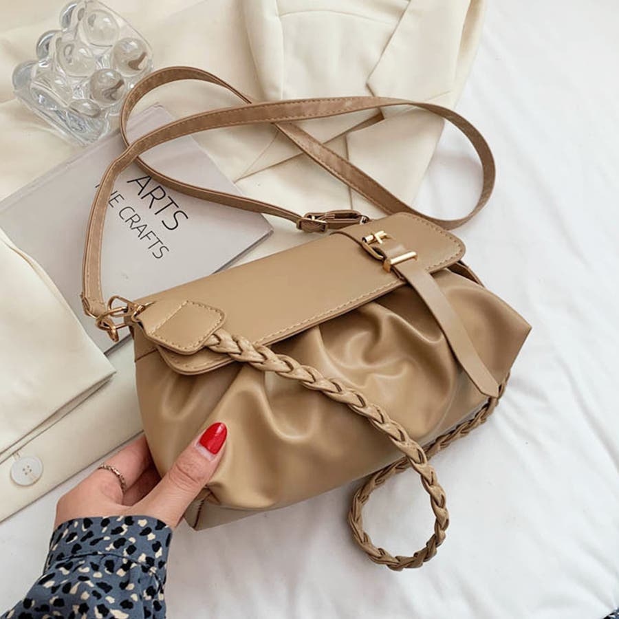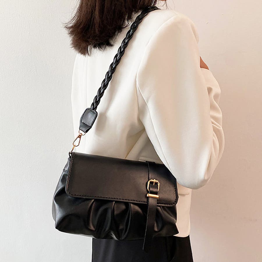 ・ミニマムなサイズ感が可愛らしい、ショルダー部分の三つ編みが特徴のハンドバッグ。