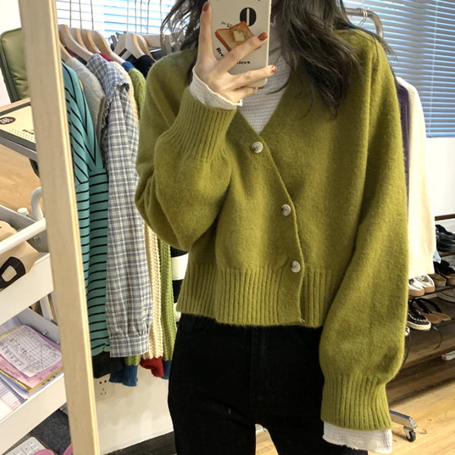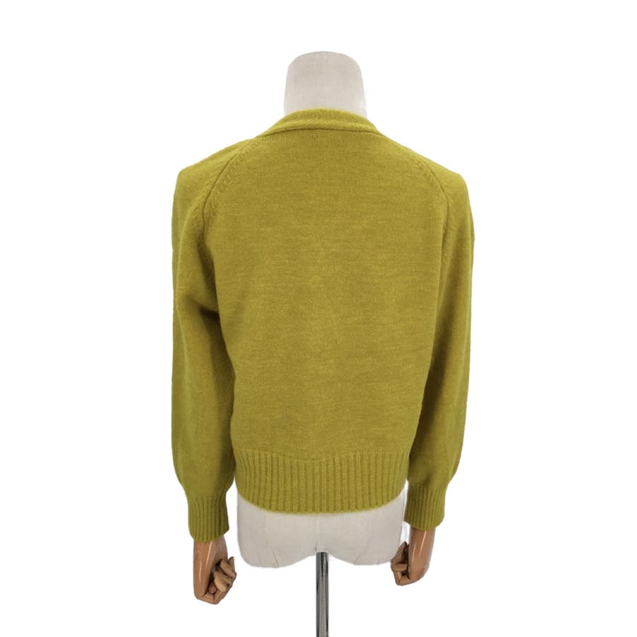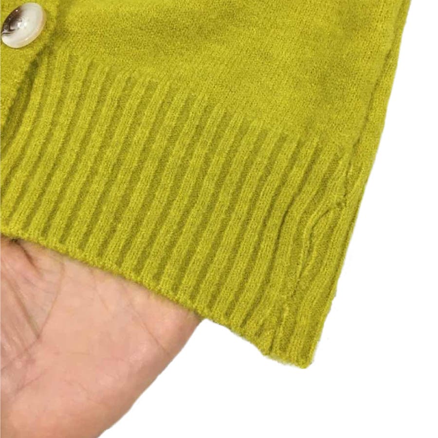 最後の方の画像まで見ておらず、抹茶系の黄緑かと思っていましたが、実際は黄色寄りの黄緑という感じの色でした。これはこれで可愛いのですが、派手と感じる人もいるかも。モデルさんだとゆるっとしているように見えますが、結構ぴったりしているので私と同じくぽっちゃりしている方や、痩せていても胸が大きい方はピチッとしてしまうと思います。丈は低身長の私でもちゃんとショート丈と感じるくらいの長さ。生地はふわふわではなくもちもちした感じで温かいです。デザインは可愛いですがサイズ感だけ惜しい…(泣)