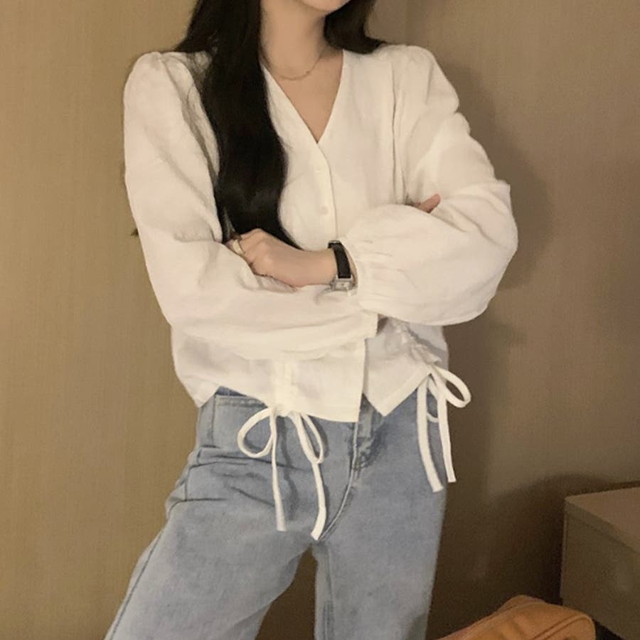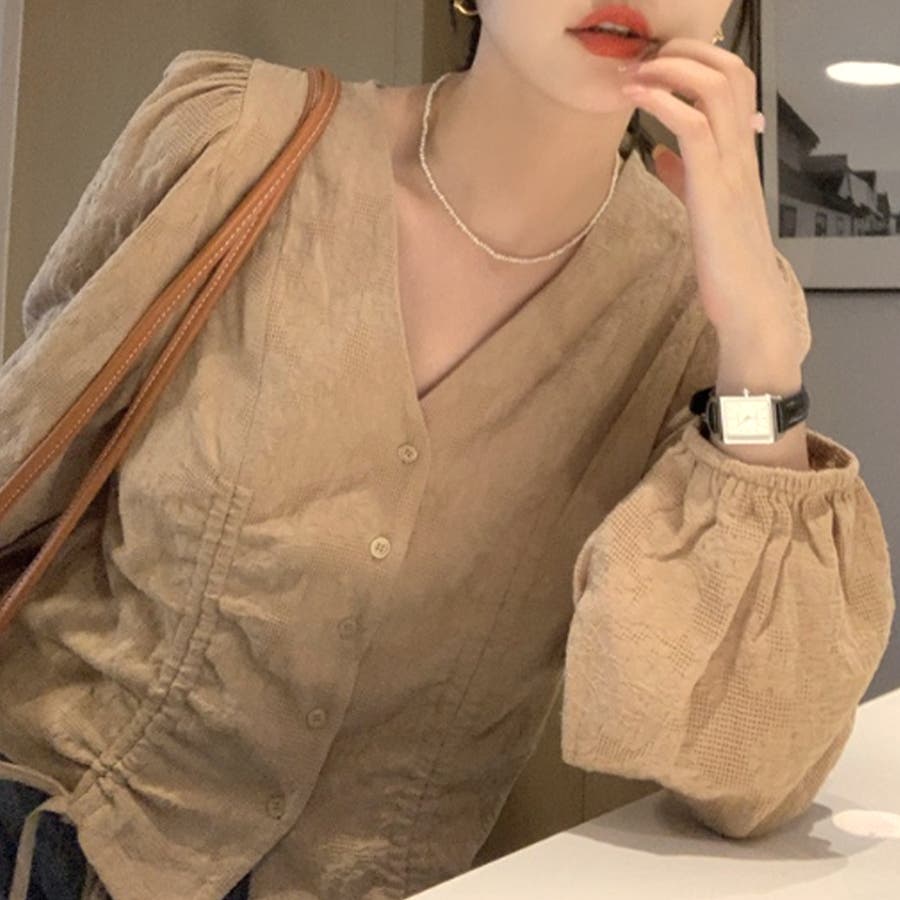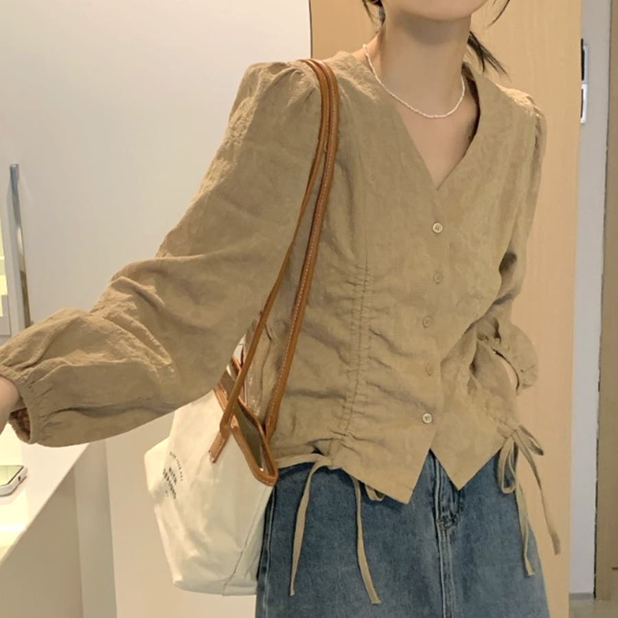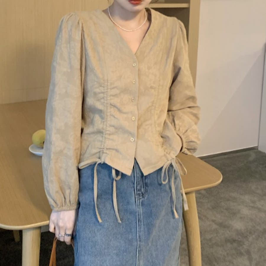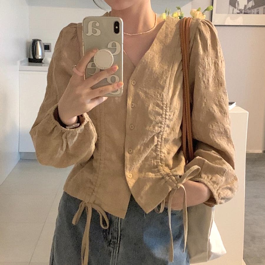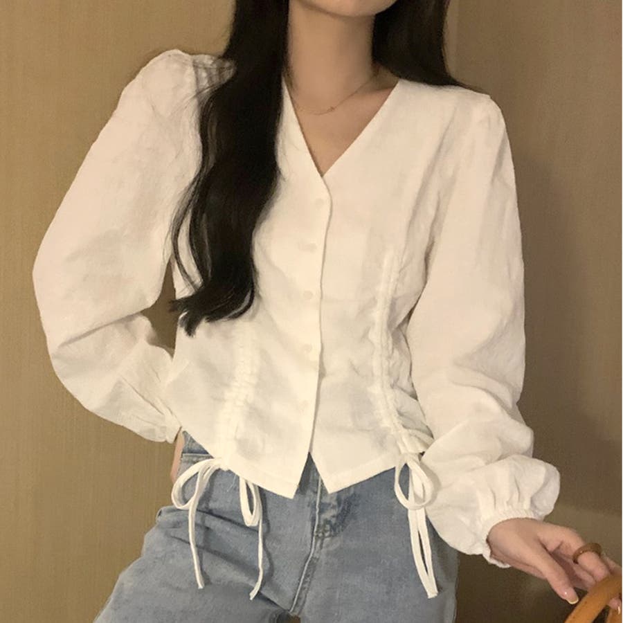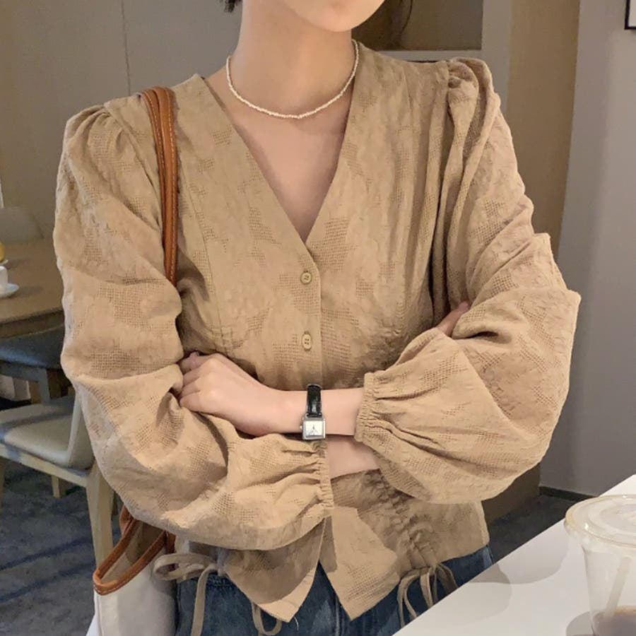 ・首まわりがスッキリ見えるVネック♪小顔効果も期待できるブラウスです。