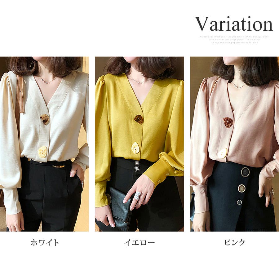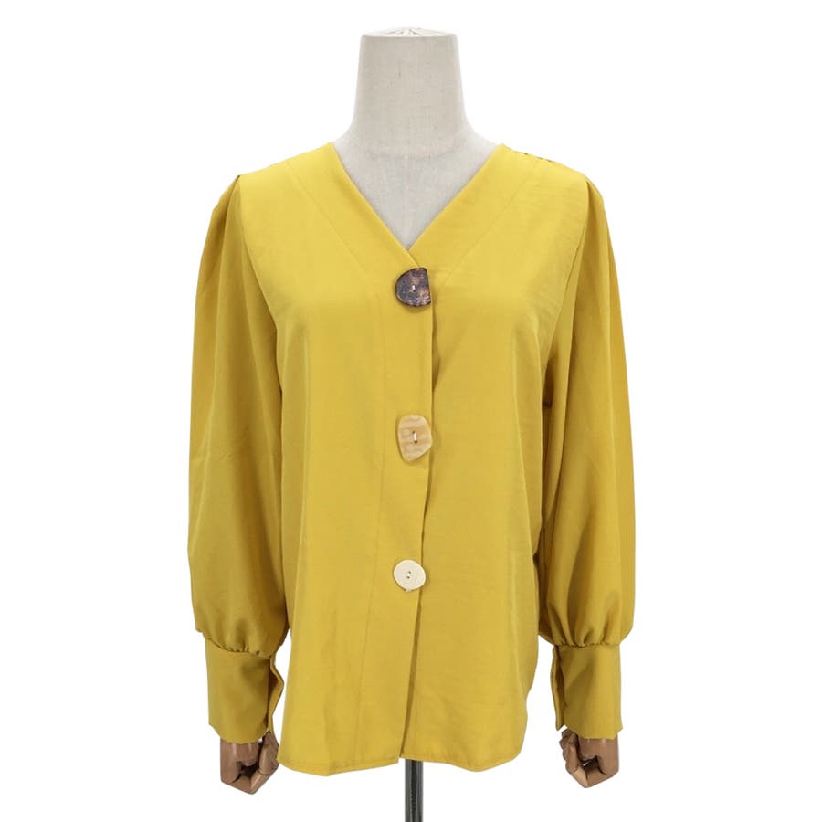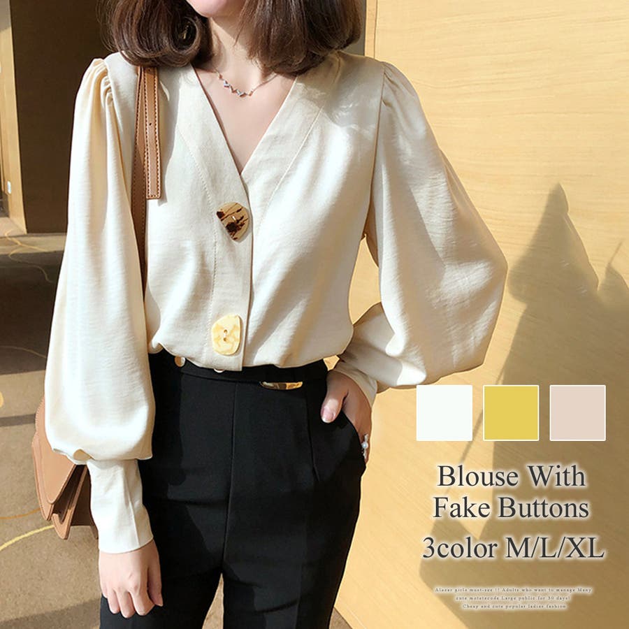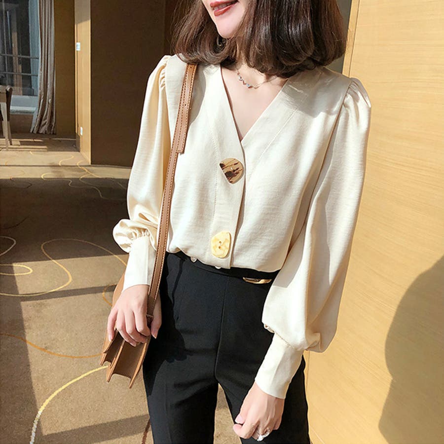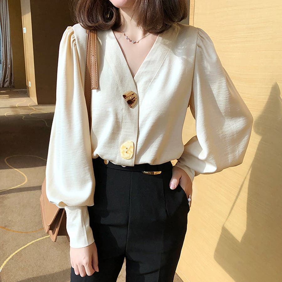 ・大人女子のこなれ感溢れるブラウス。ゆるやかなビショップスリーブと種類の違うボタンがアクセント!