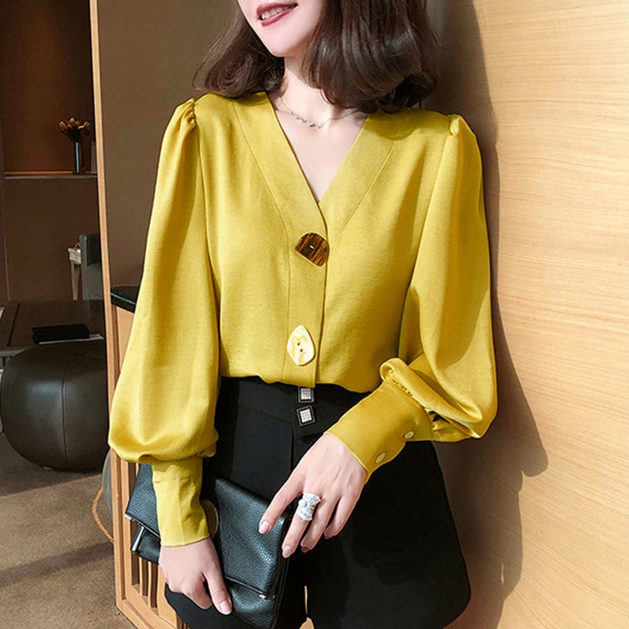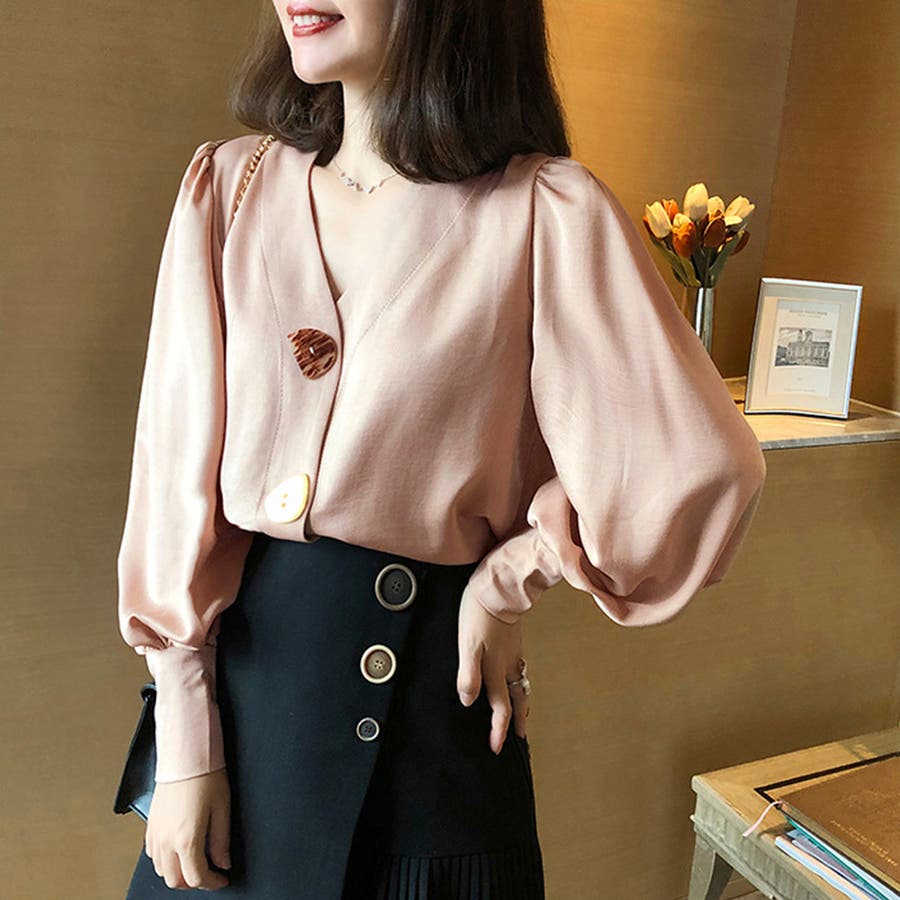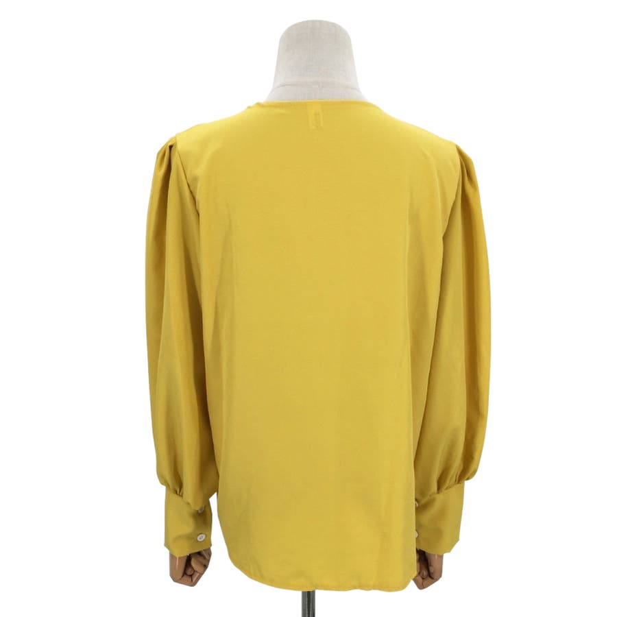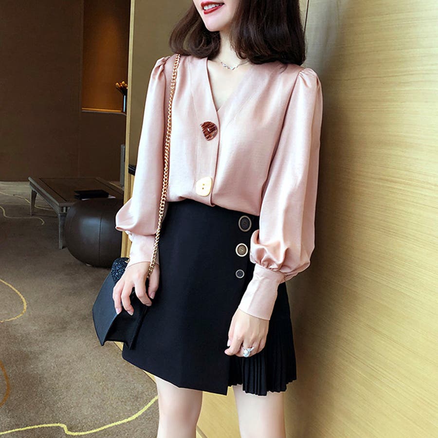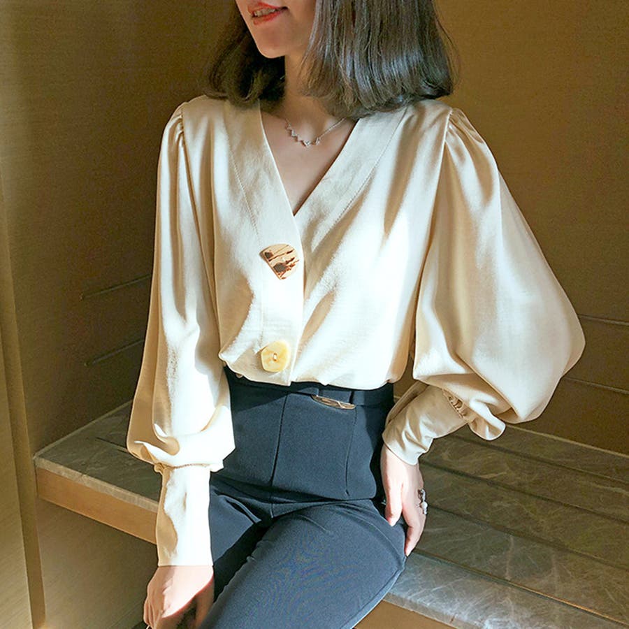・大人女子のこなれ感溢れるブラウス。ゆるやかなビショップスリーブと種類の違うボタンがアクセント!