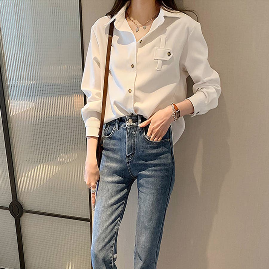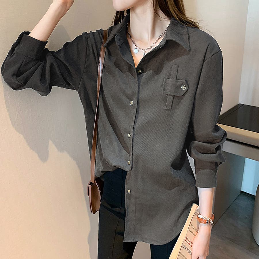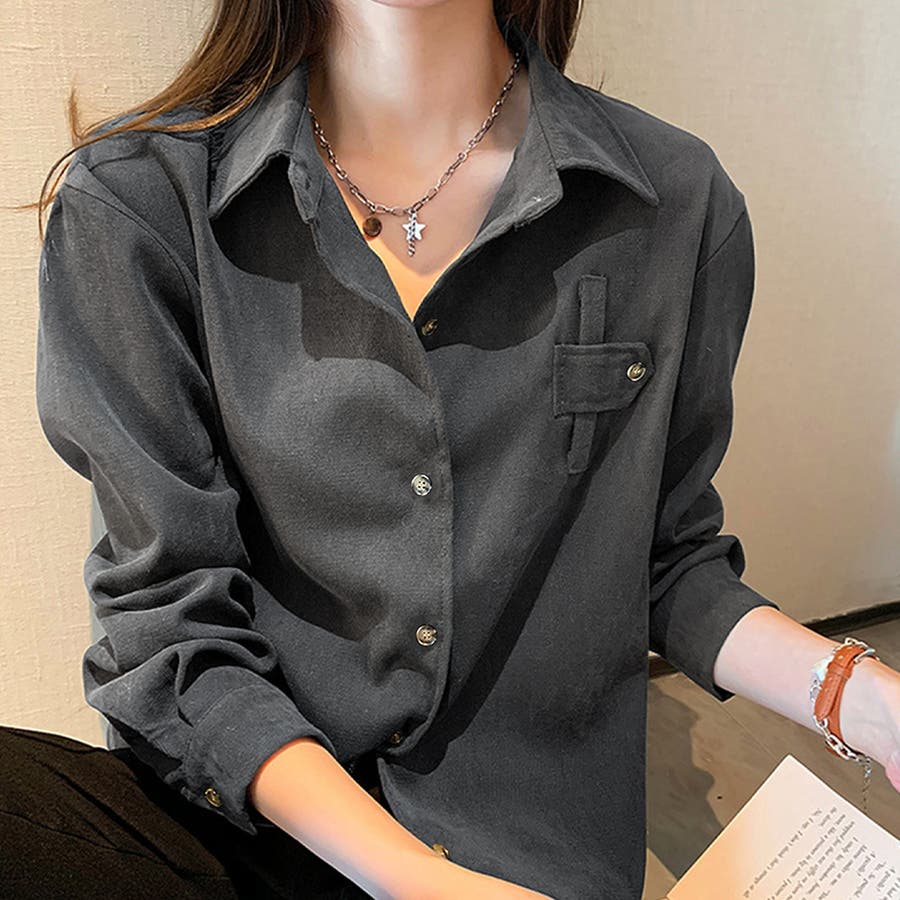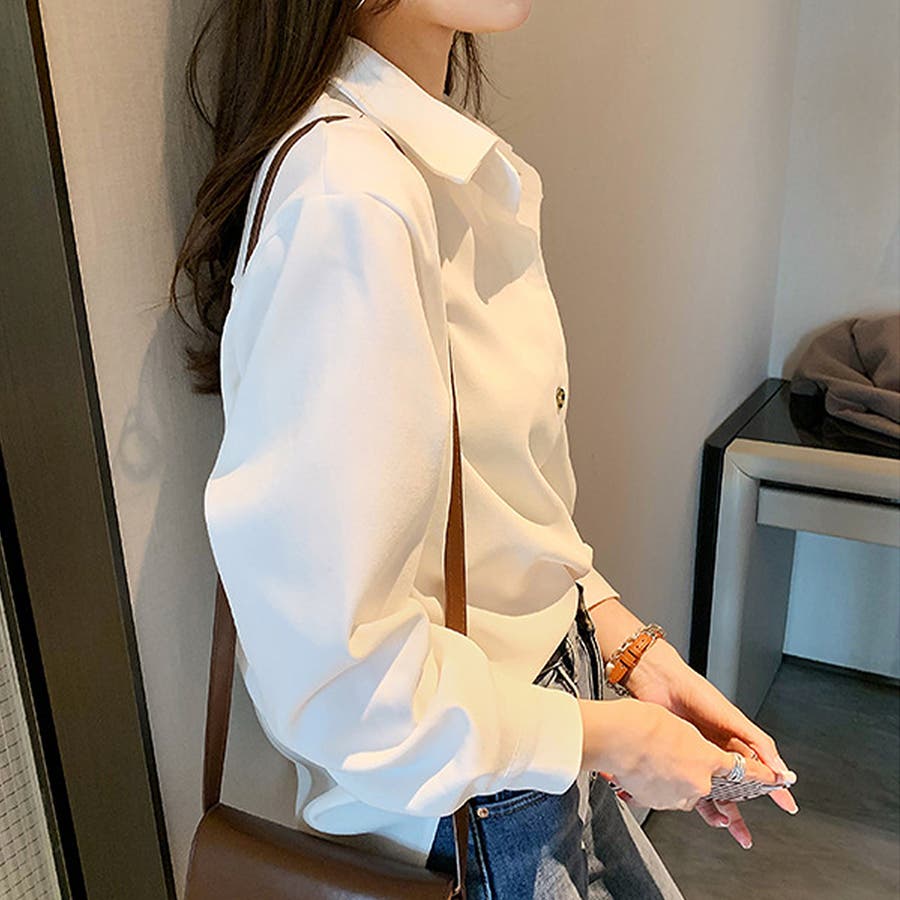 ・シンプルなシャツにポイントとなる胸元のデザイン。一枚でも着られる着こなしが楽ちんなシャツ♪