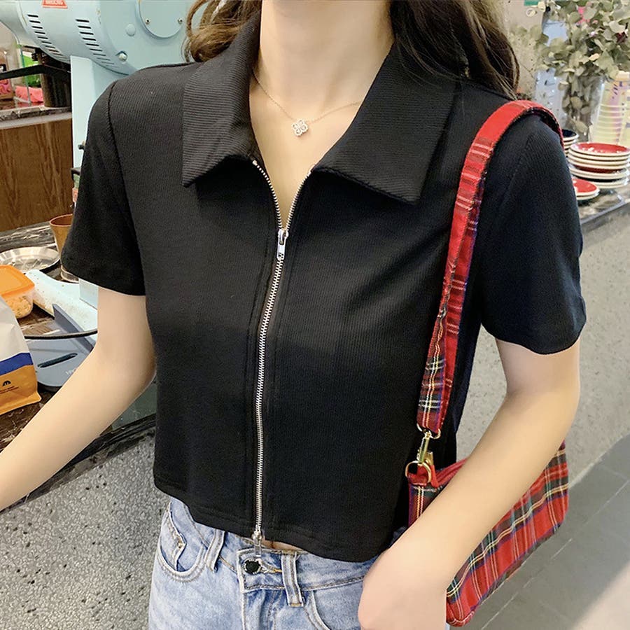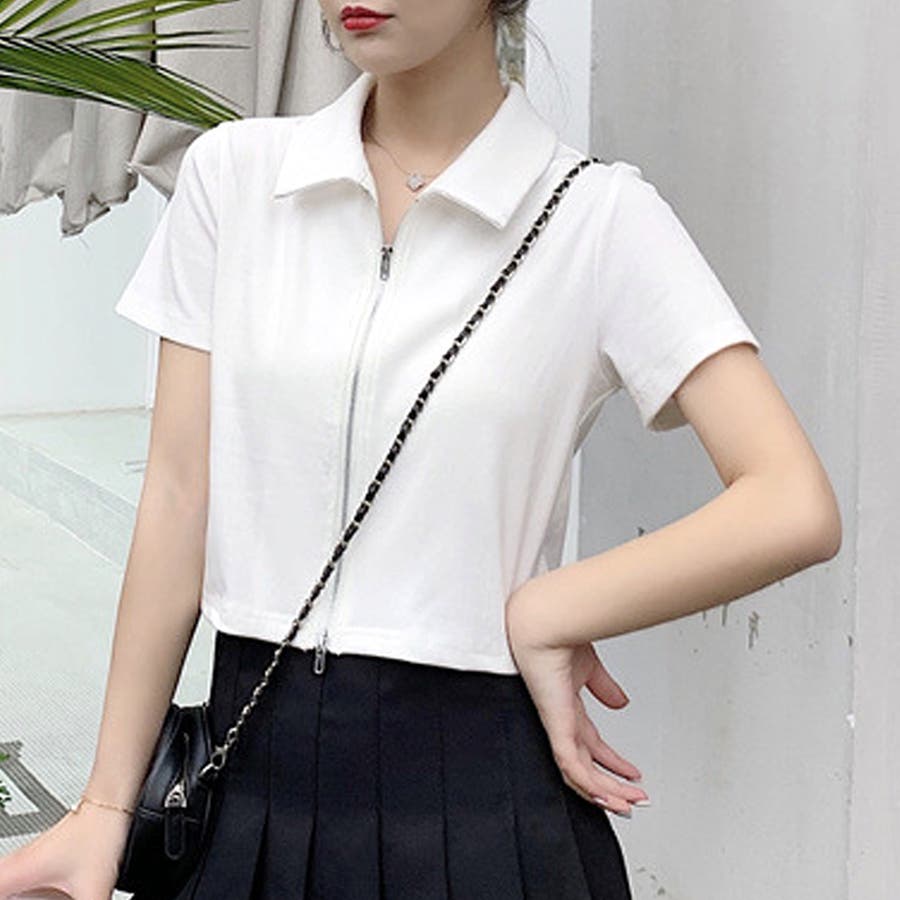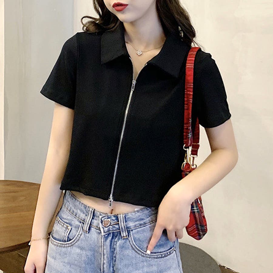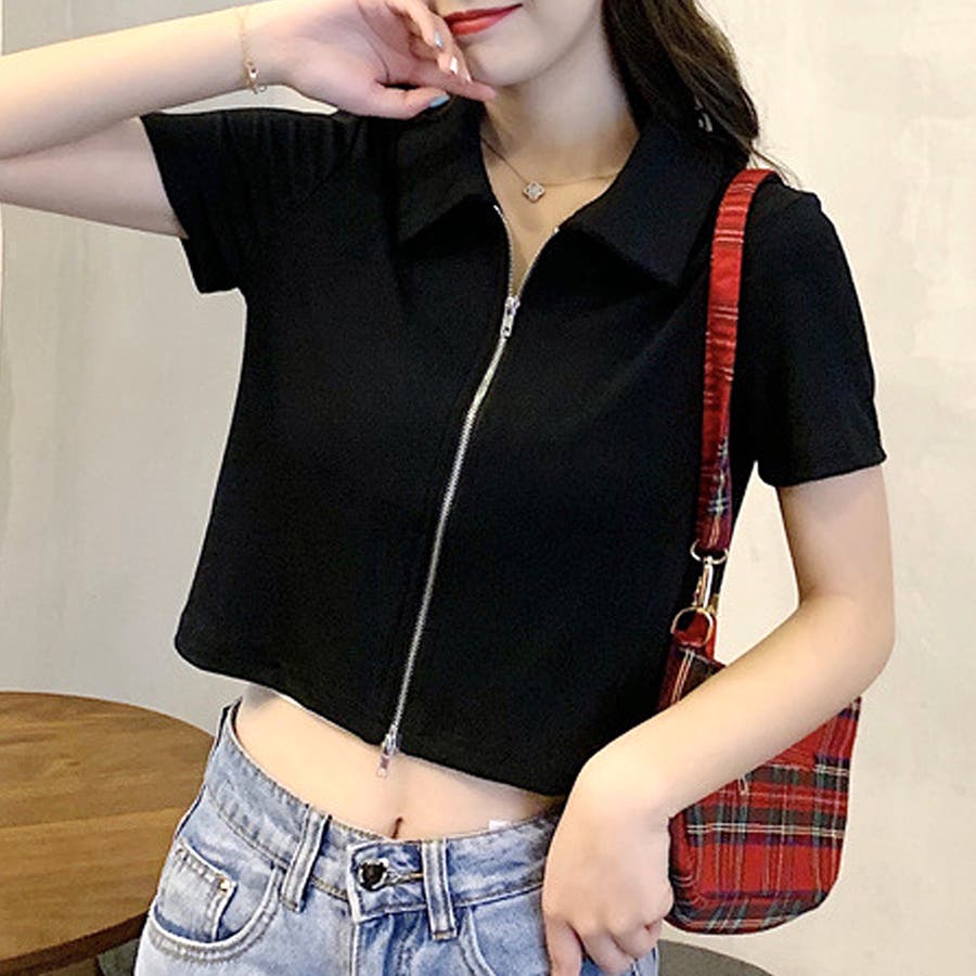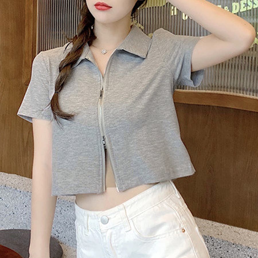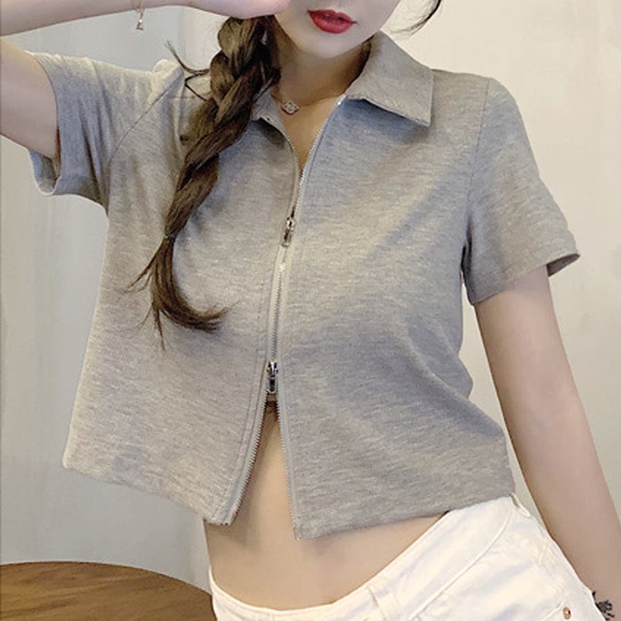 ・フロントのダブルジッパーがおしゃれな半袖トップスは、ショート丈で旬な雰囲気を演出♪