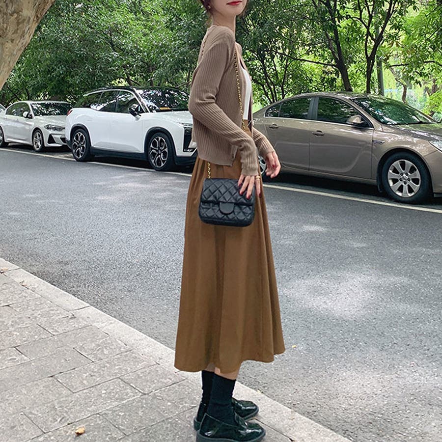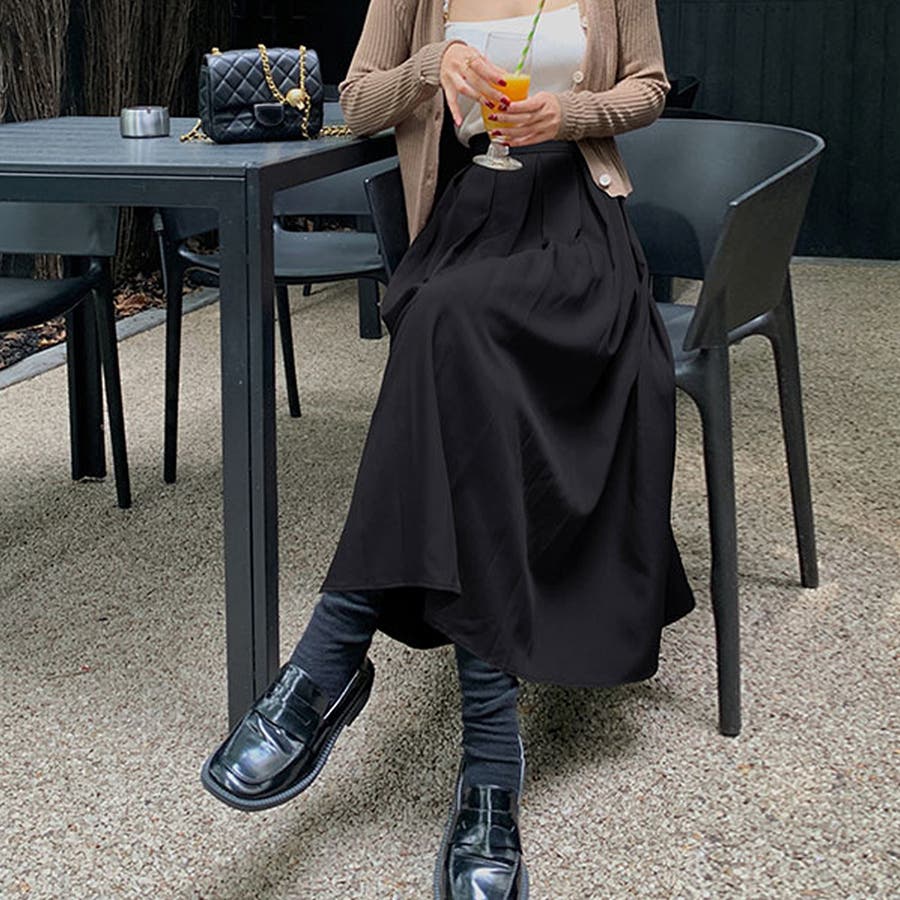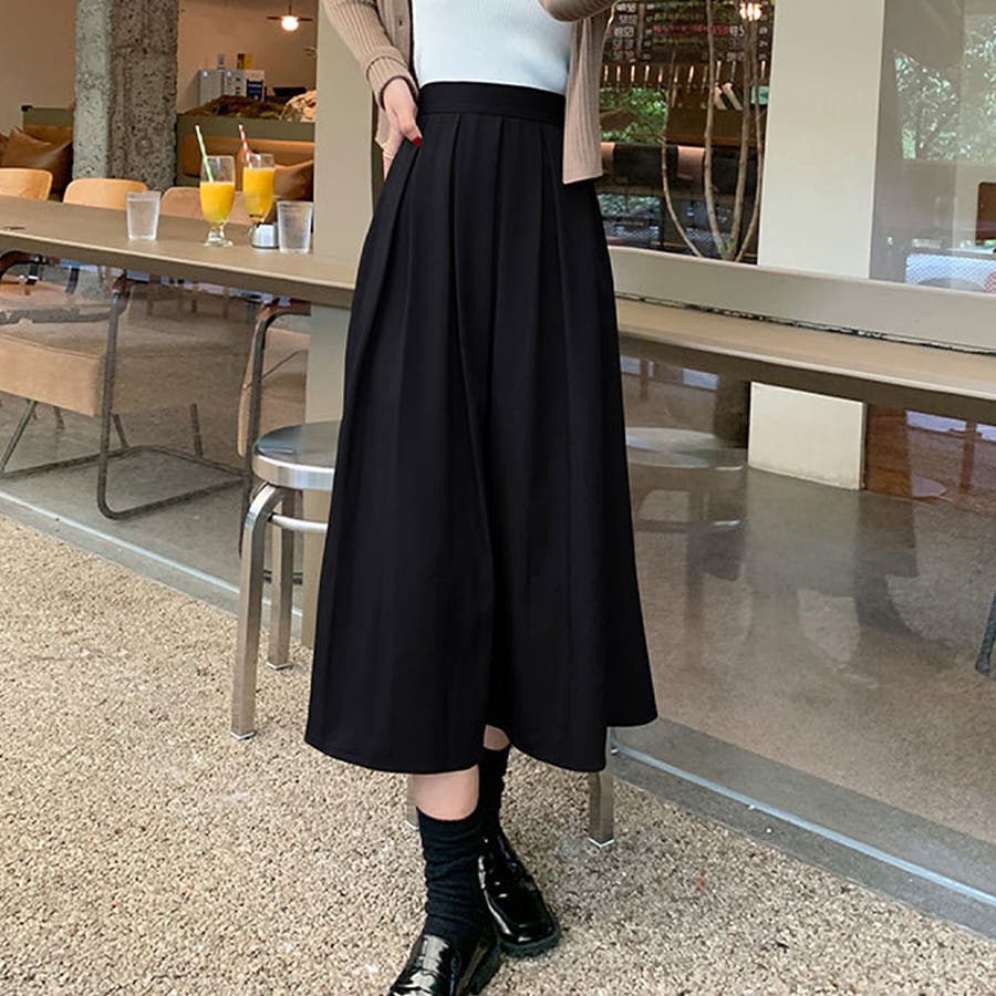 ・存在感のあるシルエットのスカート。長めの丈感。足元にかけてボリュームがあることで、脚長効果も狙える!