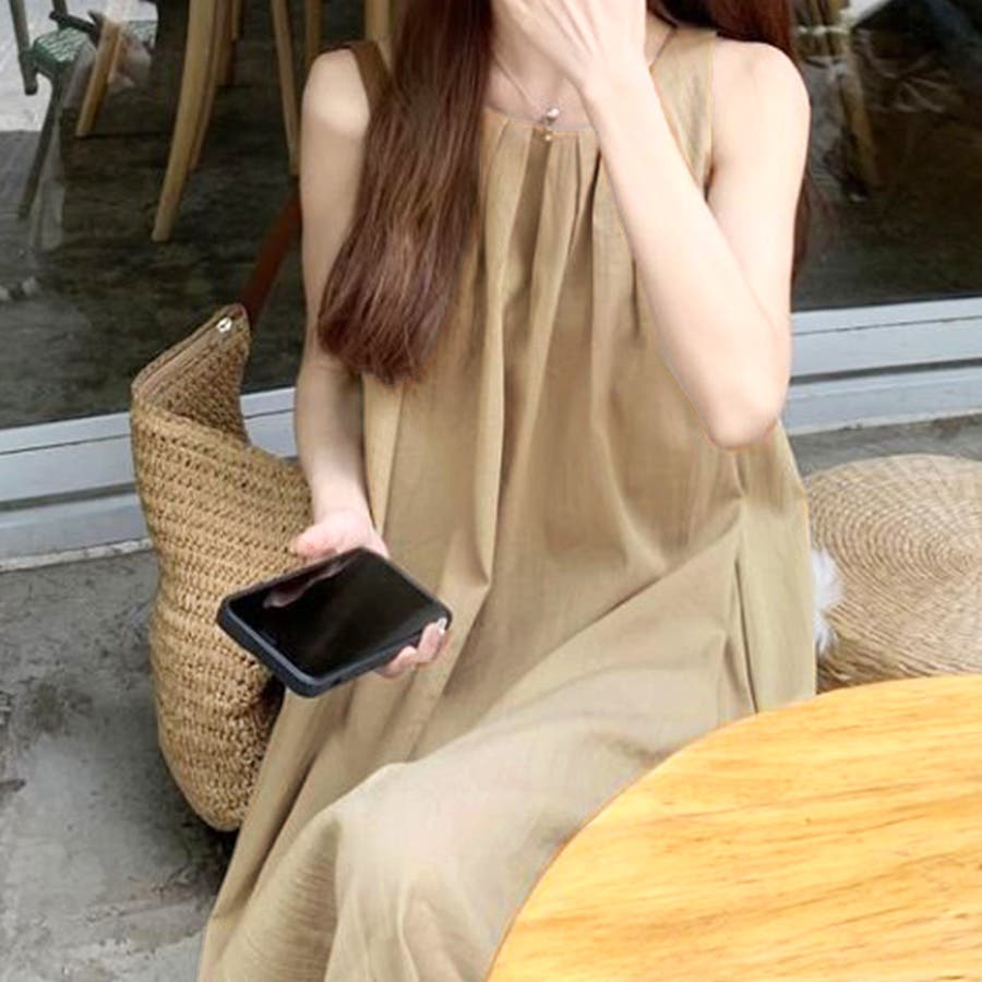 ・シンプルな台形シルエットが綺麗なノースリーブワンピース