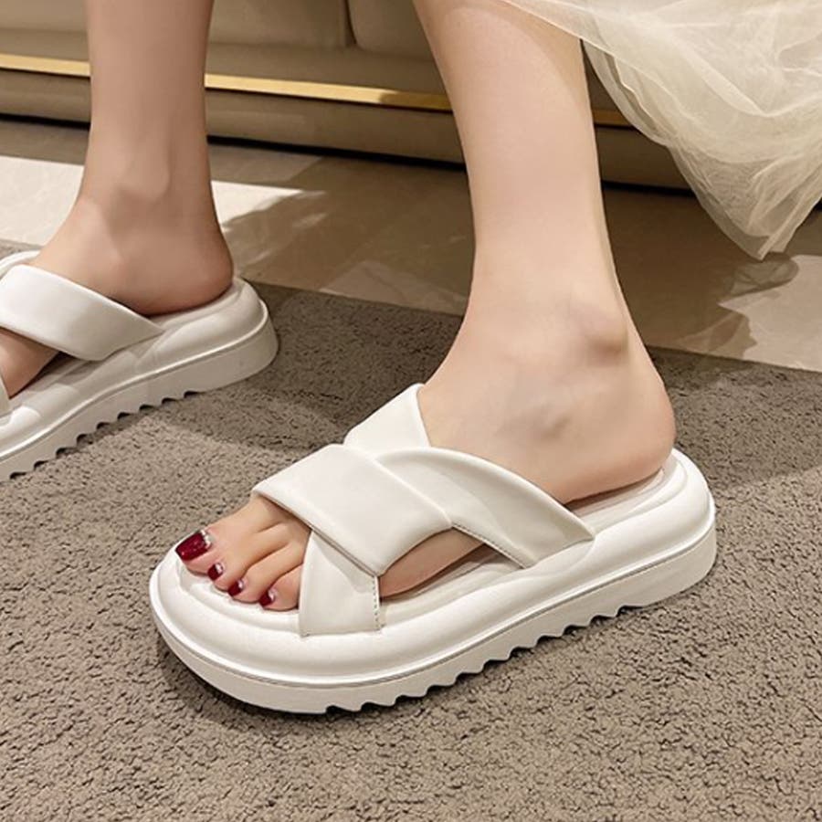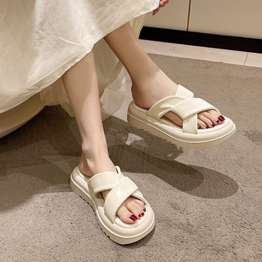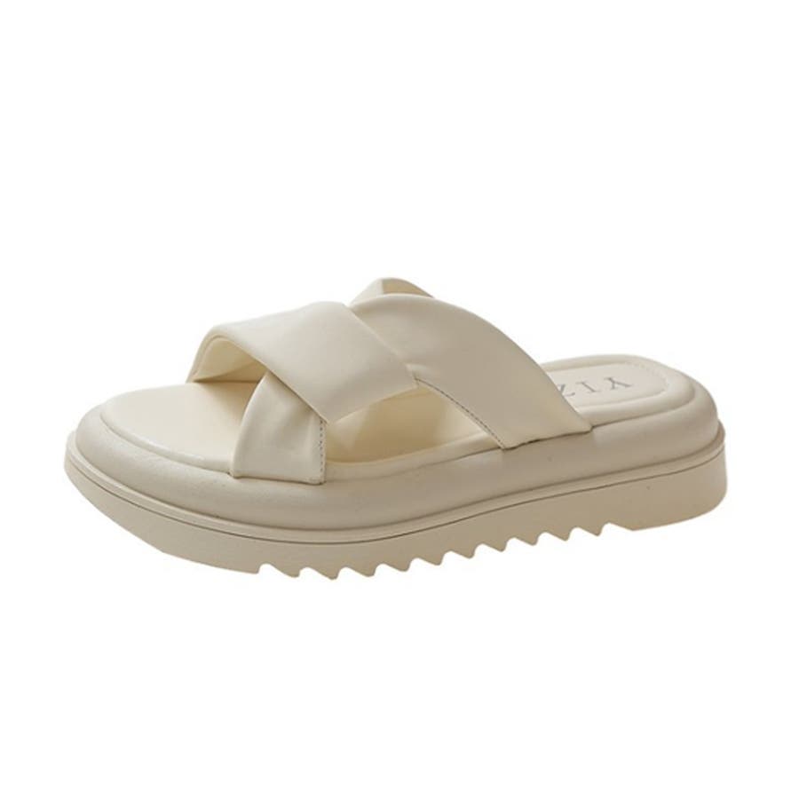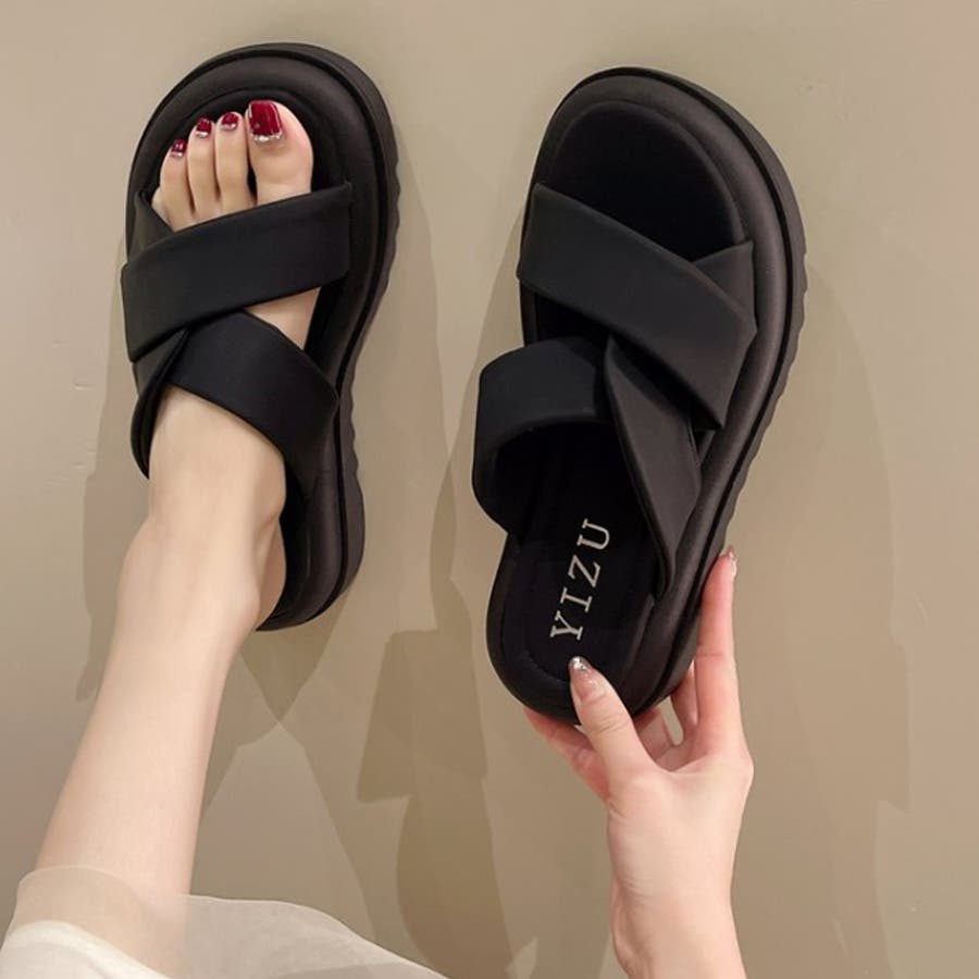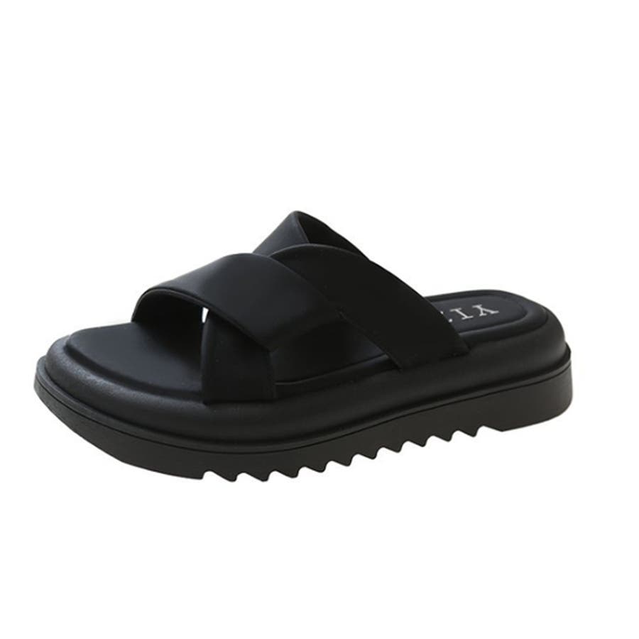 ・しっかりホールドする太めのクロスベルトでさっと履きやすく、歩きやすくて疲れにくい。