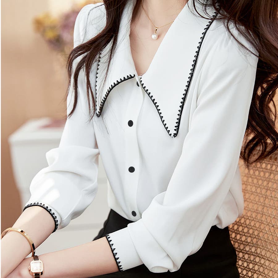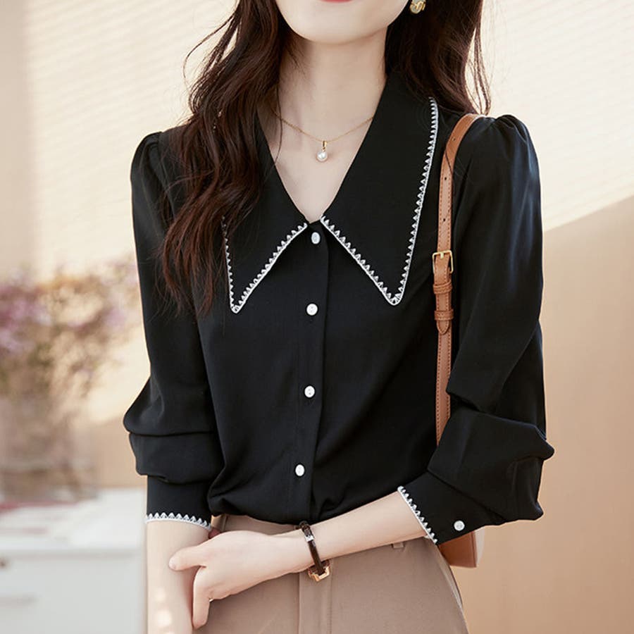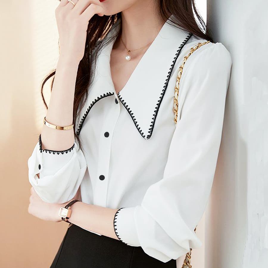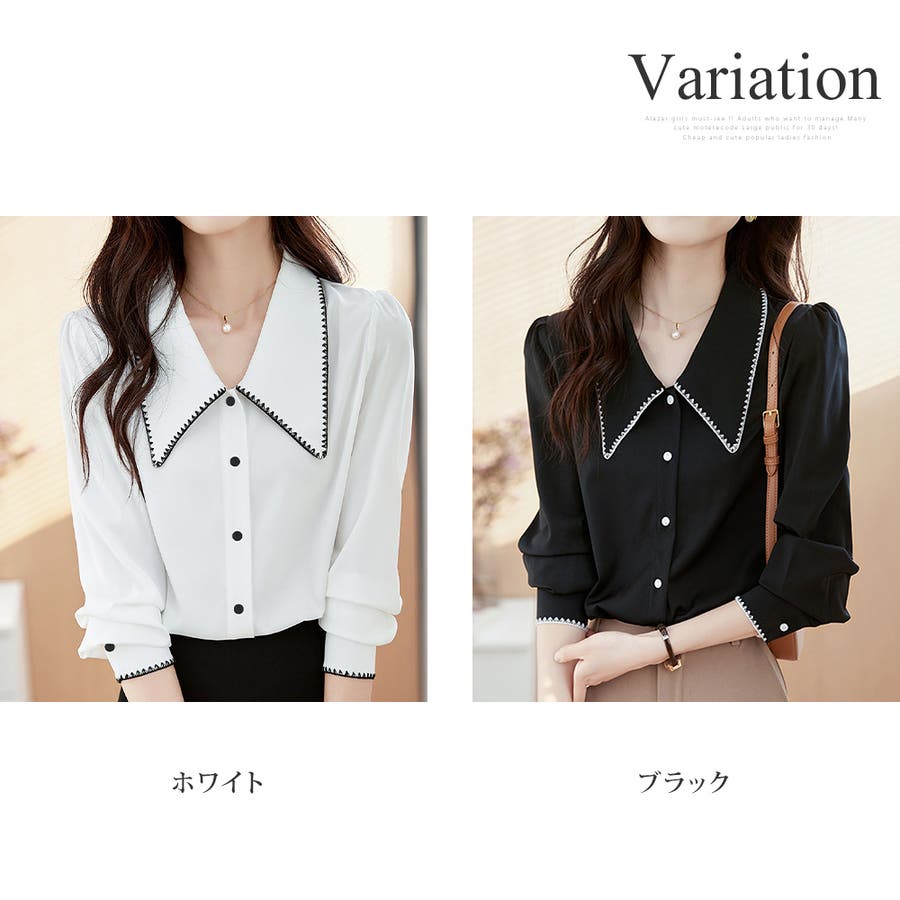 ・Vネックで首元すっきり。大きめの襟が顔まわりをスッキリと見せてくれるデザイン。縁取りのステッチがポイント♪