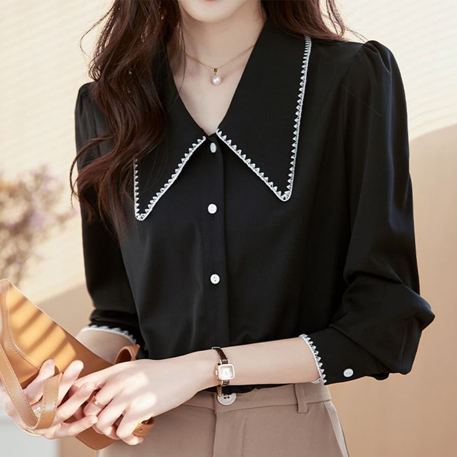 ・シンプルな綺麗めブラウス。無地なので着回しやすい。袖をまくって丈を変えるだけで印象が変わる!着こなしアレンジを楽しんで♪
