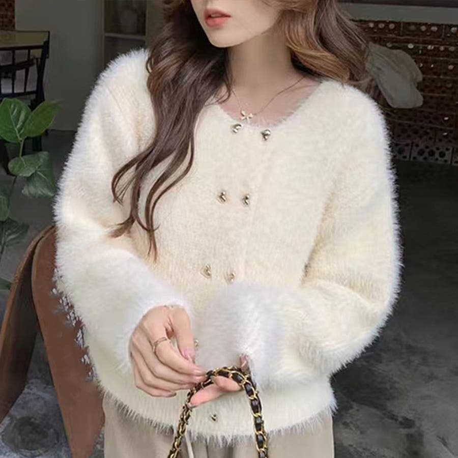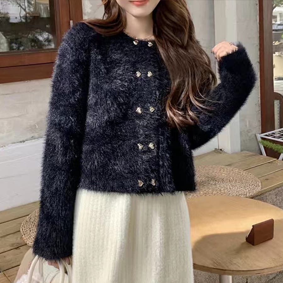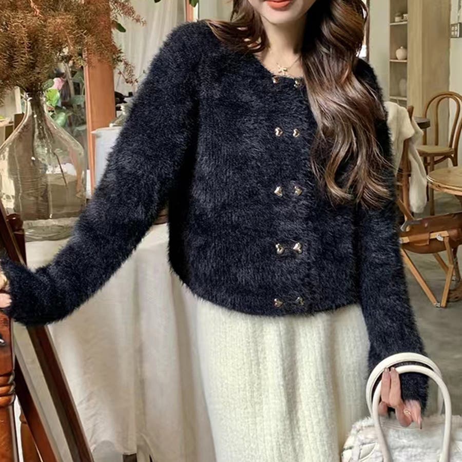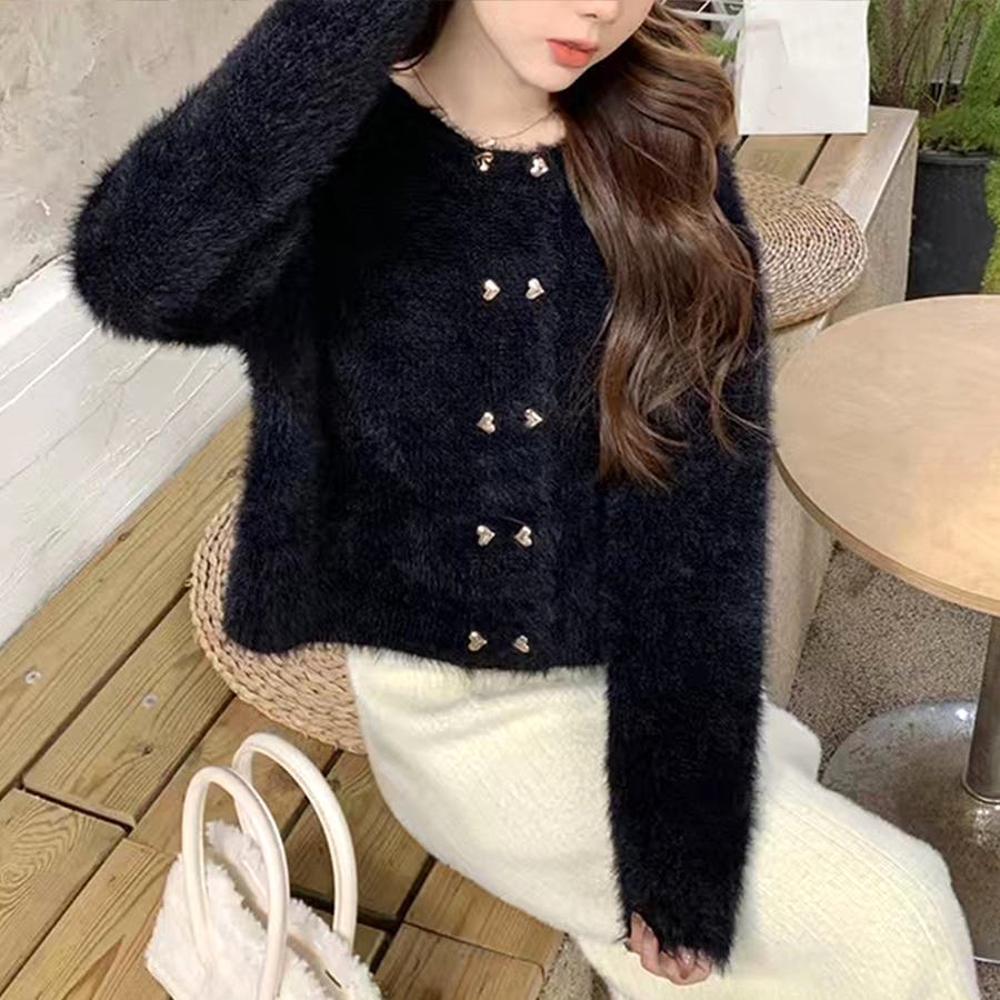 ・華やかでリッチ感のあるシャギーと、ハートのボタンが大人かわいいニットカーディガン。