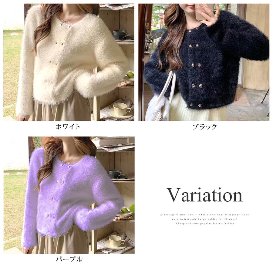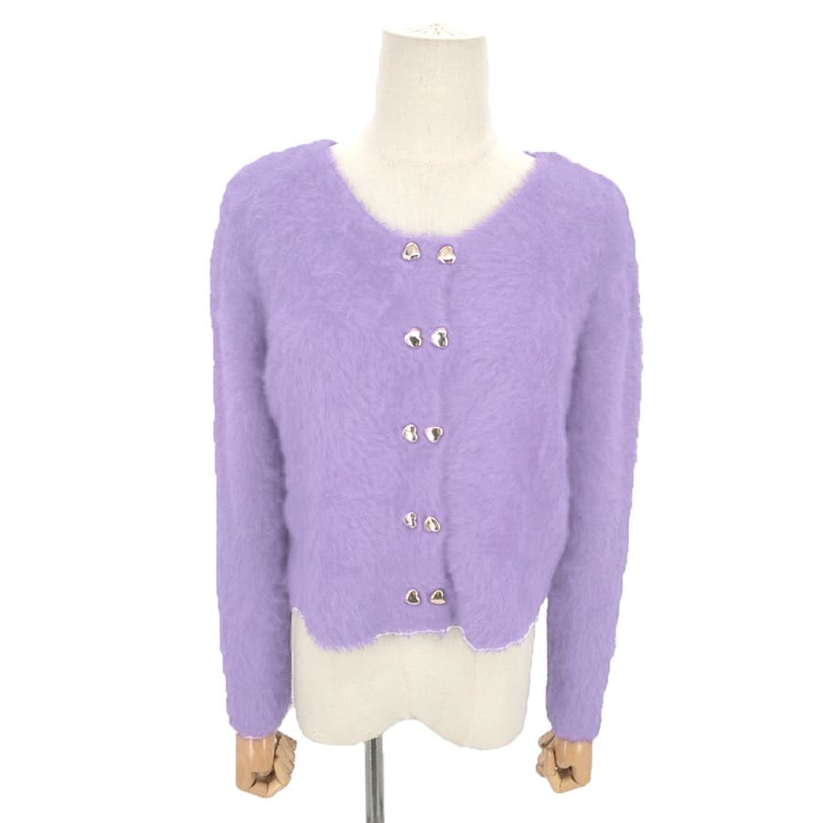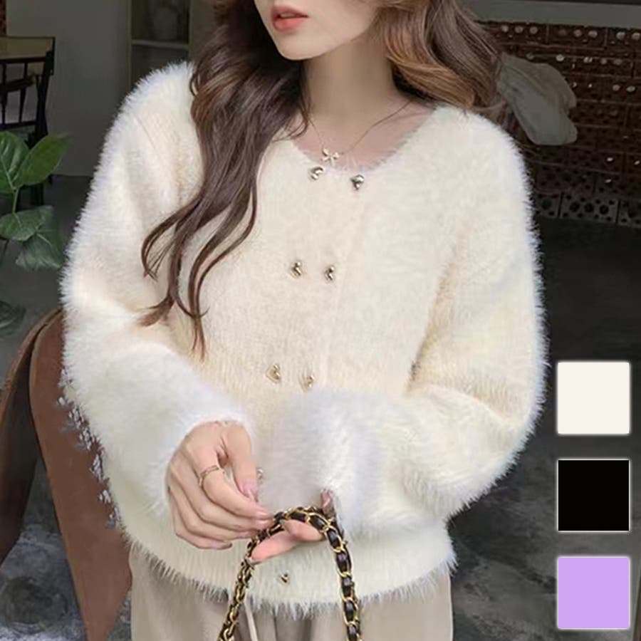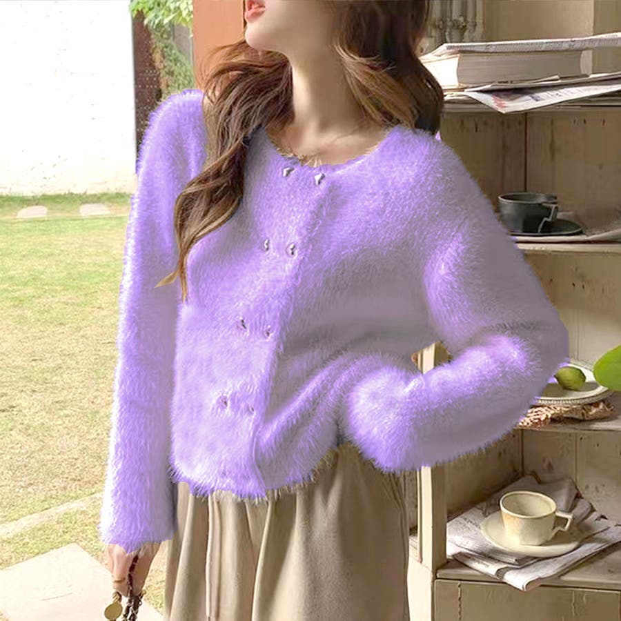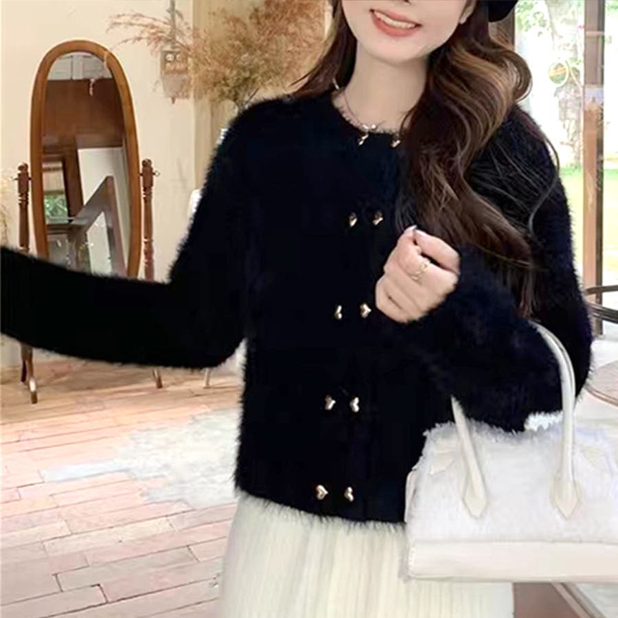 ・華やかでリッチ感のあるシャギーと、ハートのボタンが大人かわいいニットカーディガン。