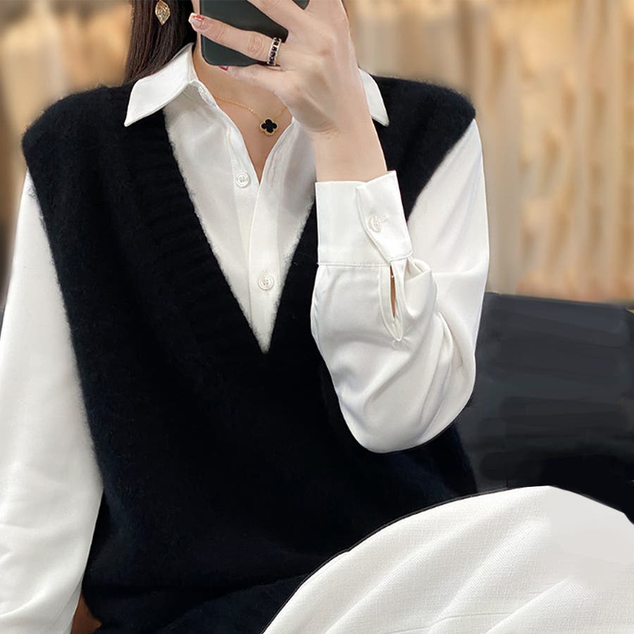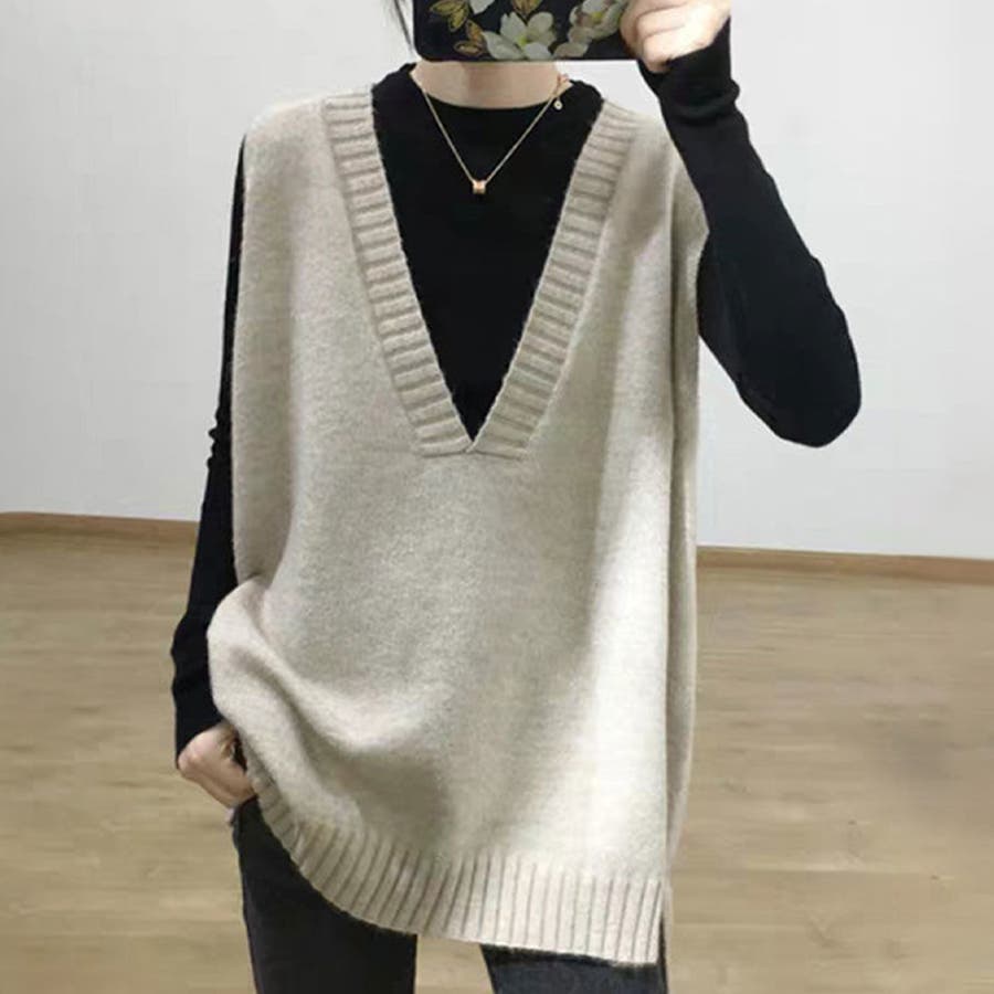 ・ざっくり開いた深めのVネックと長めの丈感がポイントで体全体の華奢見せを叶えてくれる。