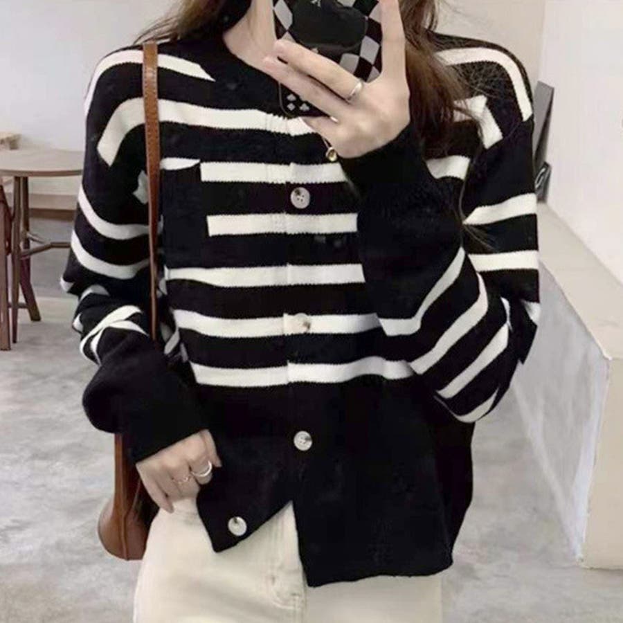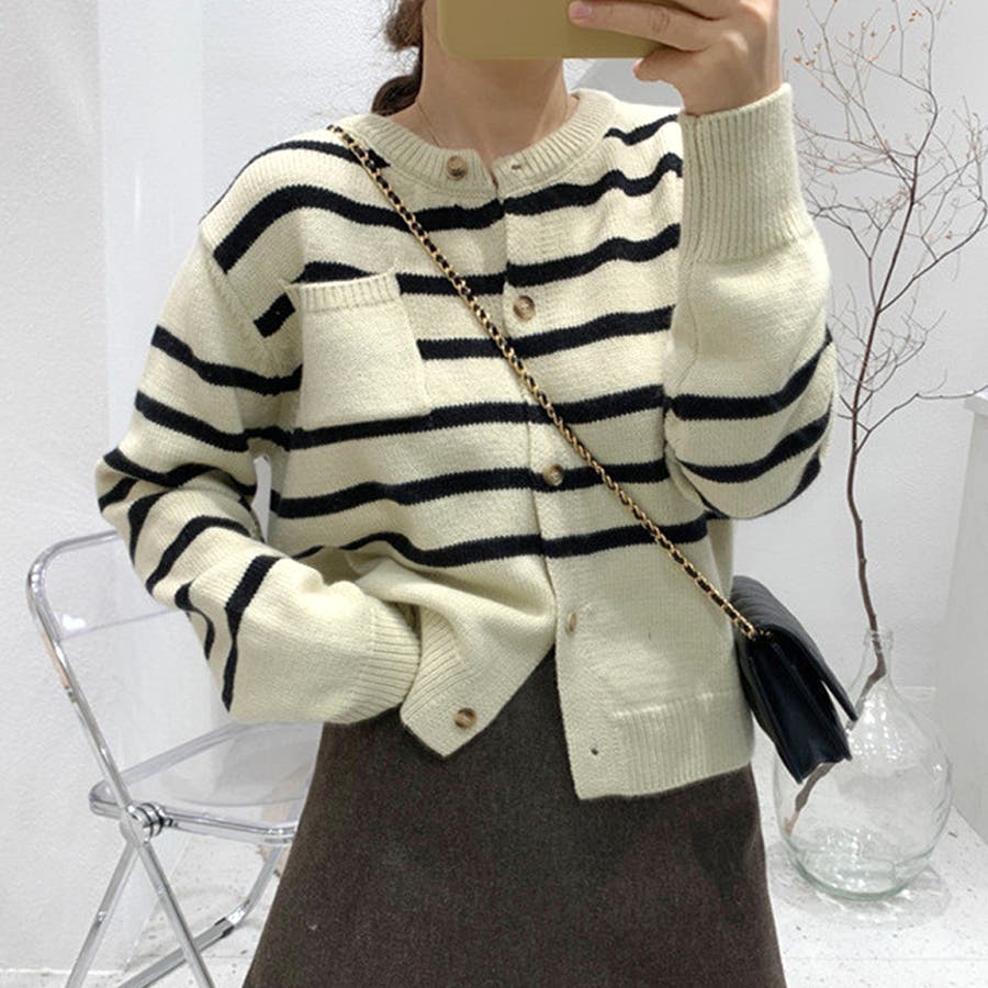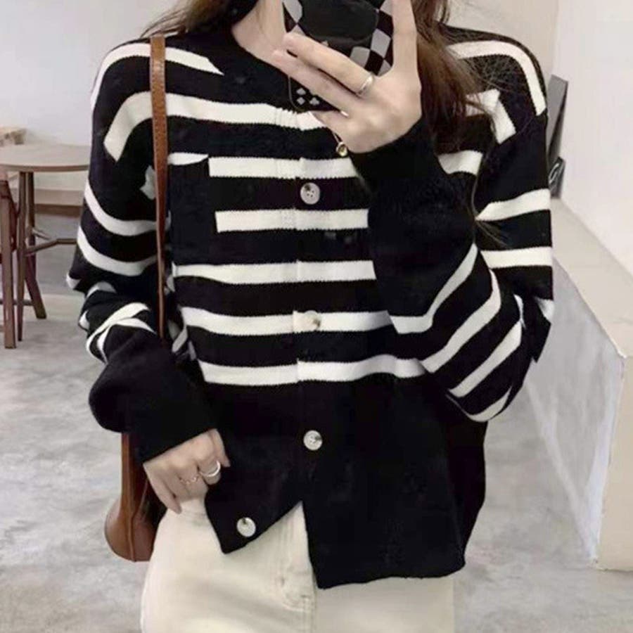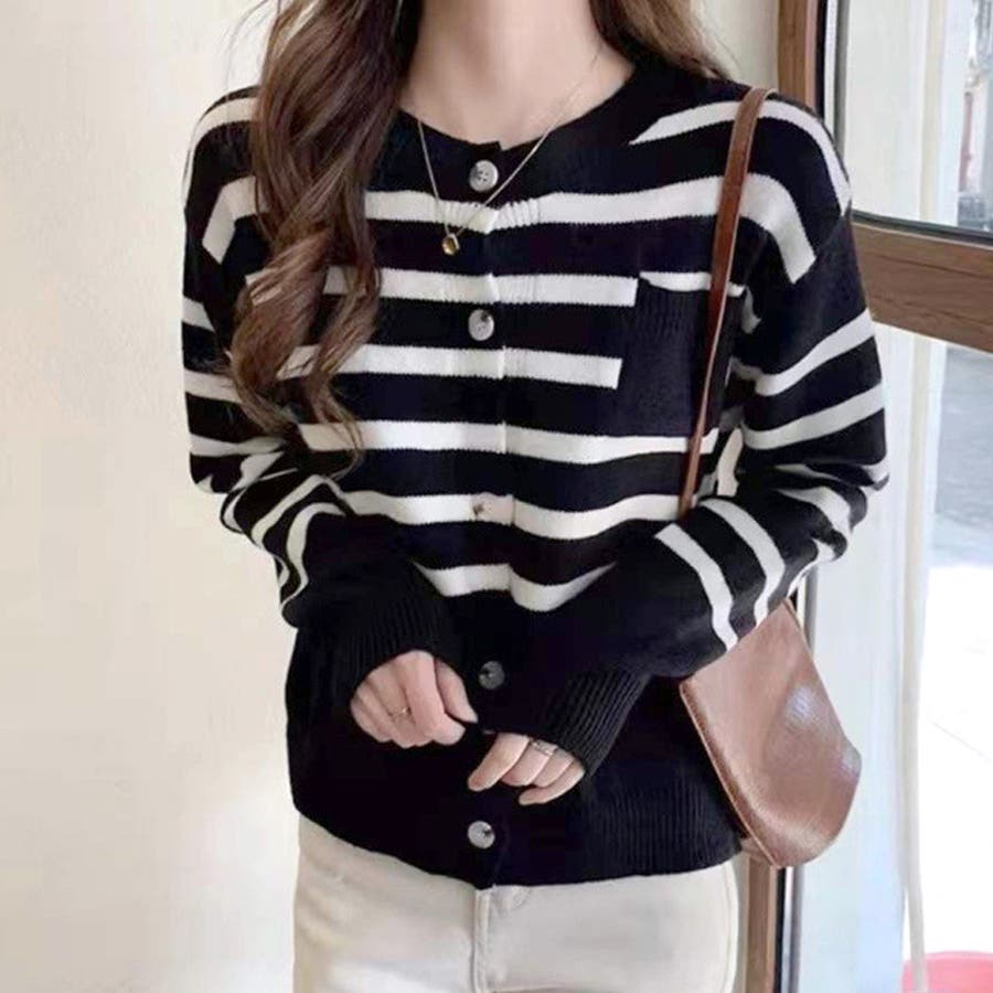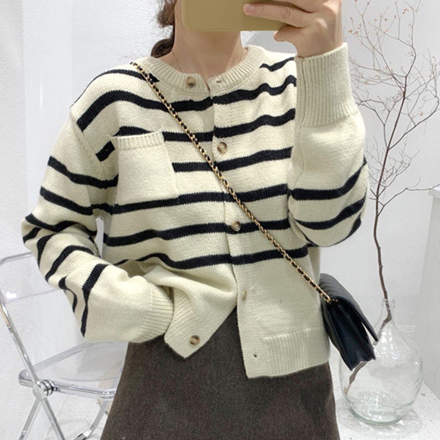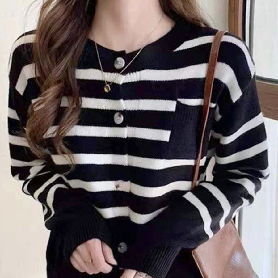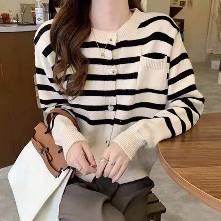 ノーカラーボーダーニットカーディガン レディース 10代