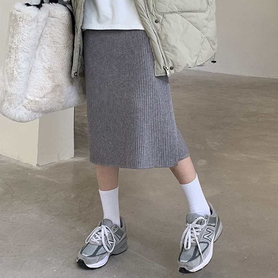 ・縦のリブがしっかり入っているから下半身スッキリ見せも。ボディーラインにフィットするスッキリとしたシルエットのIラインスカート。
