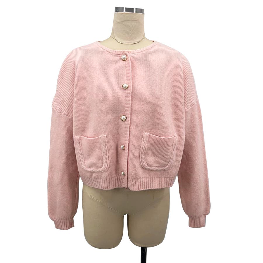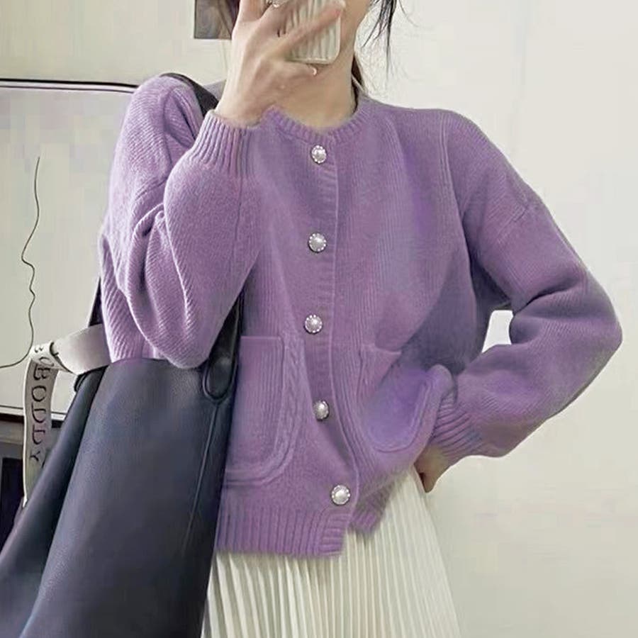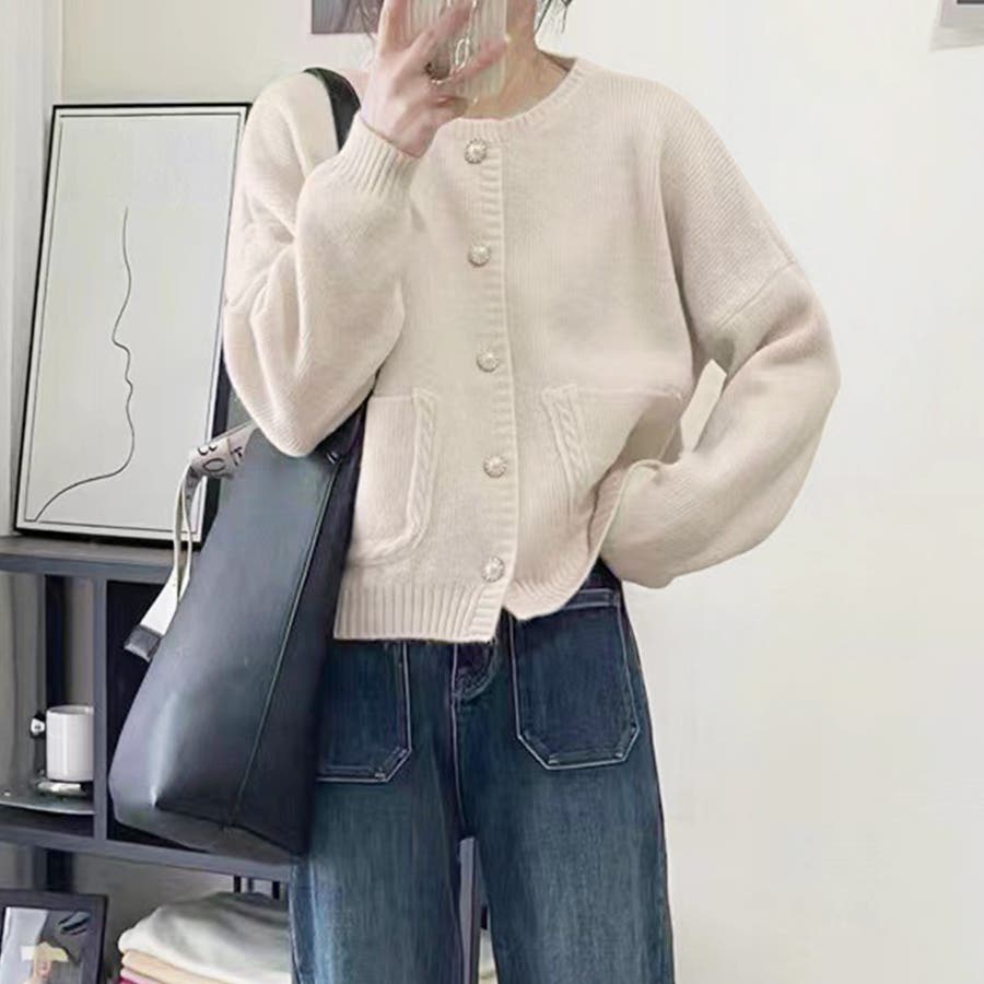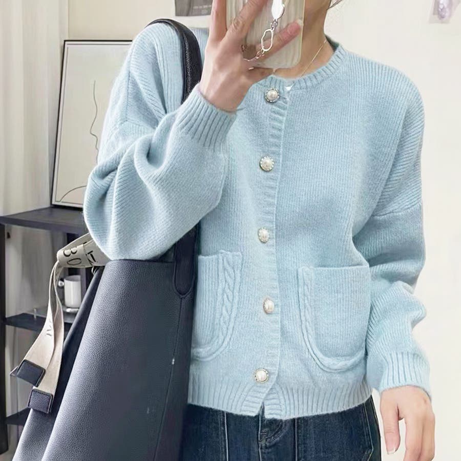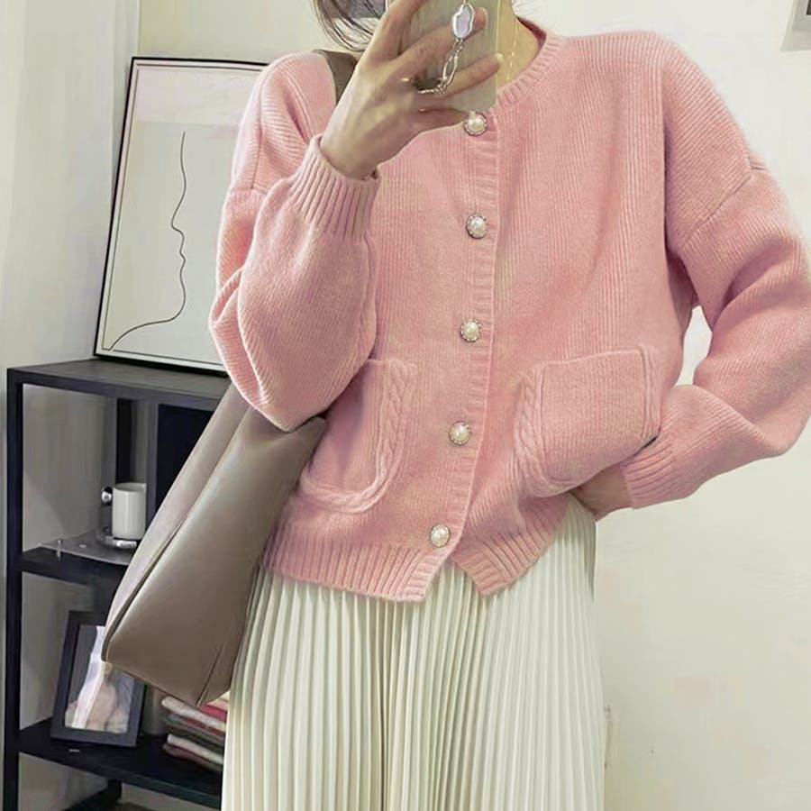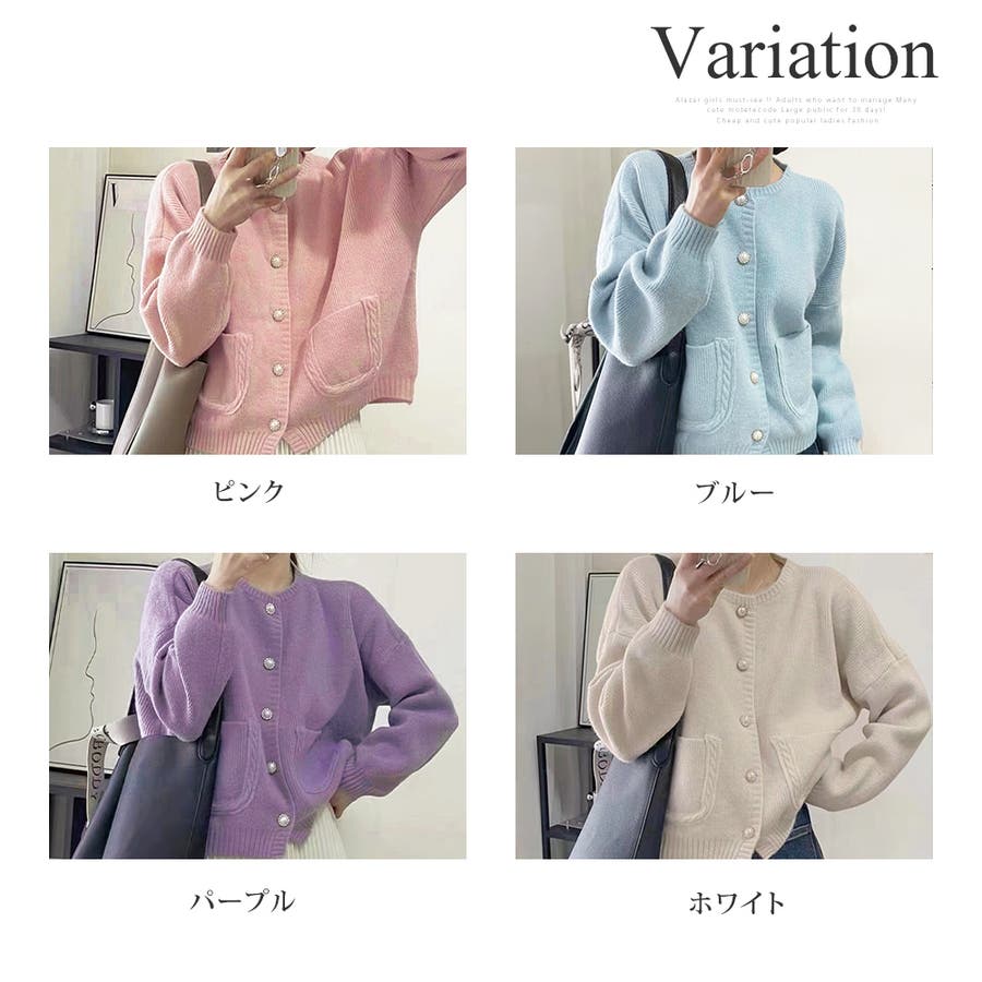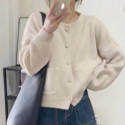 ・フェイクパールが目を惹く。女の子らしい柔らかい雰囲気のカーディガン。切り替えリブがしっかりあるので着心地◎
