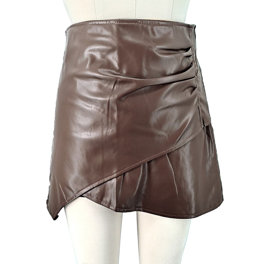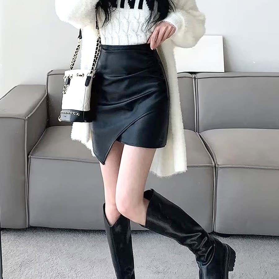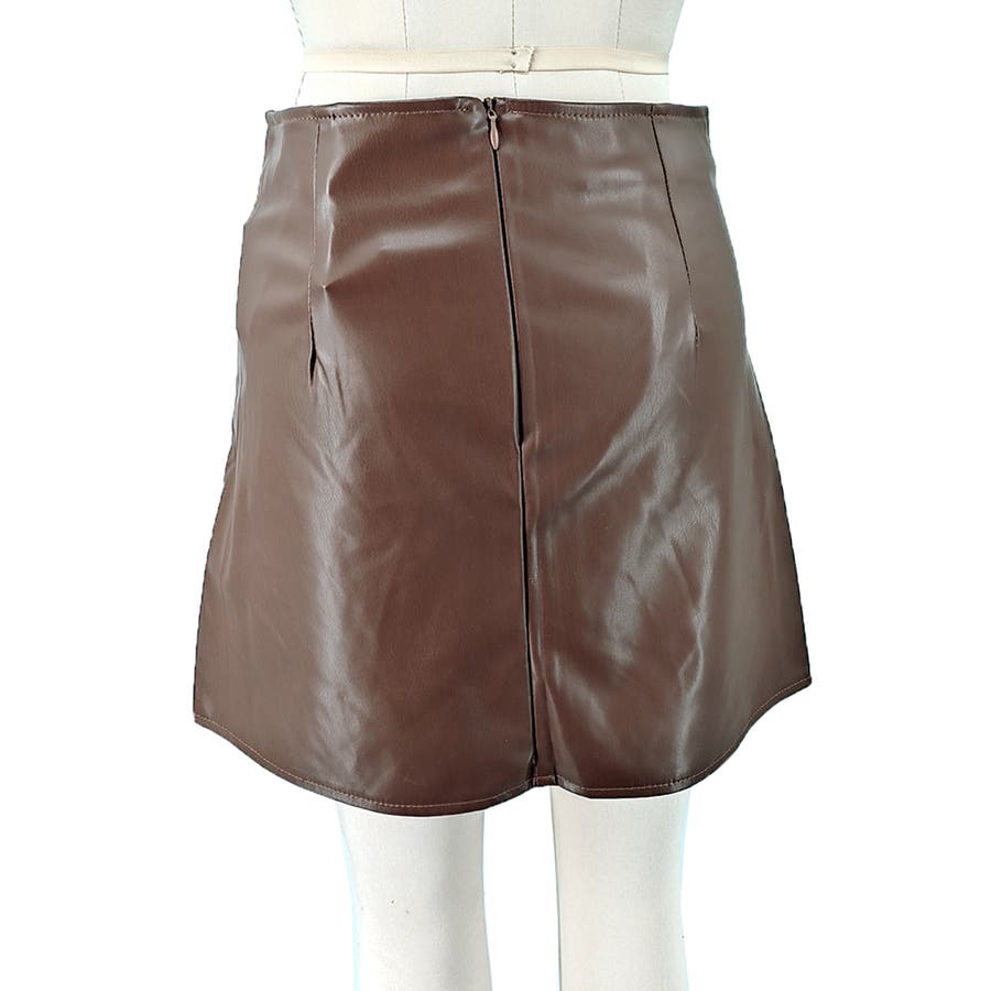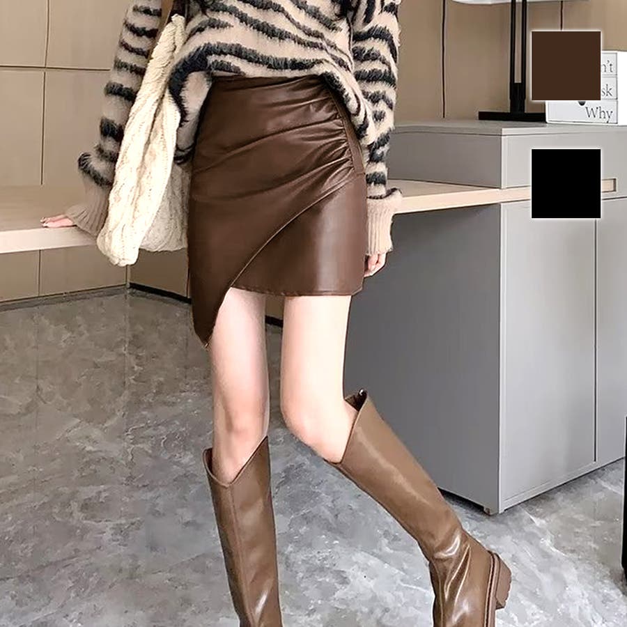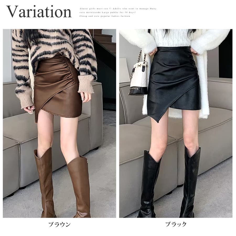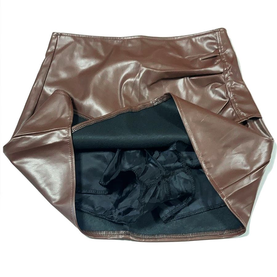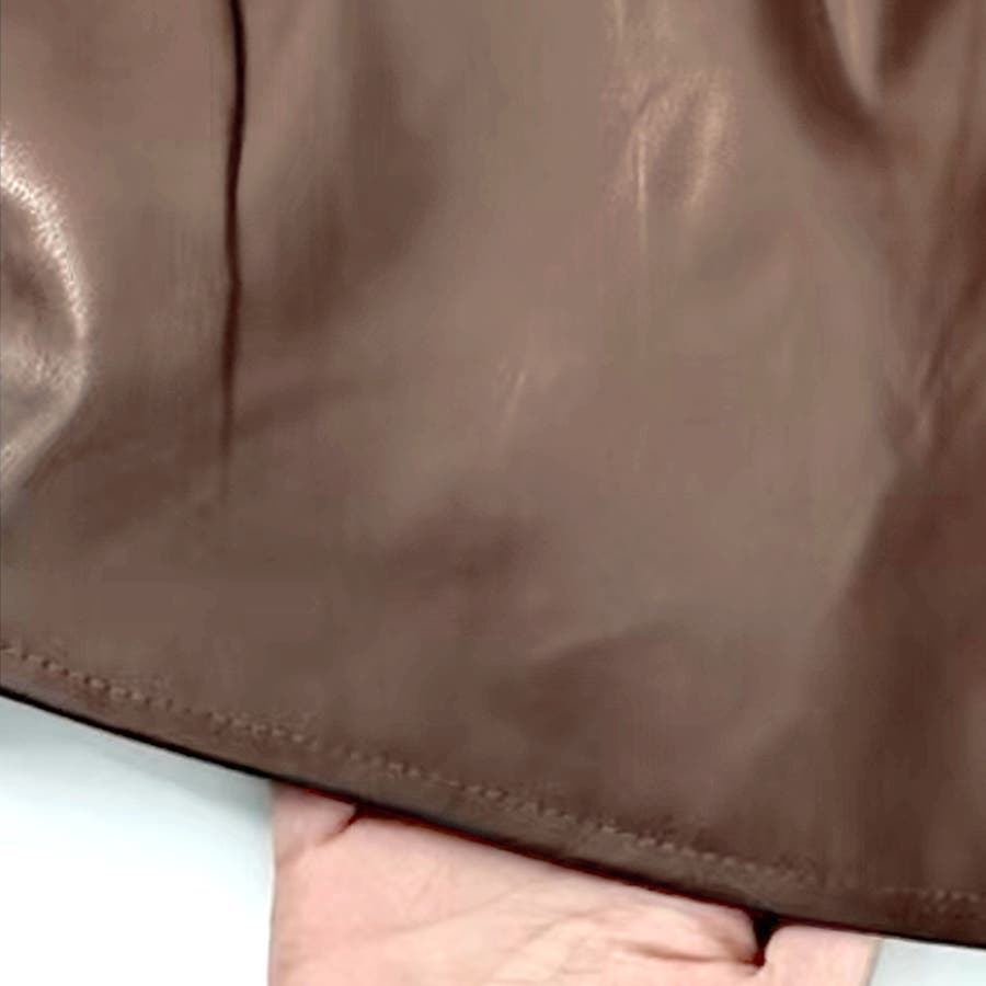 ・ズボンの裏地付きだからしっかりとした安心感があり、シンプルで大人可愛いフェイクレザーミニスカート。