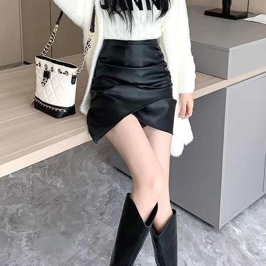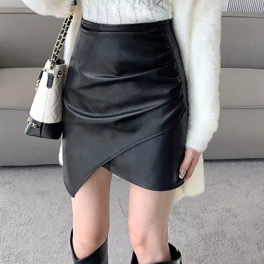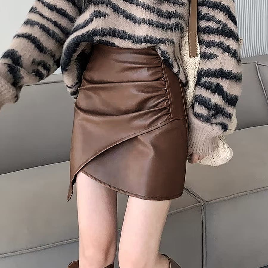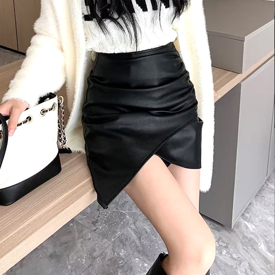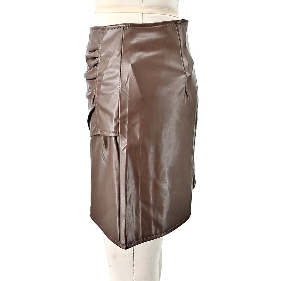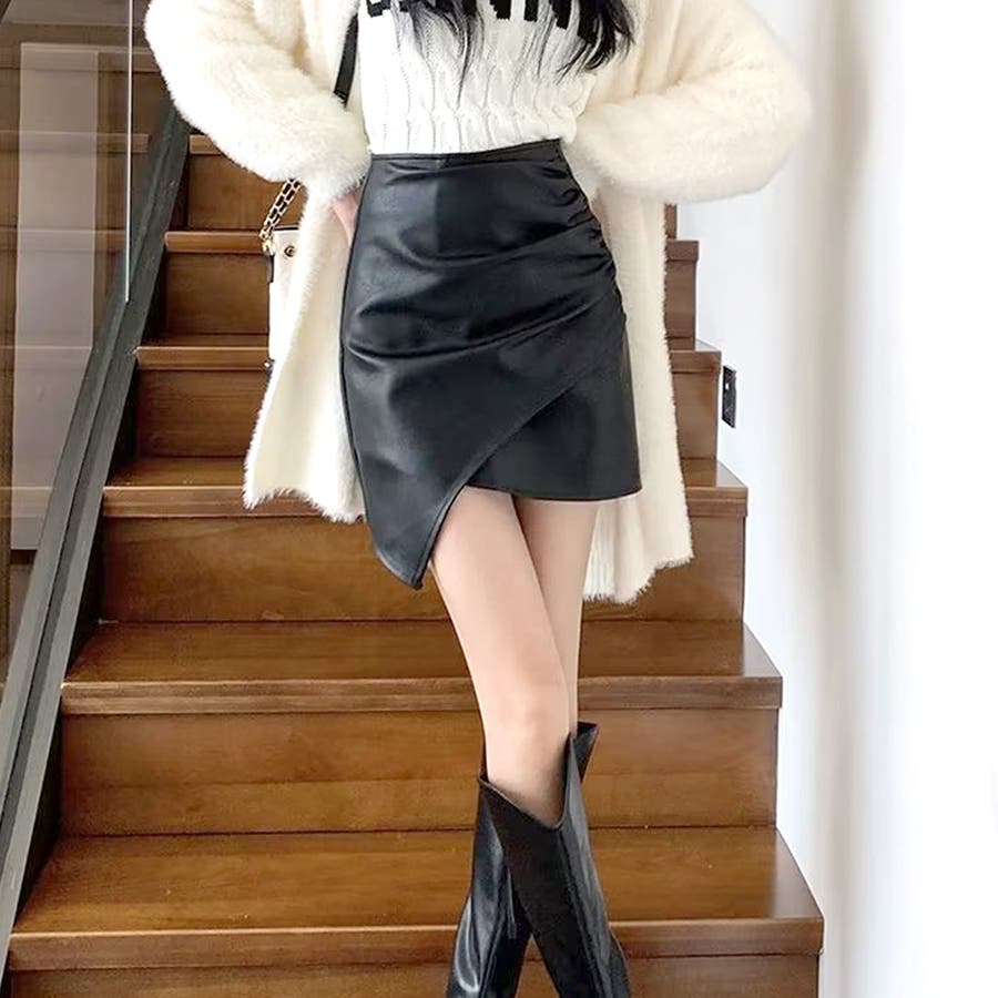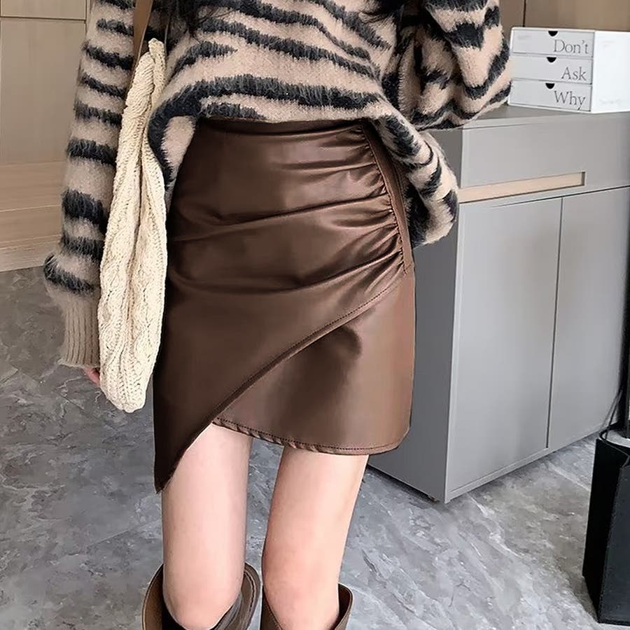 ・ズボンの裏地付きだからしっかりとした安心感があり、シンプルで大人可愛いフェイクレザーミニスカート。