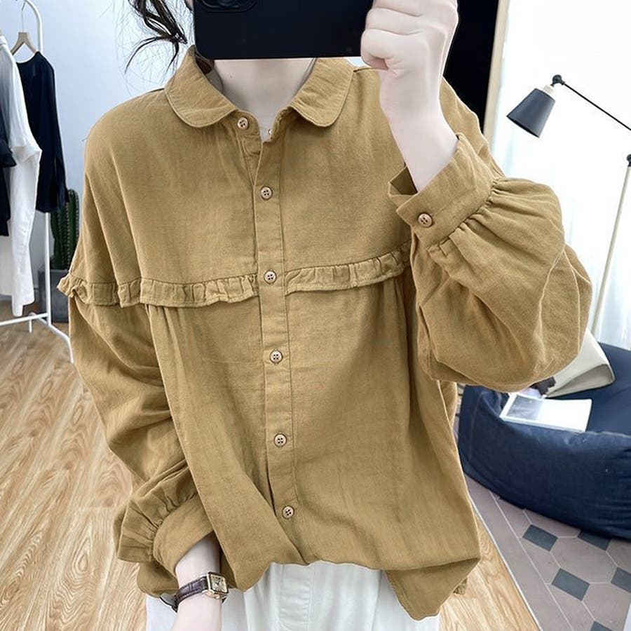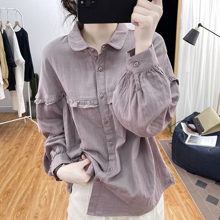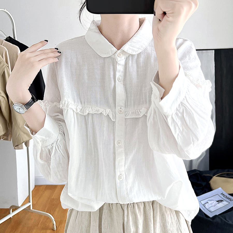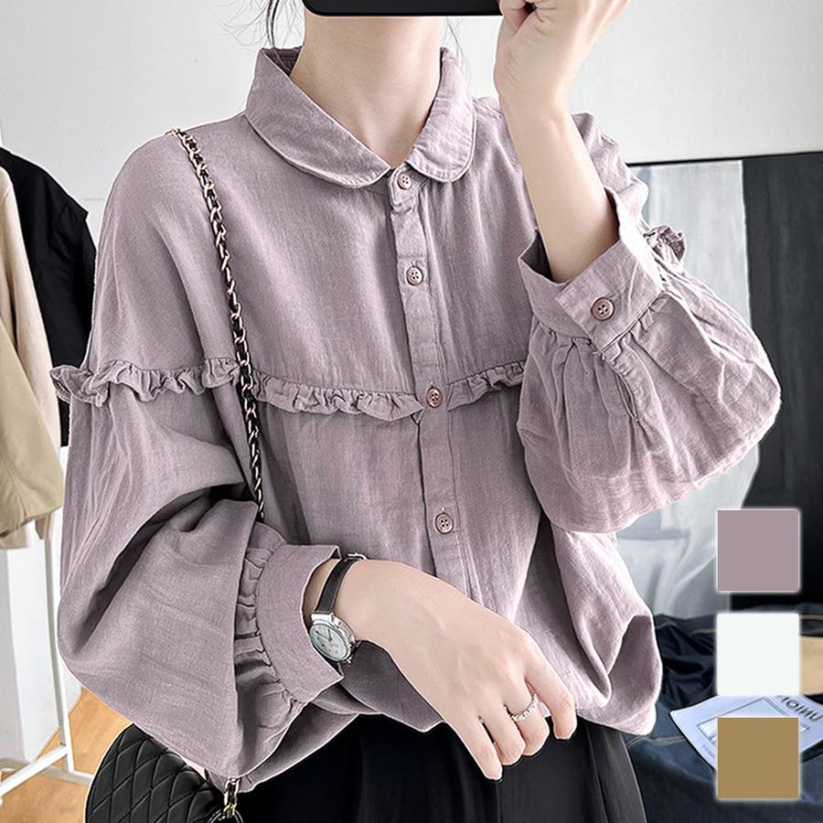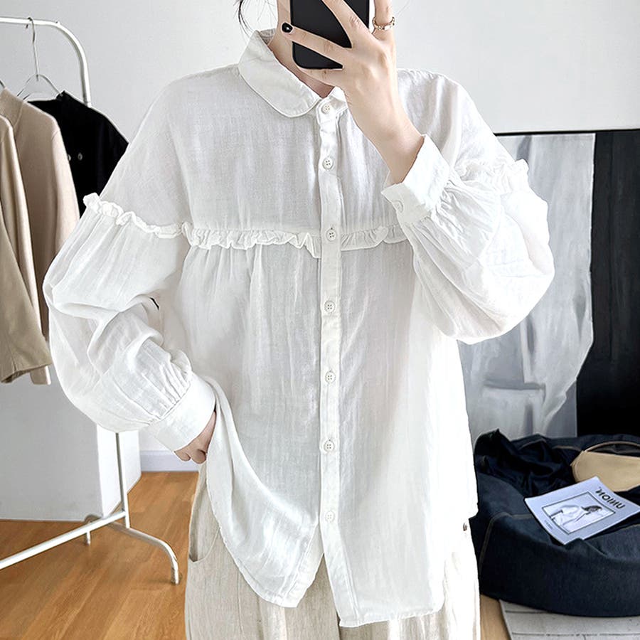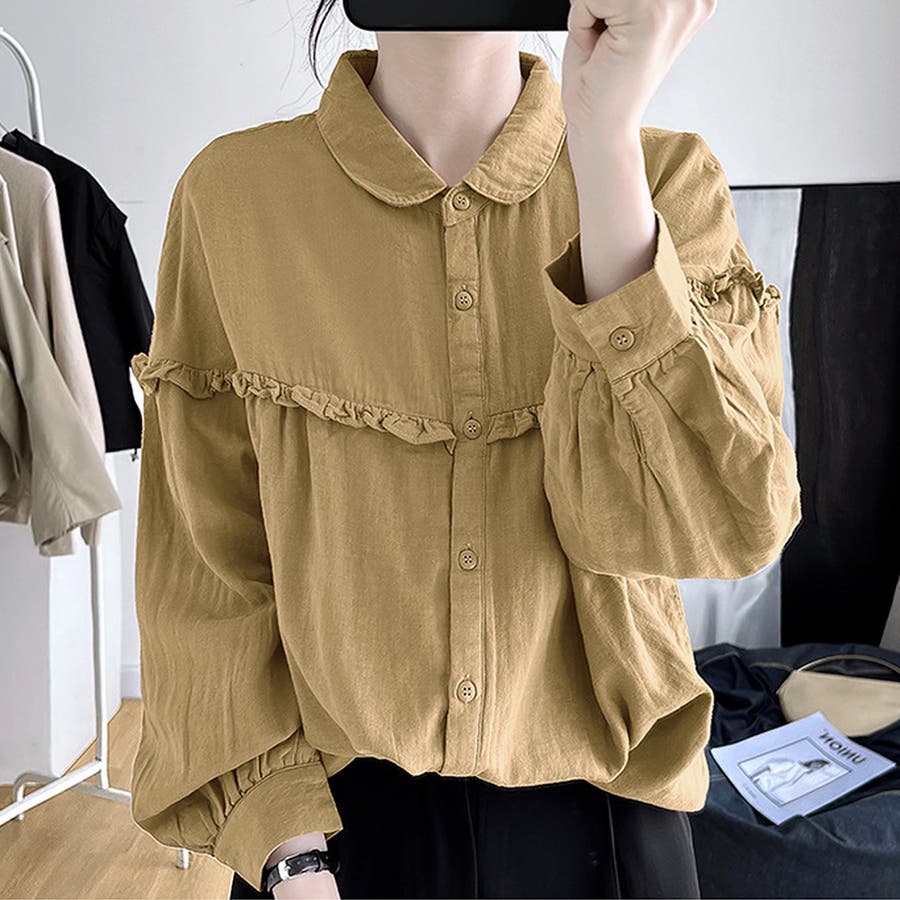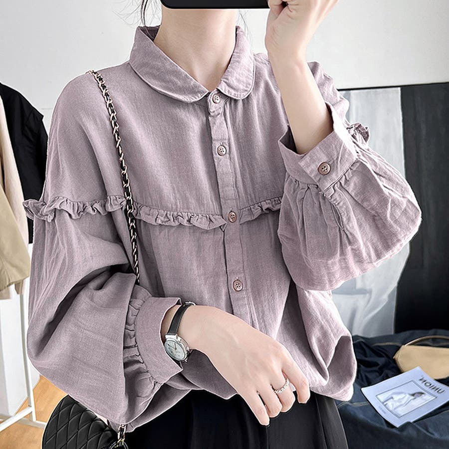 ・ゆったりしたシルエットがボディラインをカバーしてくる。丸襟とパフスリーブが柔らかい印象をあたえてくれます♪