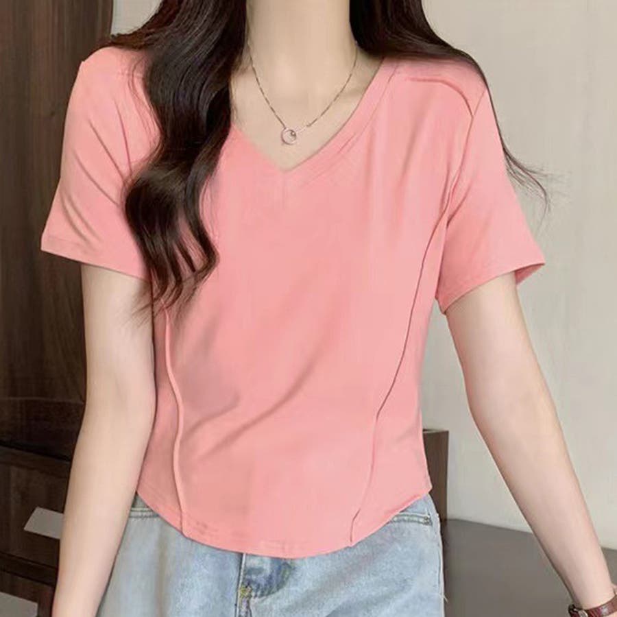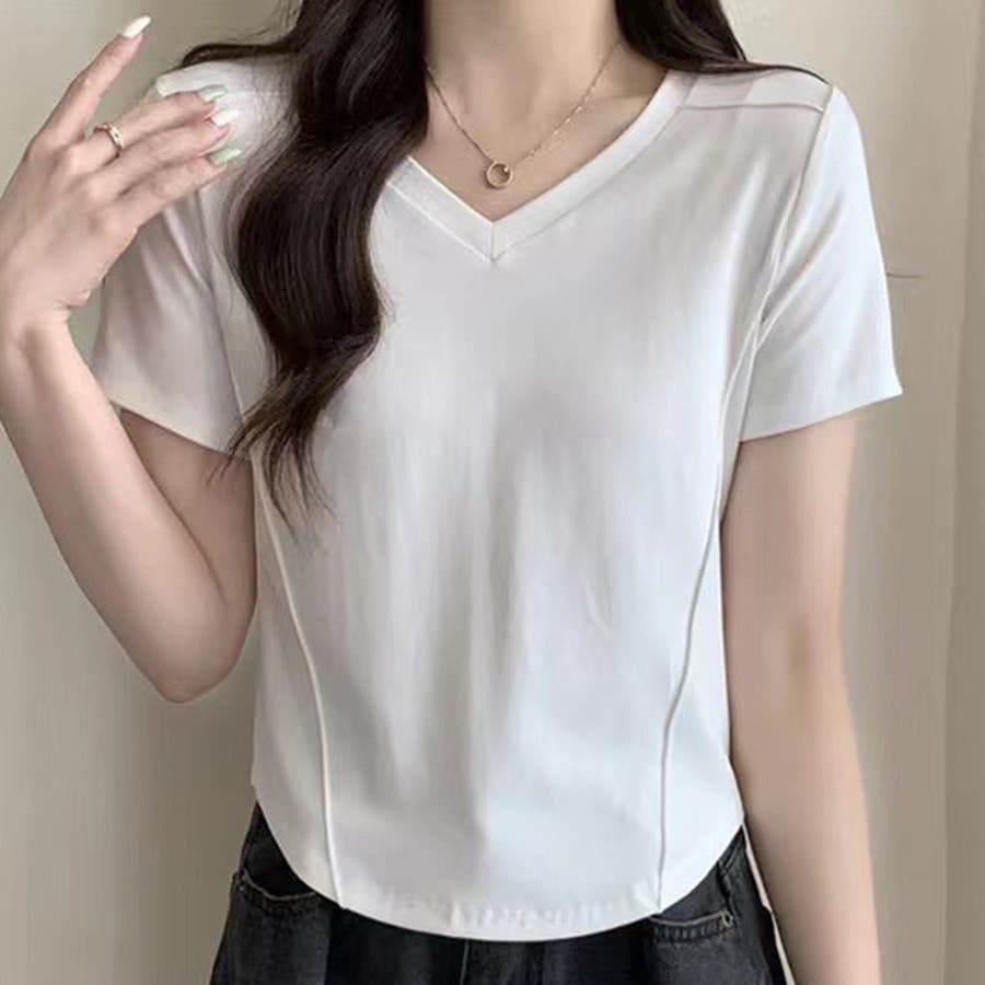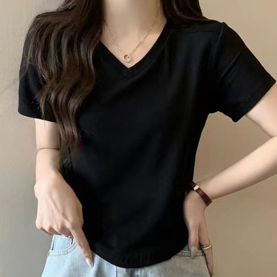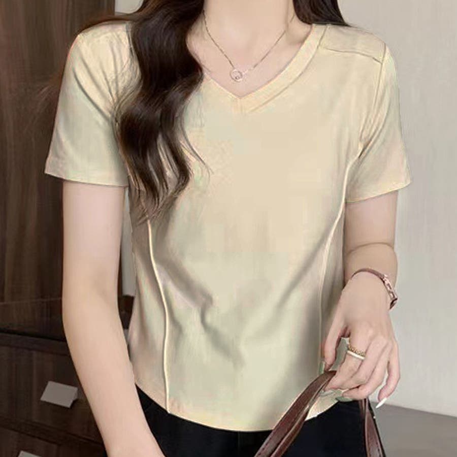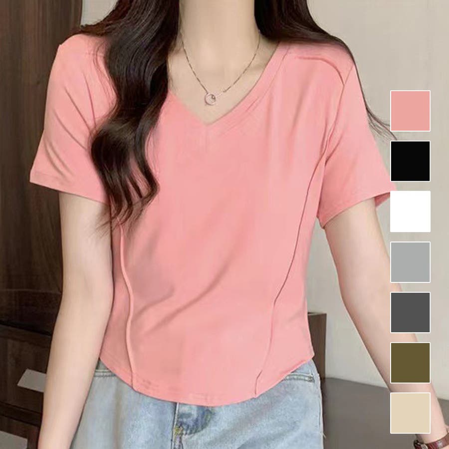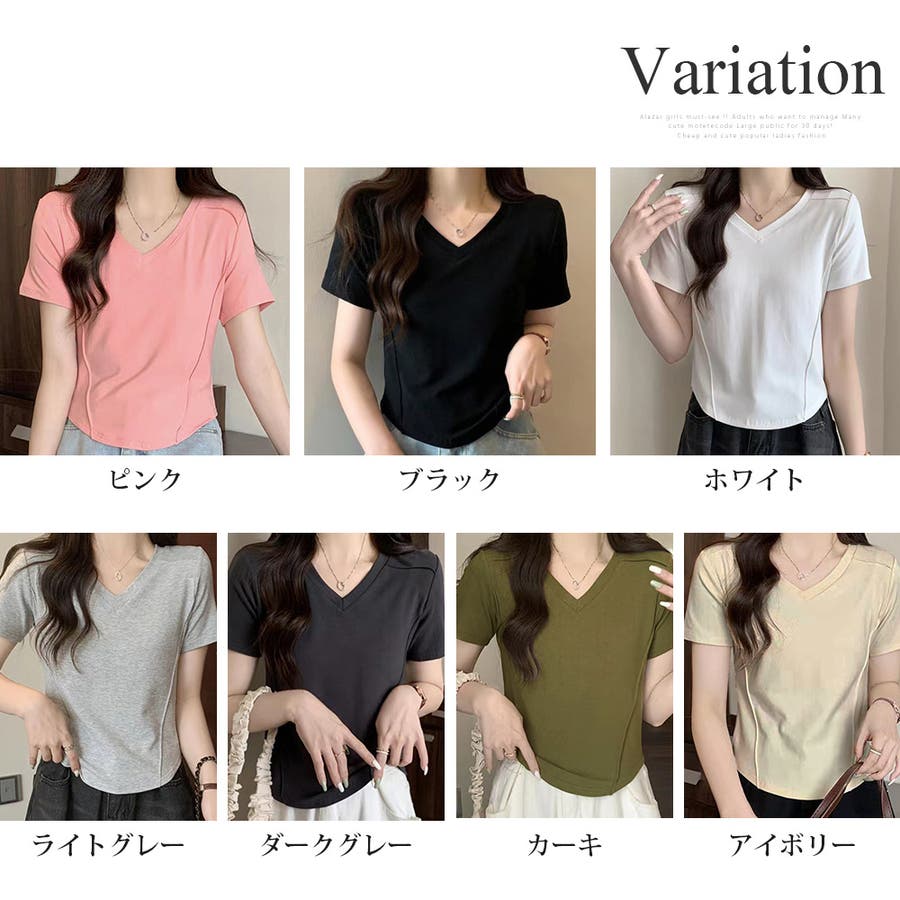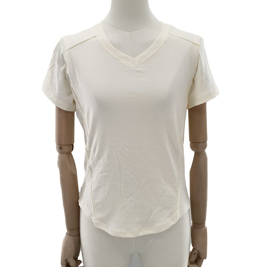 ・Vネックで首元をキレイに見せてくれるプレス加工デザインTシャツ♪