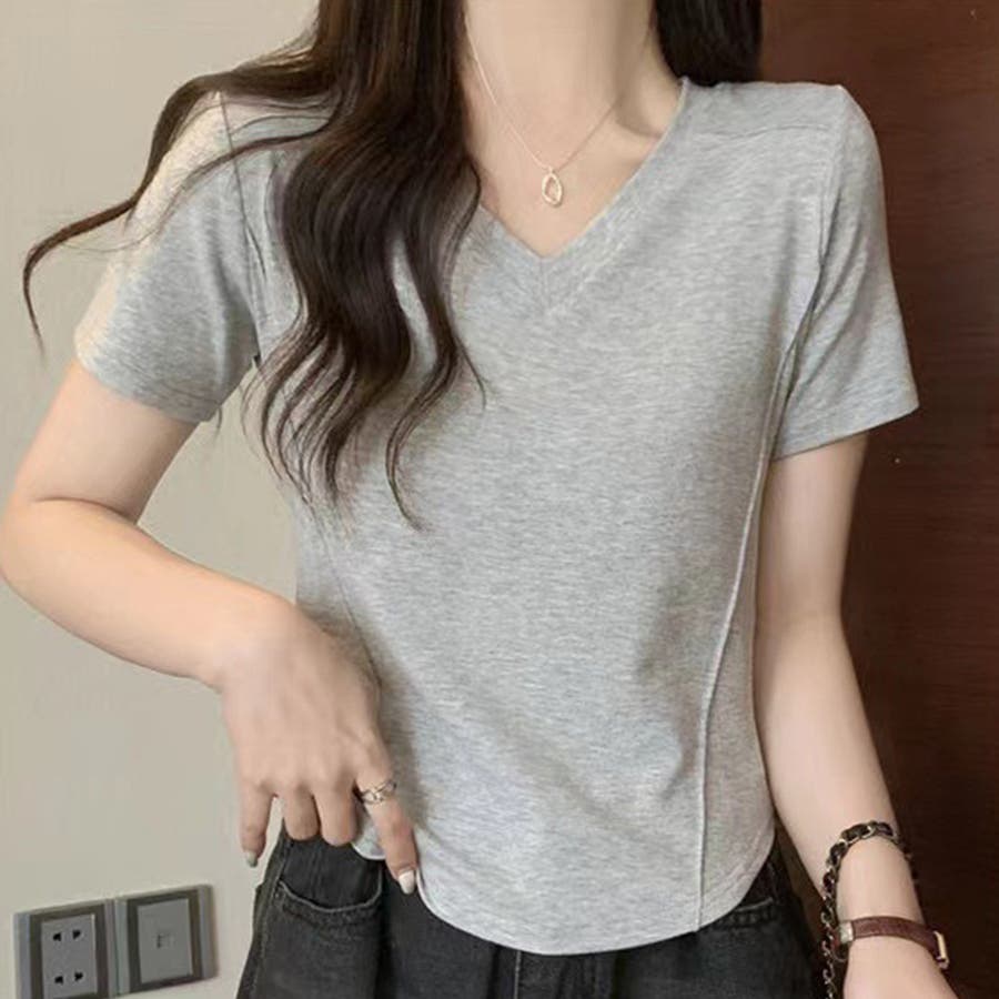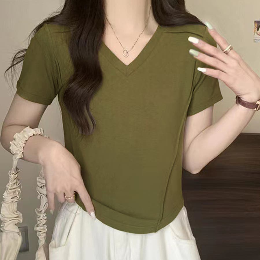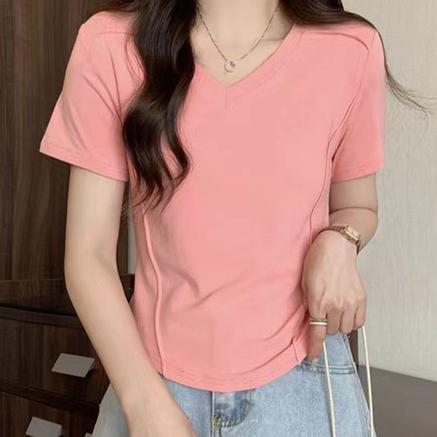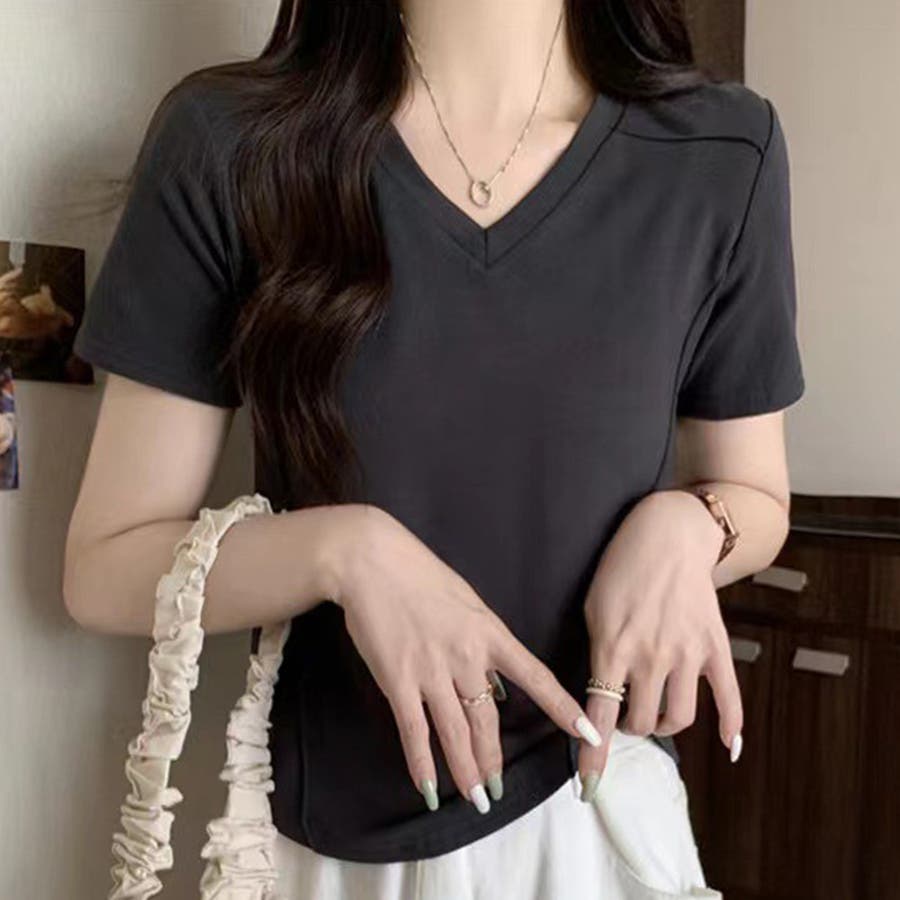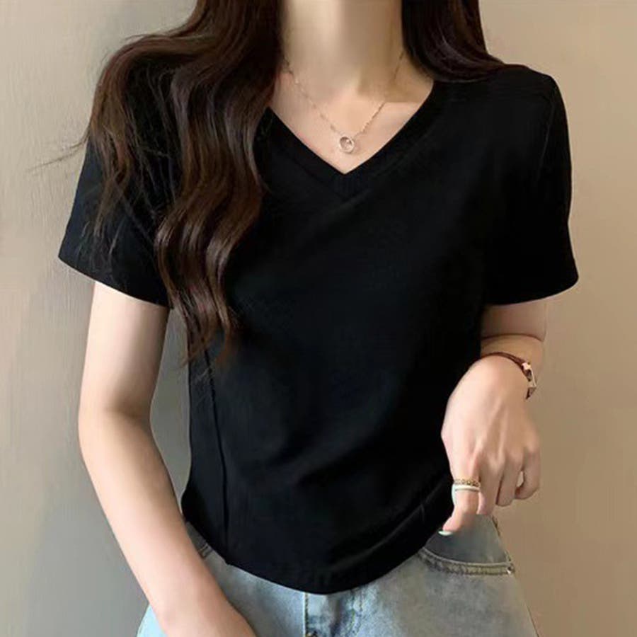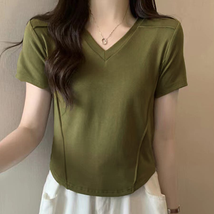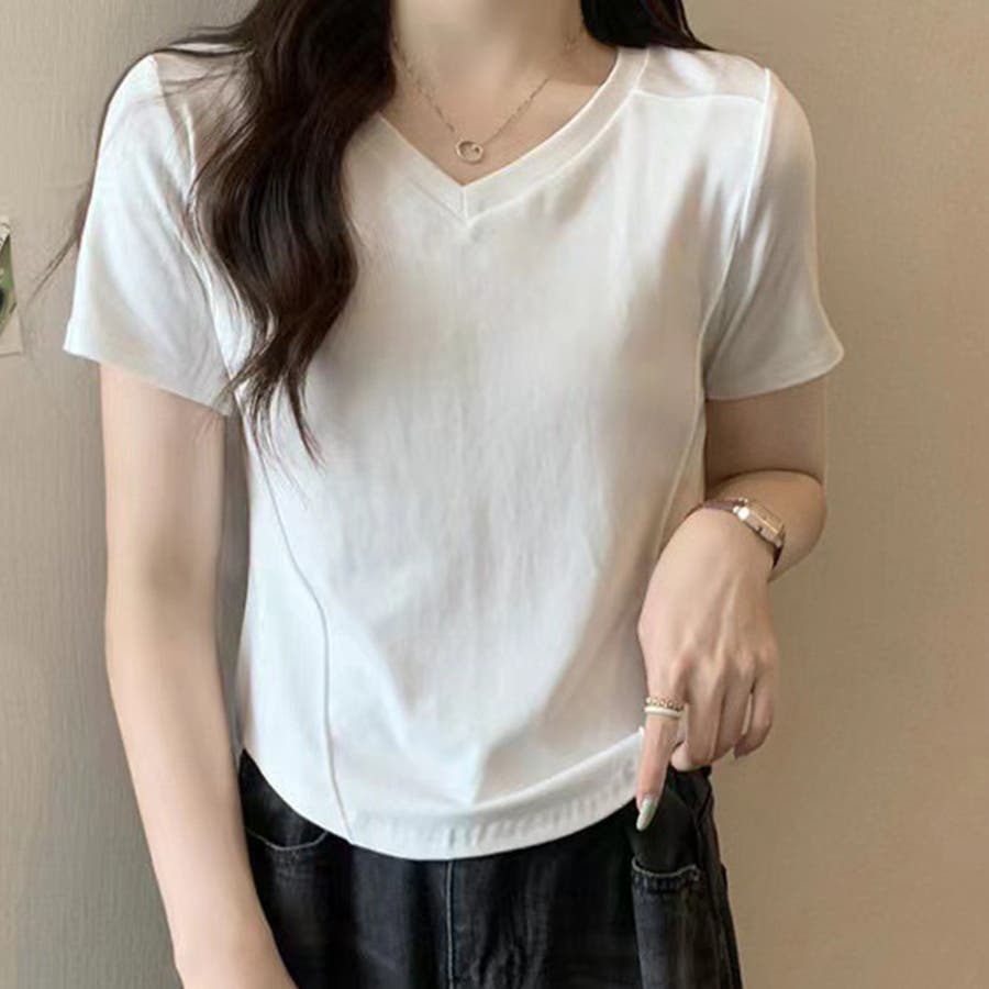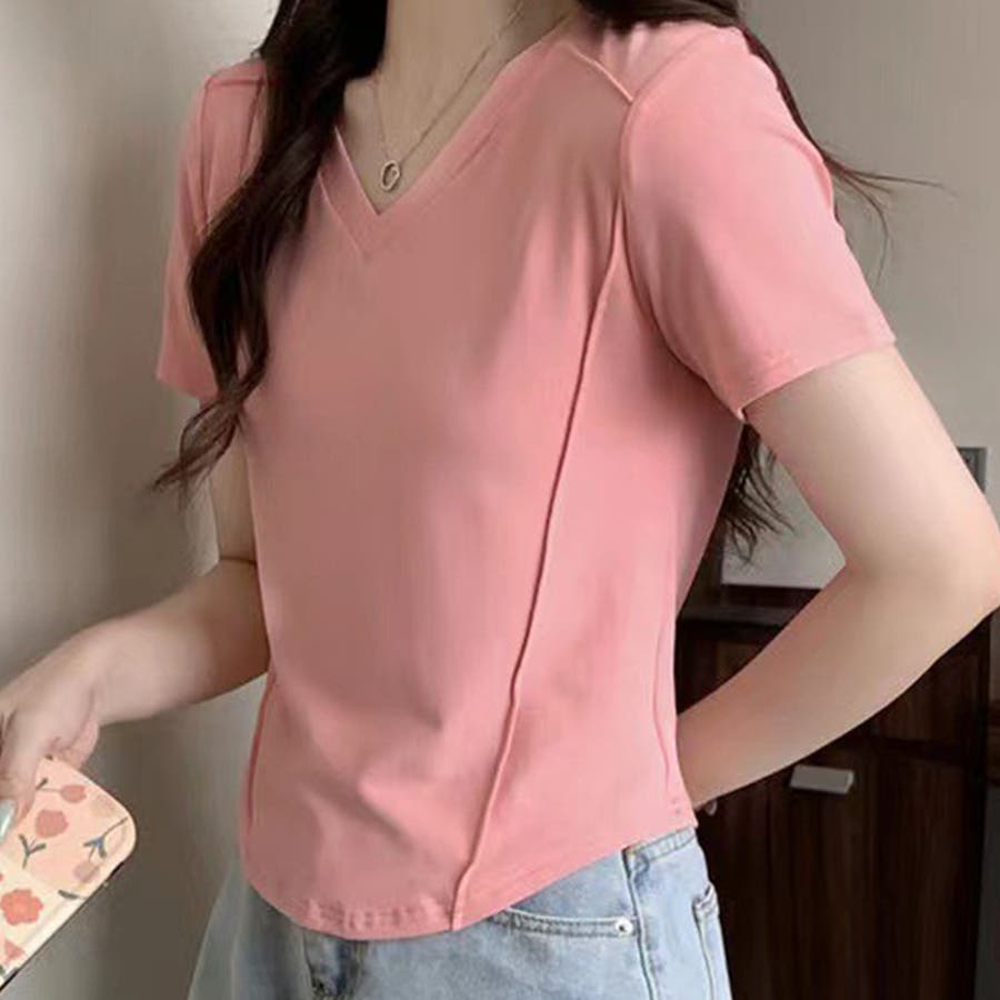 ・Vネックで首元をキレイに見せてくれるプレス加工デザインTシャツ♪