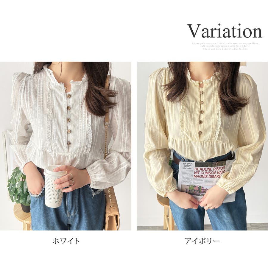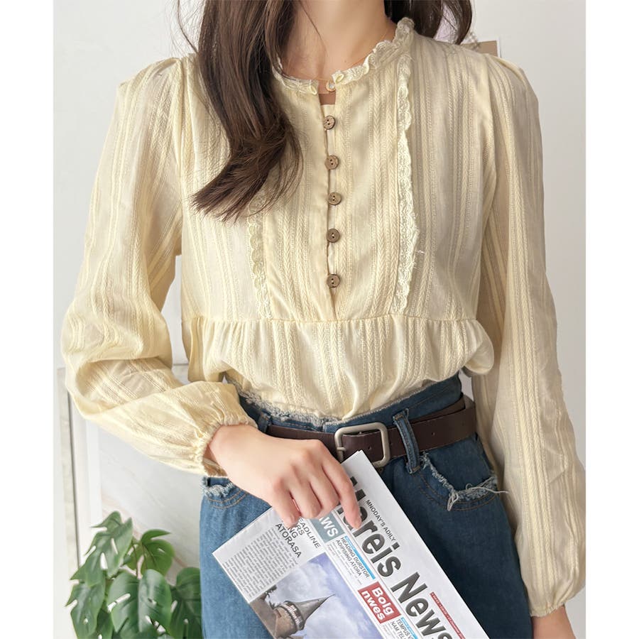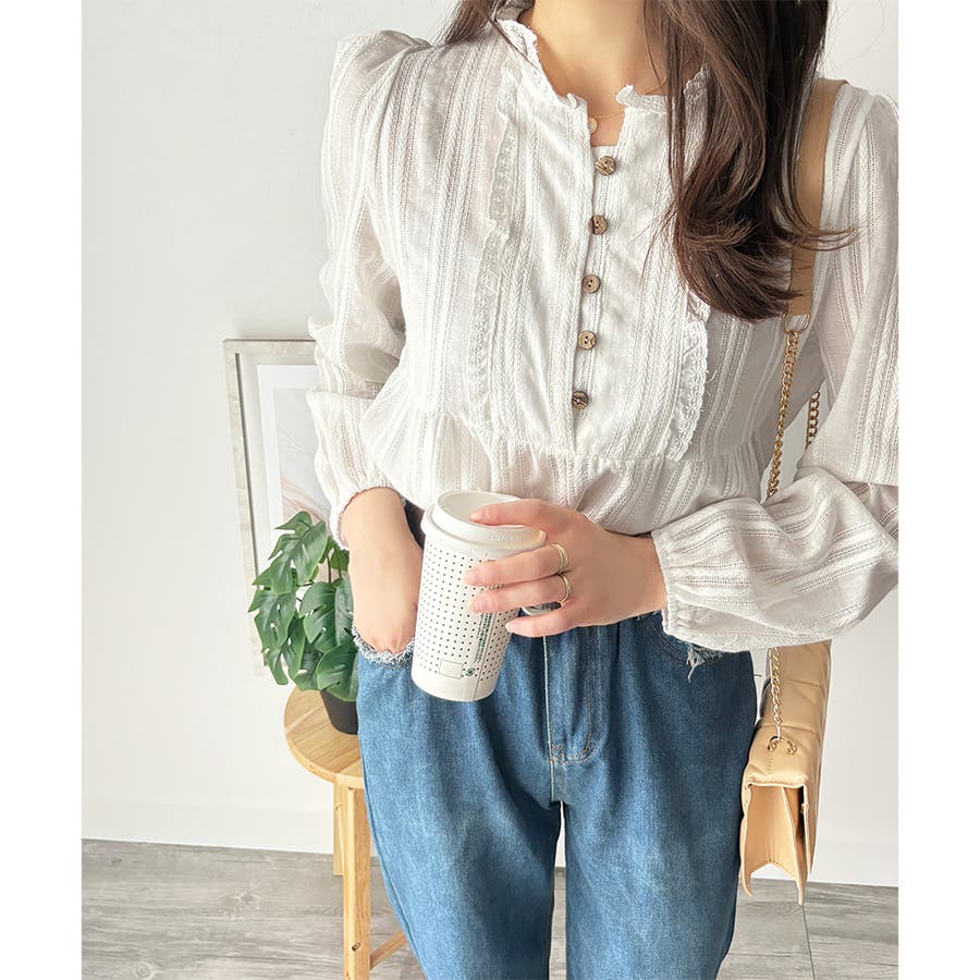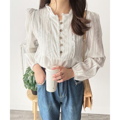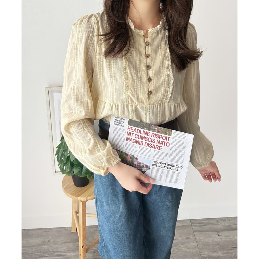 ・レース風の繊細な生地感とフリル使いが印象的な華やかブラウス。涼しげな透け感で軽やかな印象を与えてくれます♪