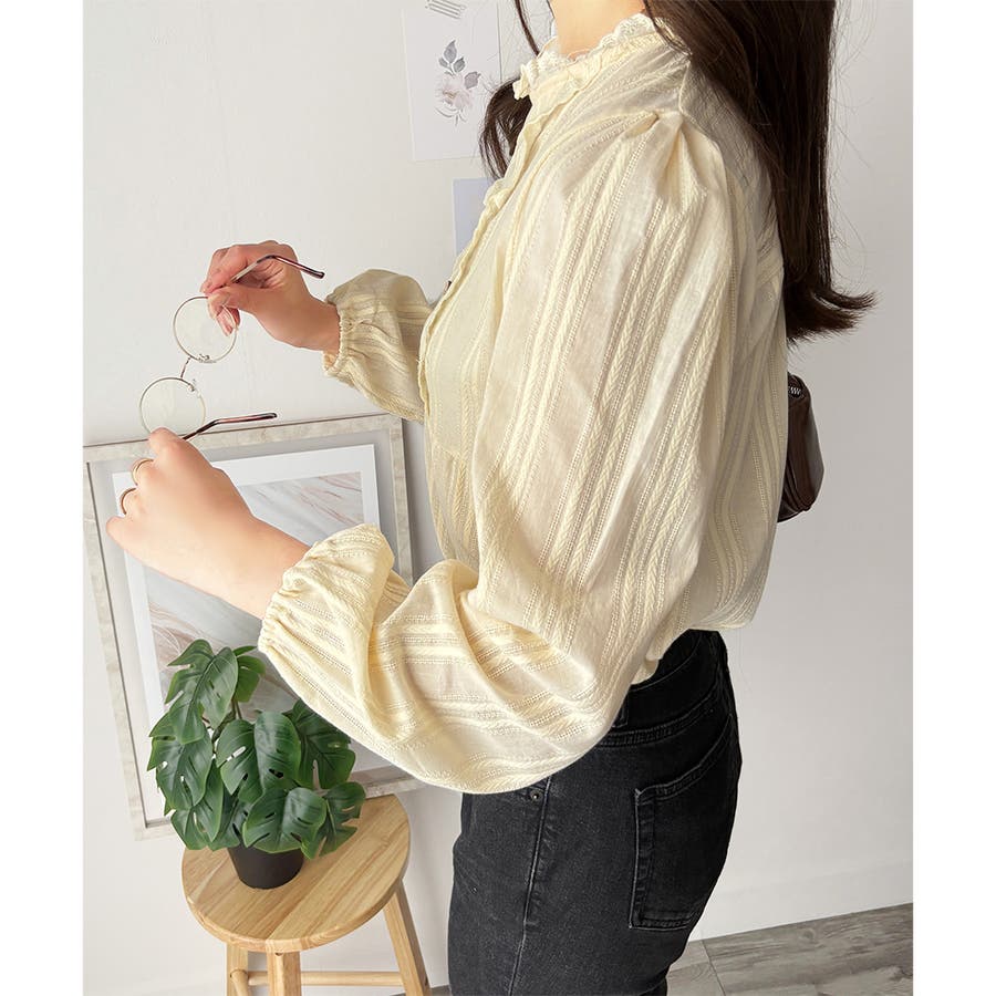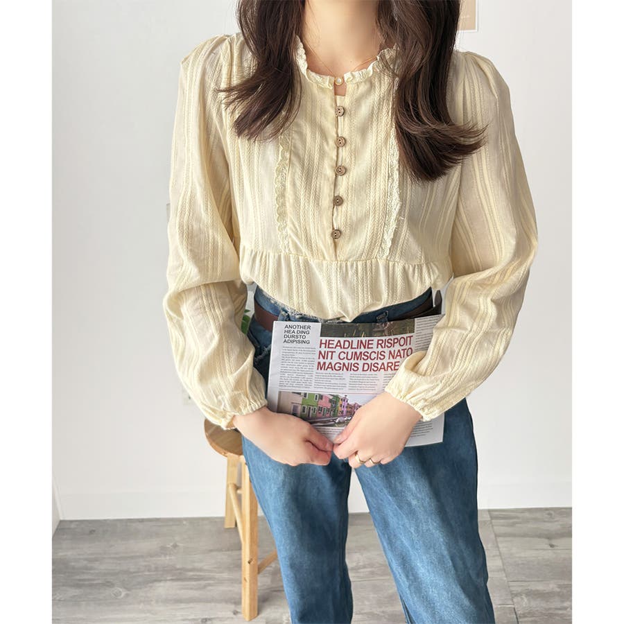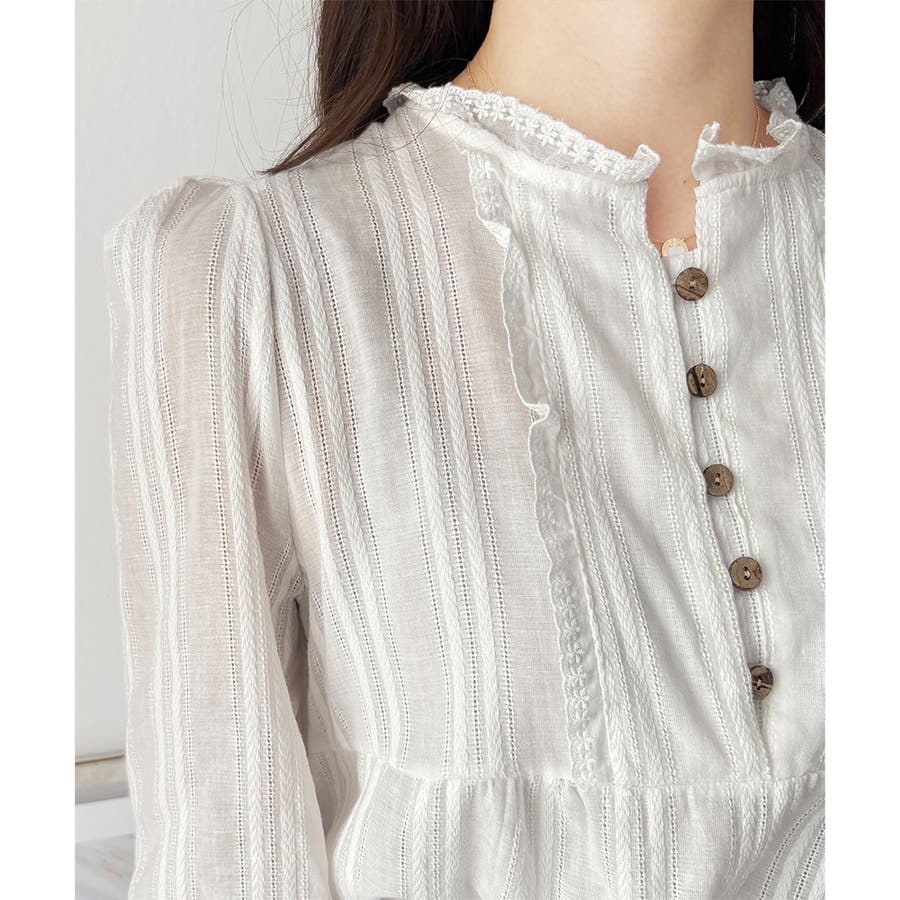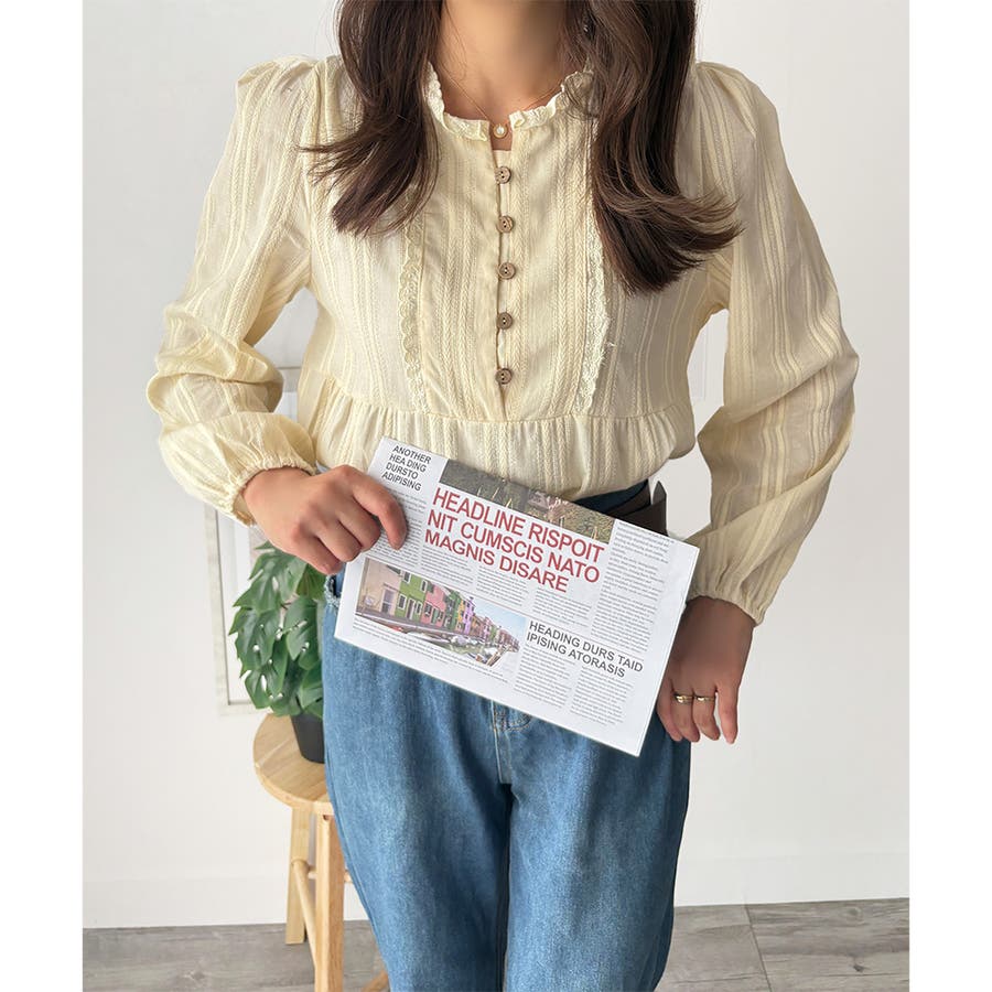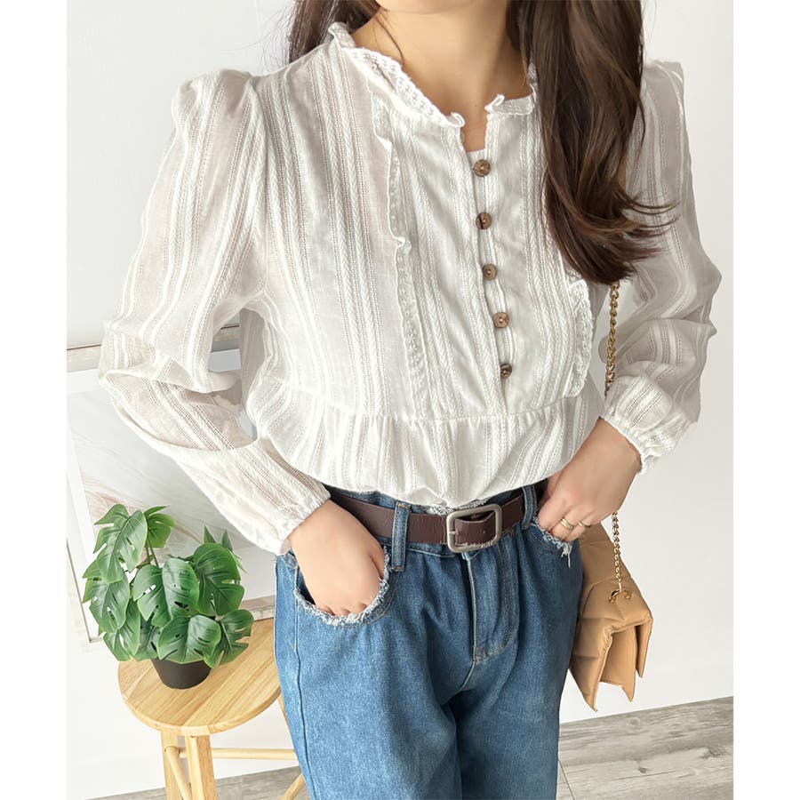 ・レース風の繊細な生地感とフリル使いが印象的な華やかブラウス。涼しげな透け感で軽やかな印象を与えてくれます♪