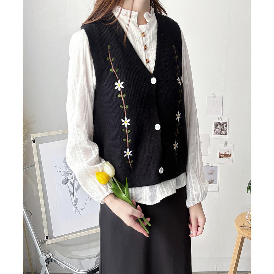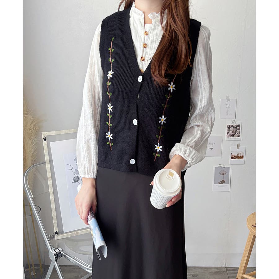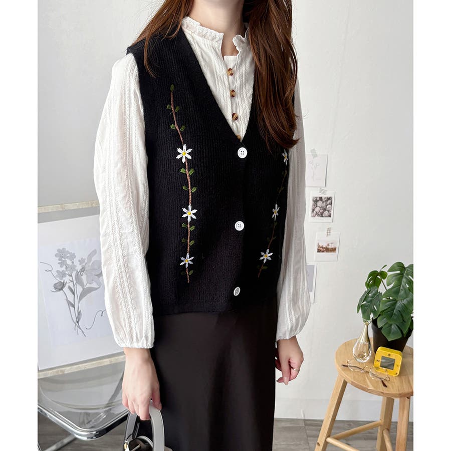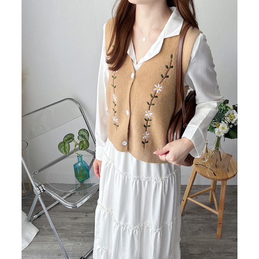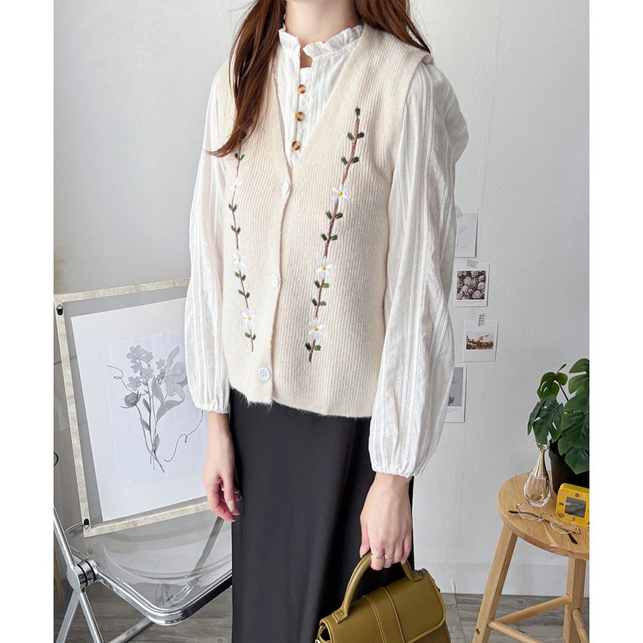 フロントにあしらわれた花柄刺繍が、上品で愛らしい雰囲気を演出◎