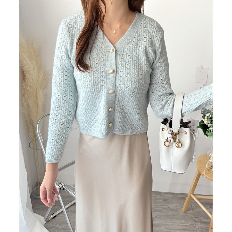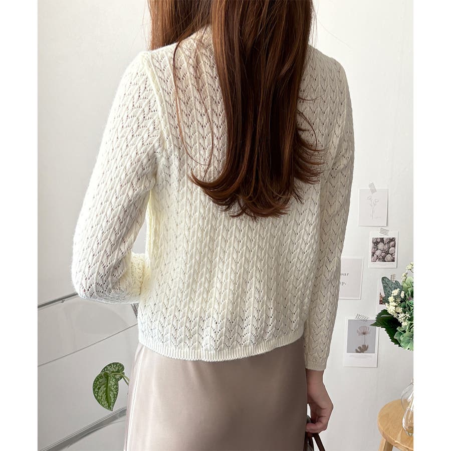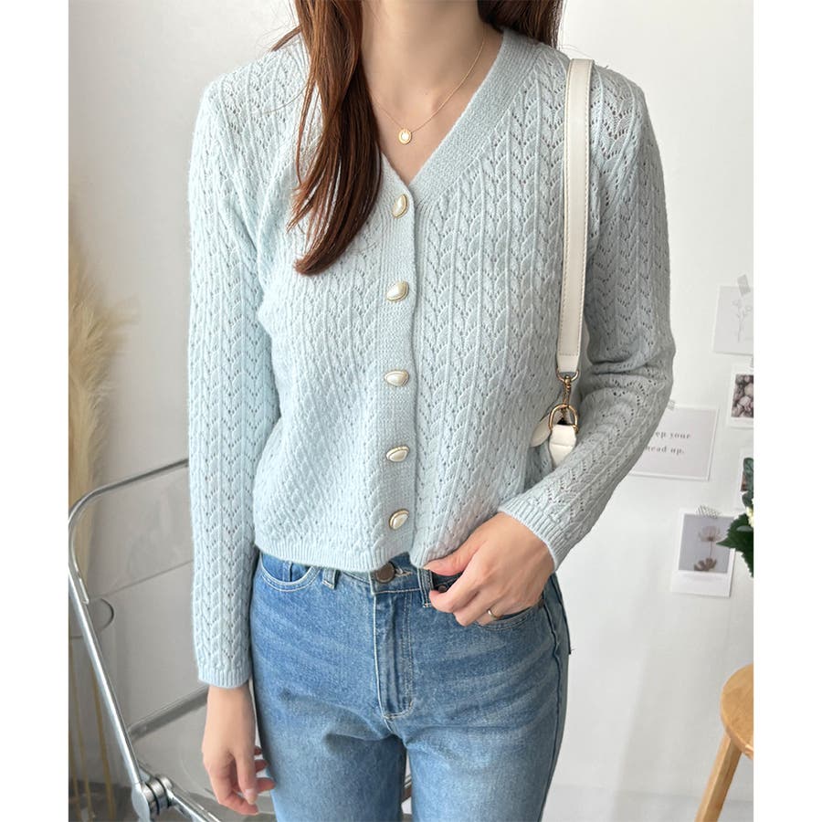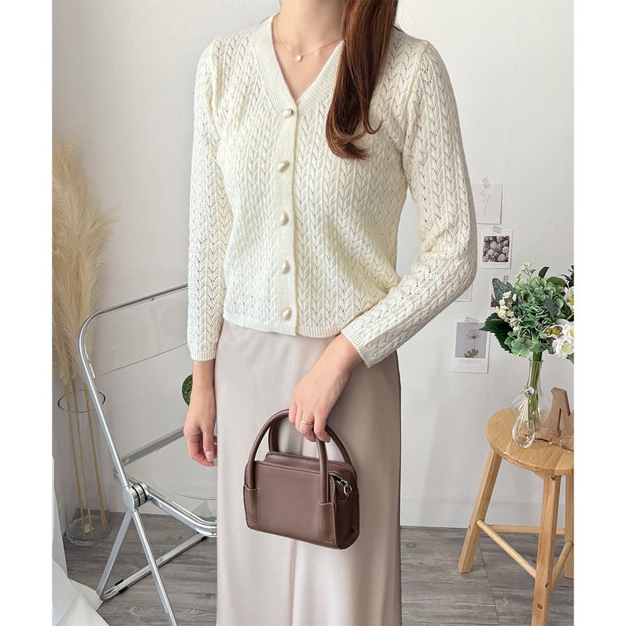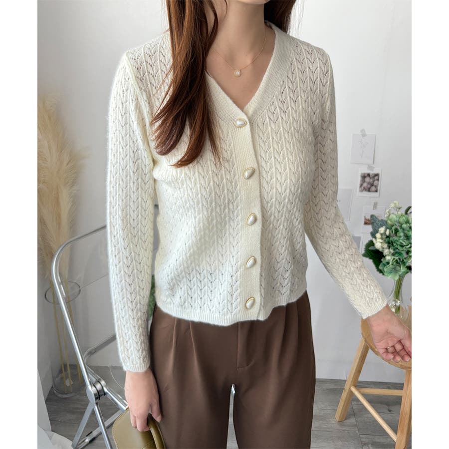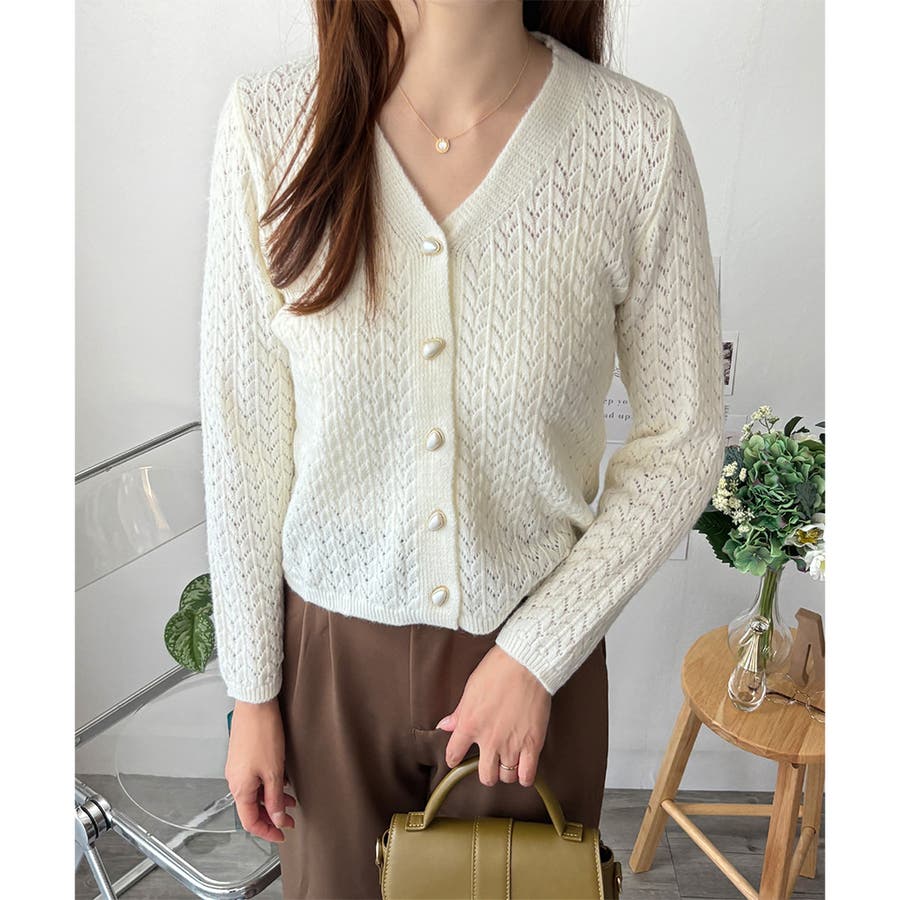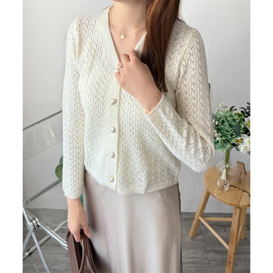 Vネック透かし編みニットカーディガン レディース 長袖