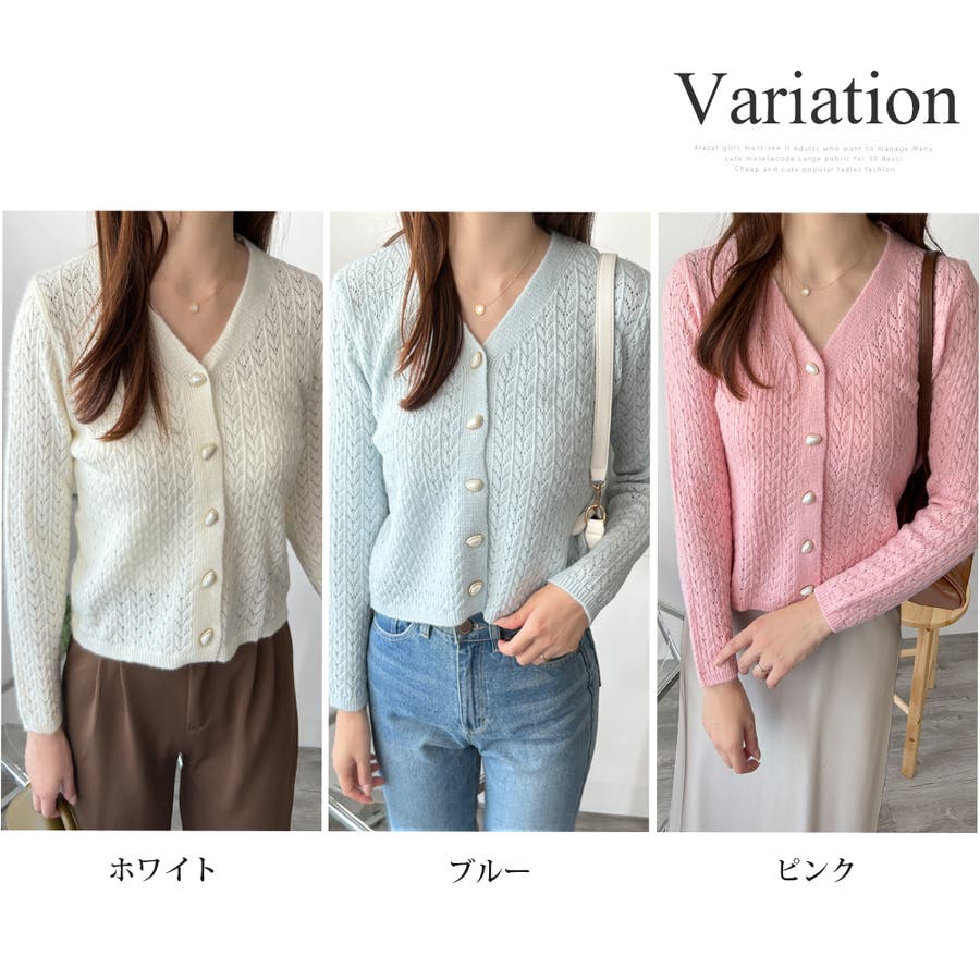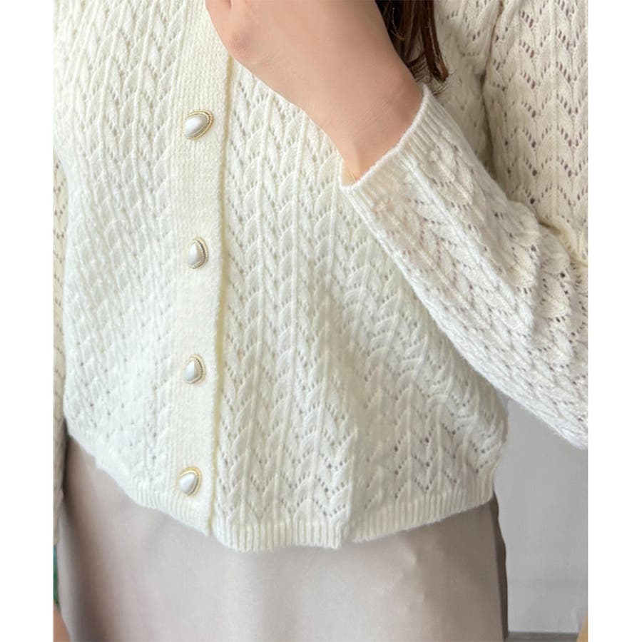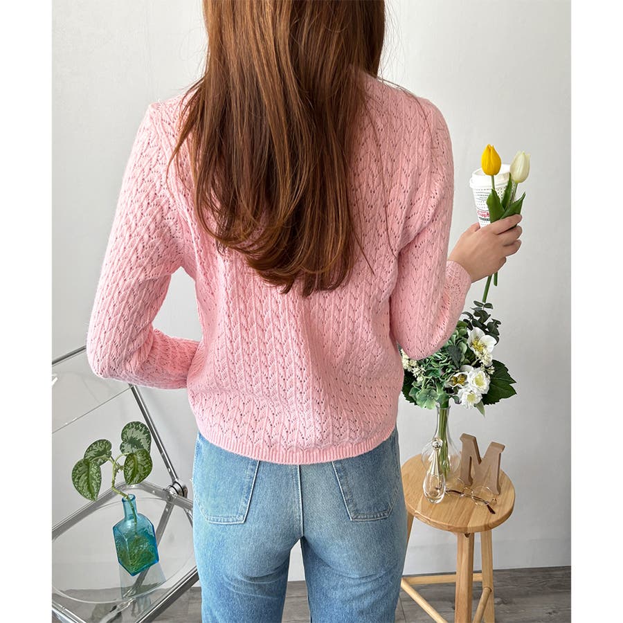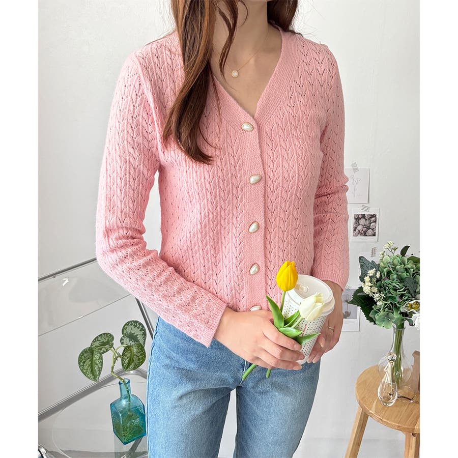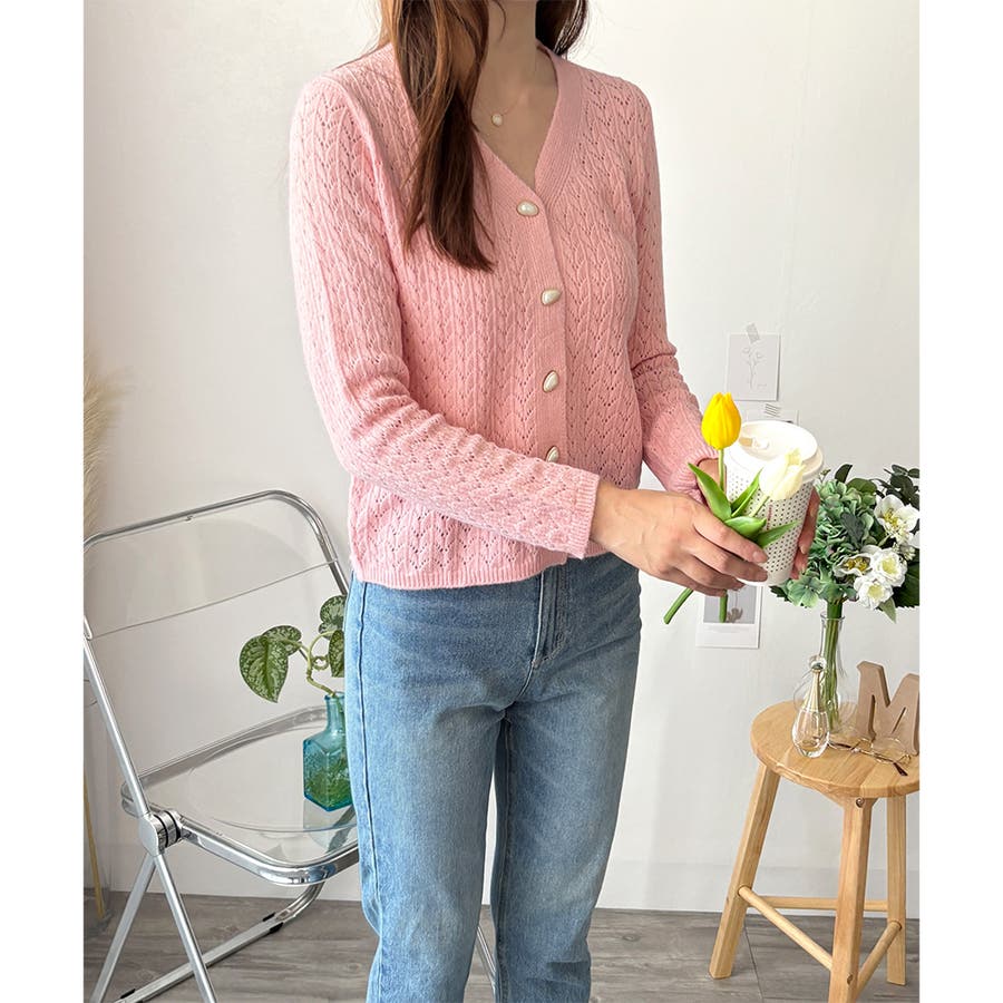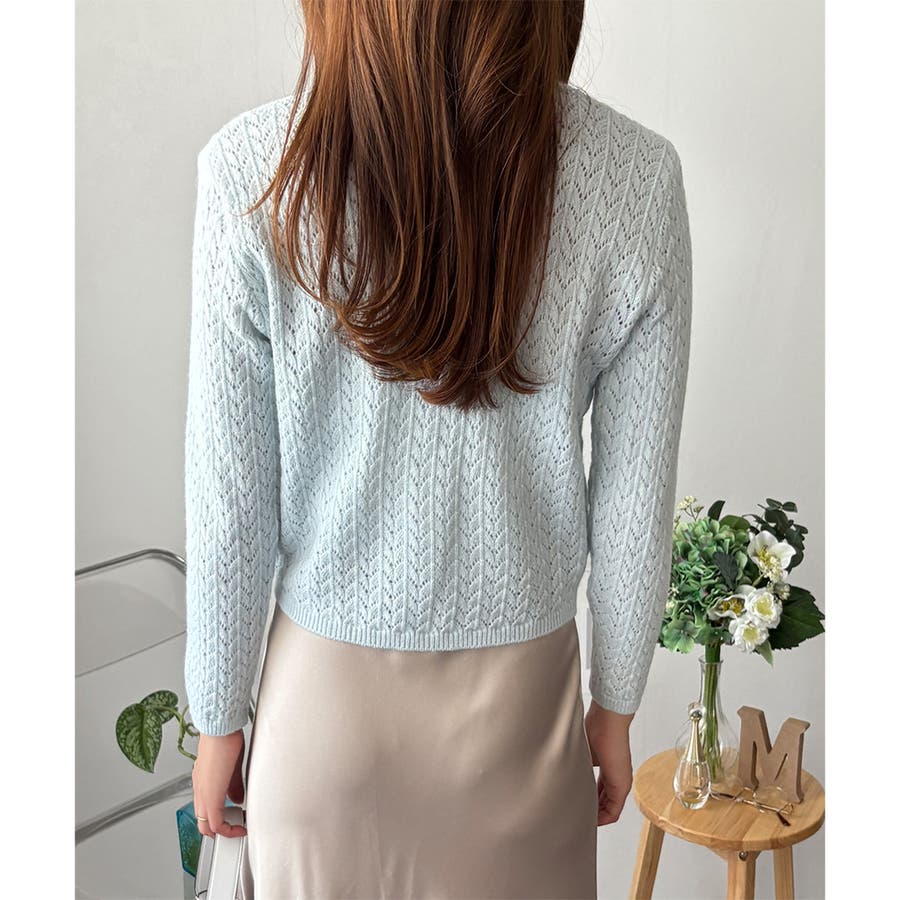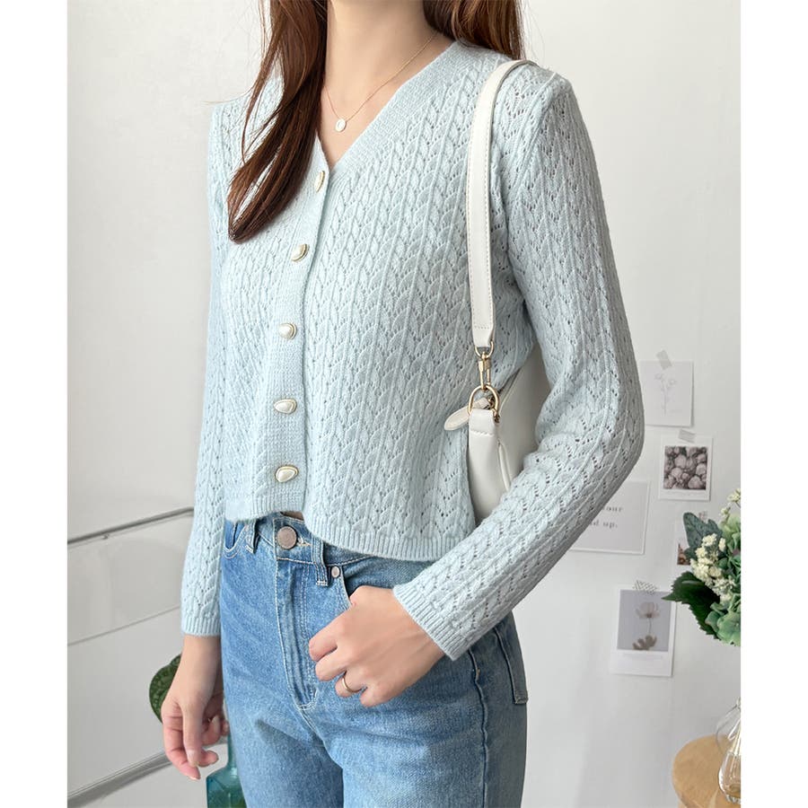Vネック透かし編みニットカーディガン レディース 長袖
