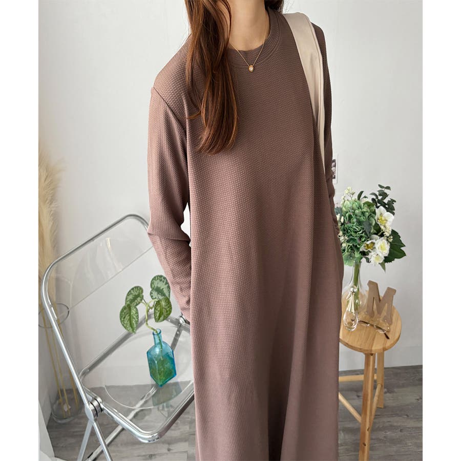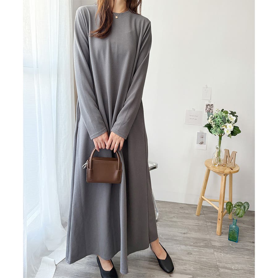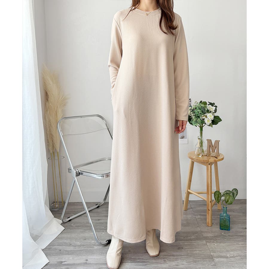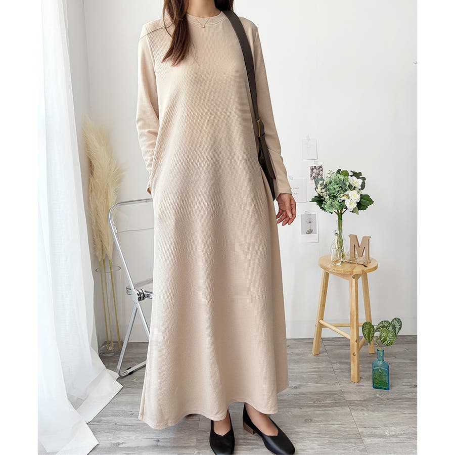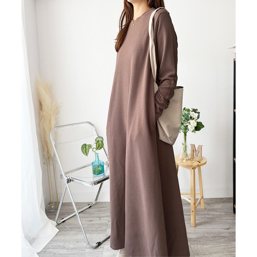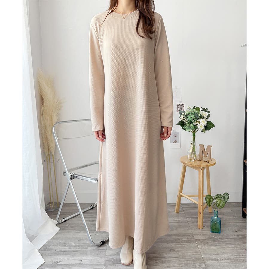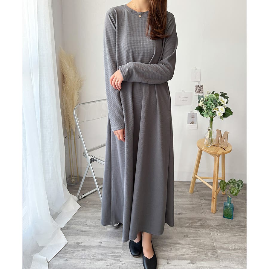 ワッフル風ロングワンピース レディース 長袖
