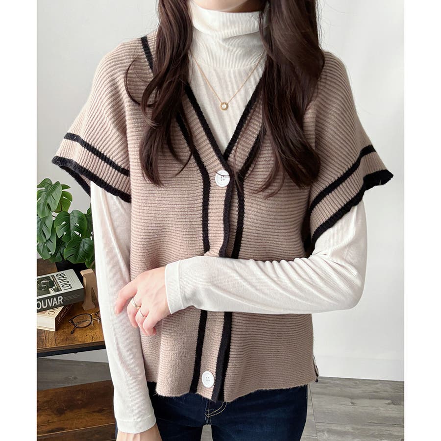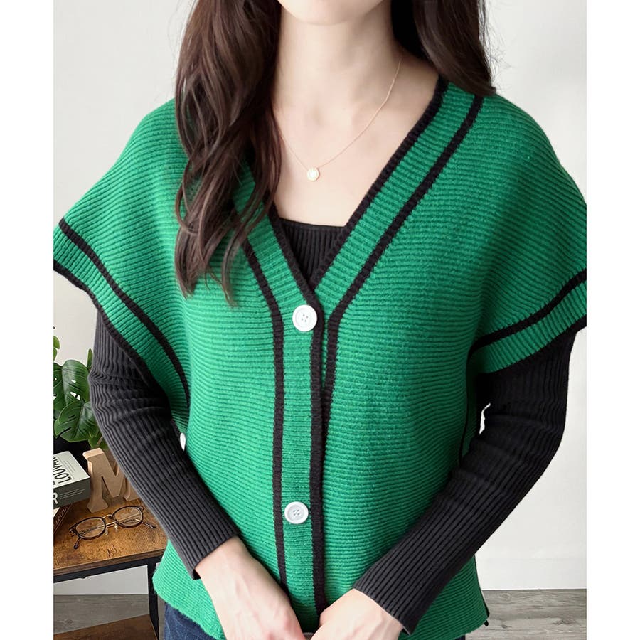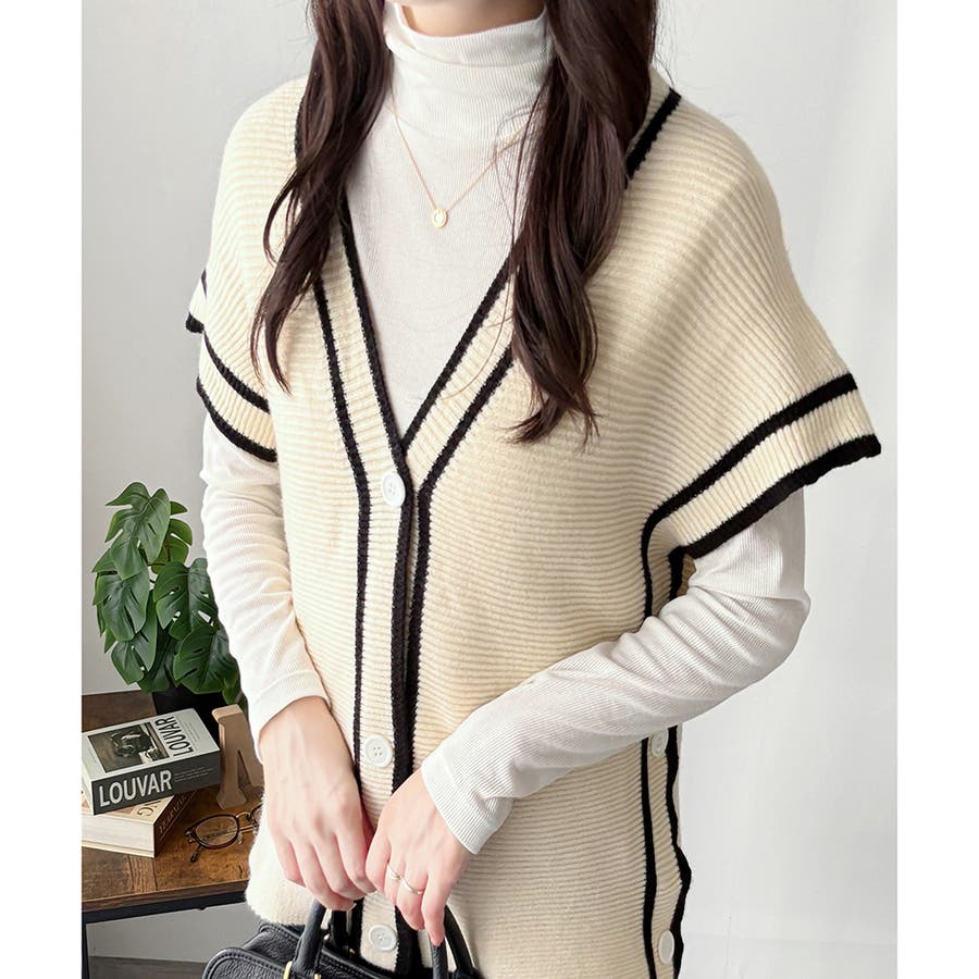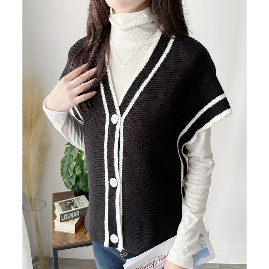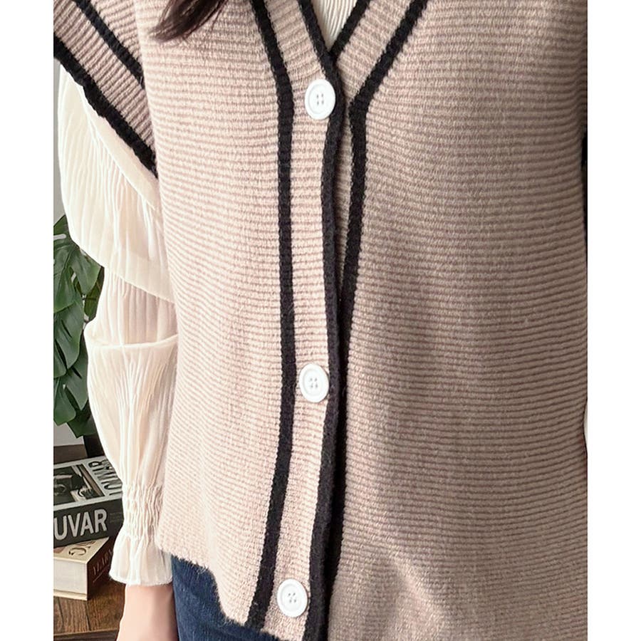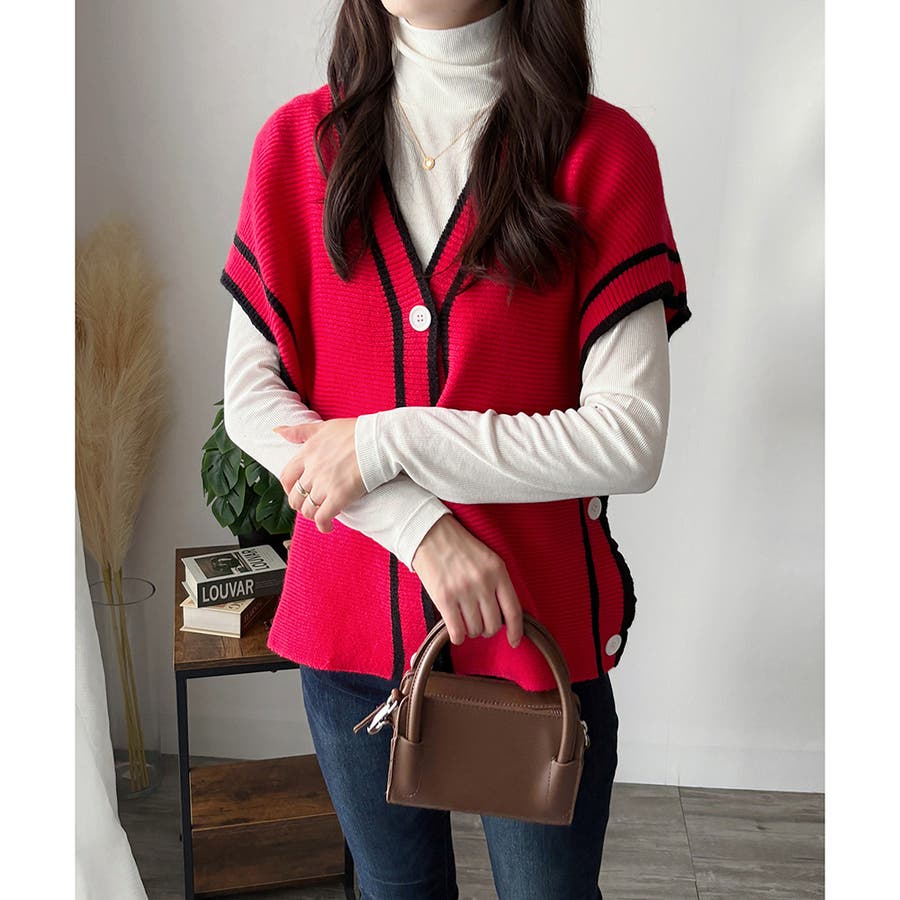配色ラインVネックボタンニットベスト きれいめ レディース