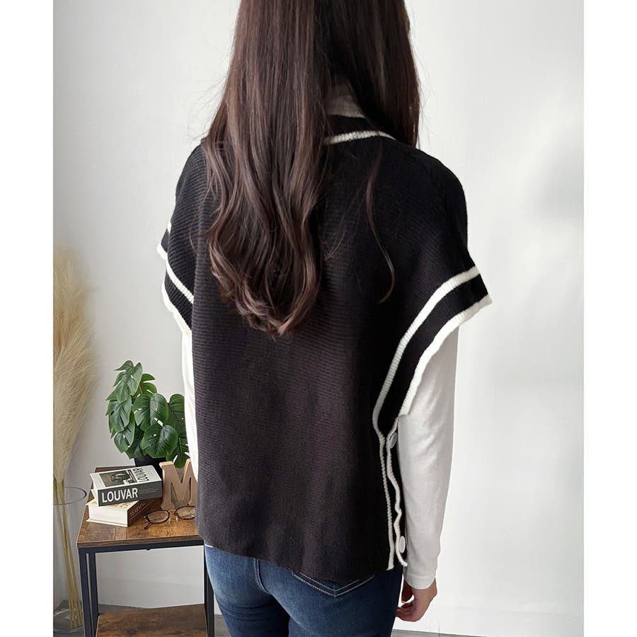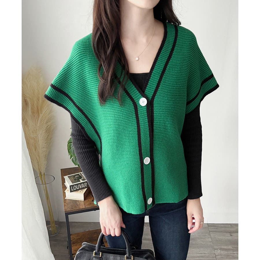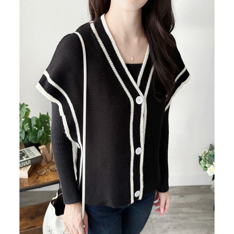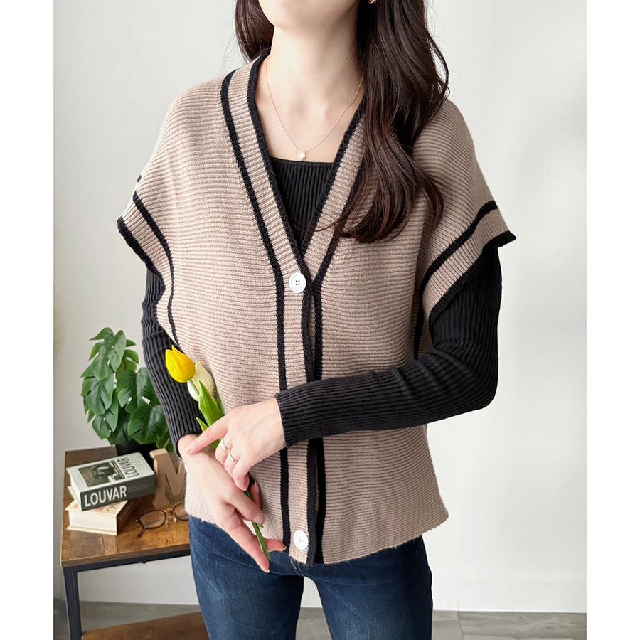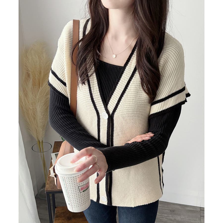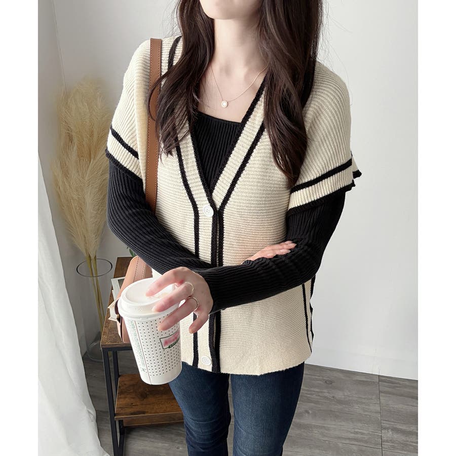 配色ラインVネックボタンニットベスト きれいめ レディース