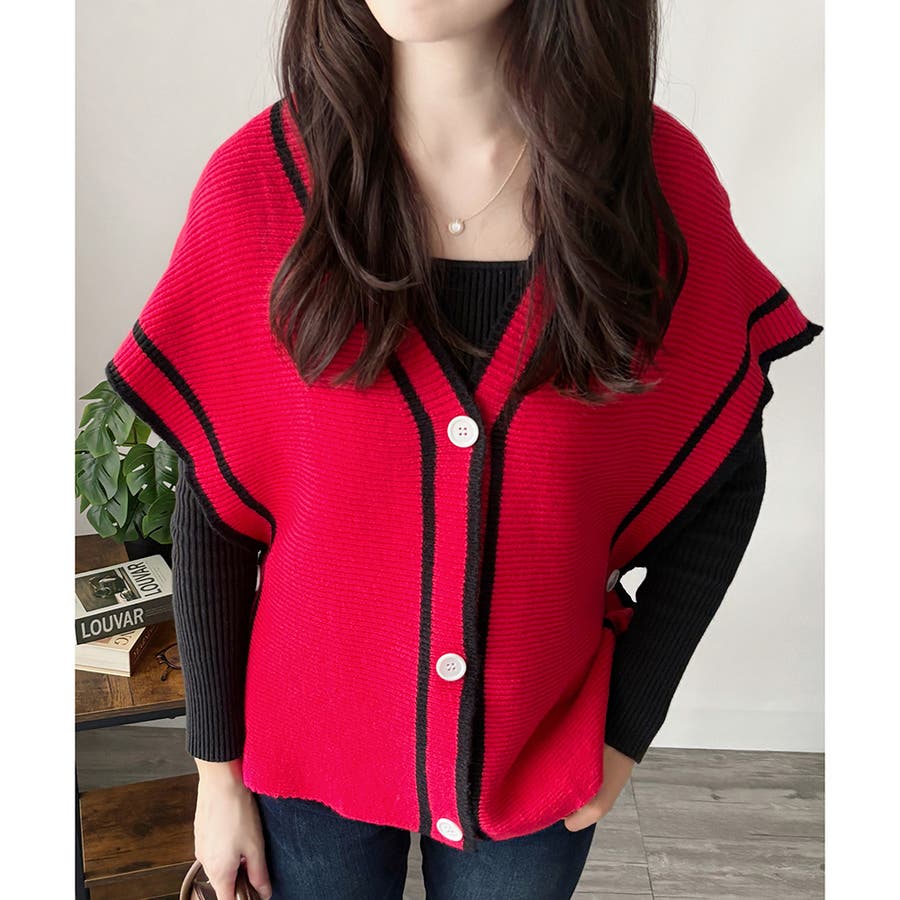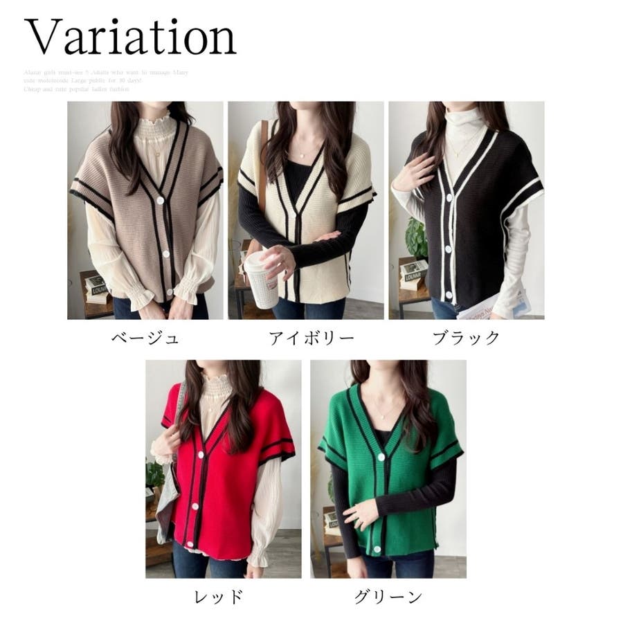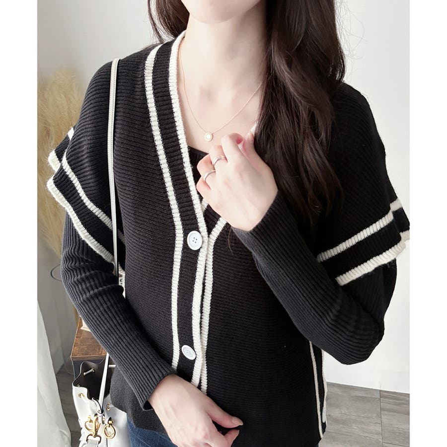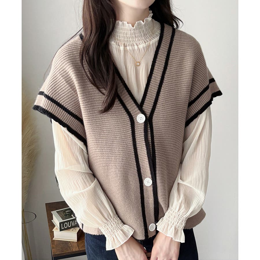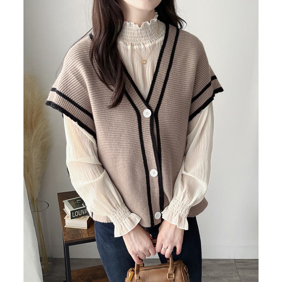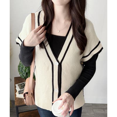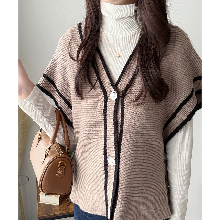配色ラインVネックボタンニットベスト きれいめ レディース