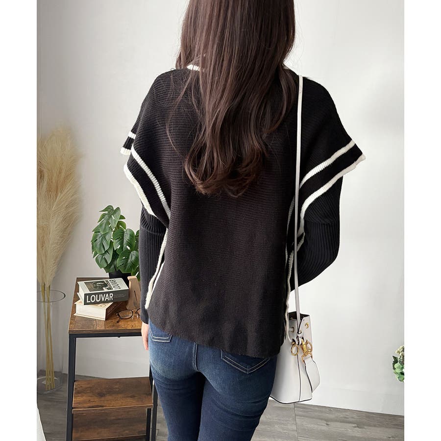 シンプルなVネックに、ラインがアクセントとなり上品な印象を与えます。