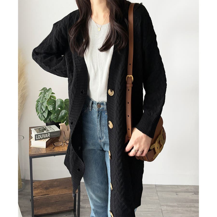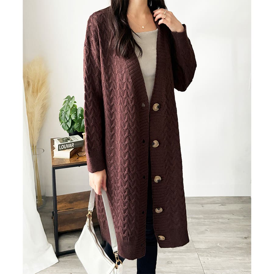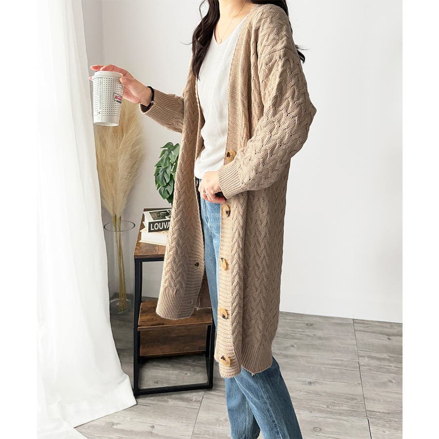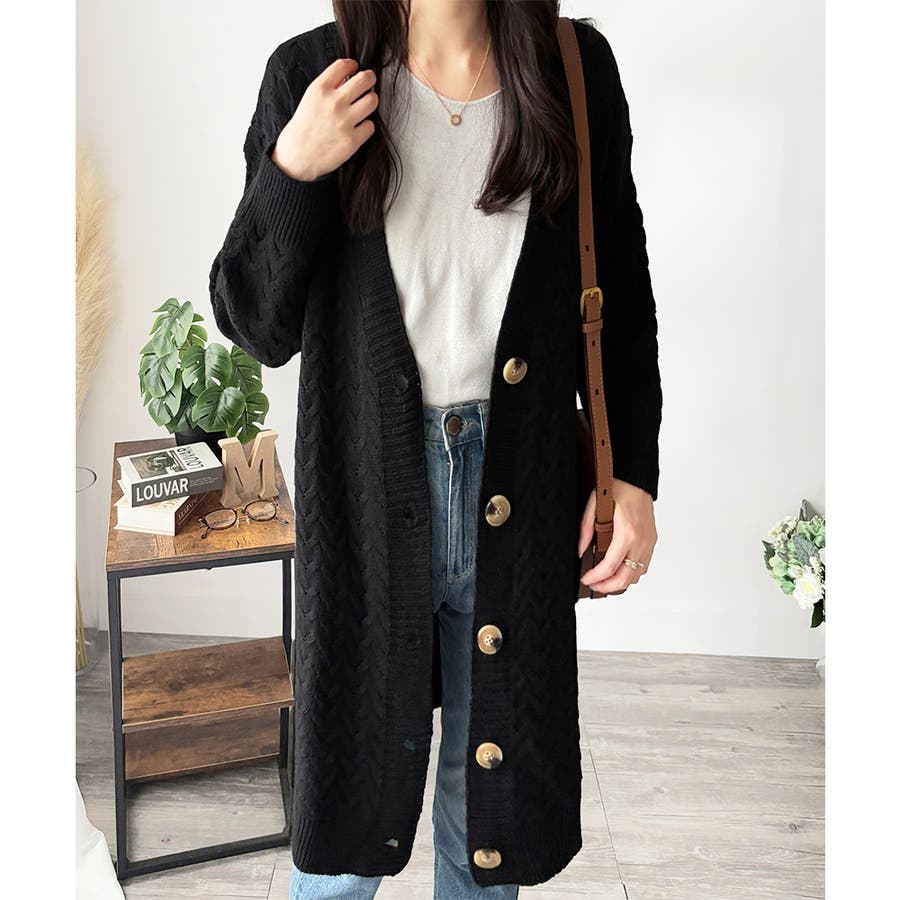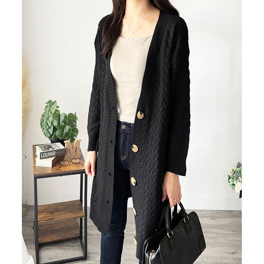 深めのVネックと大きめボタンが特徴的なロング丈カーディガンです。