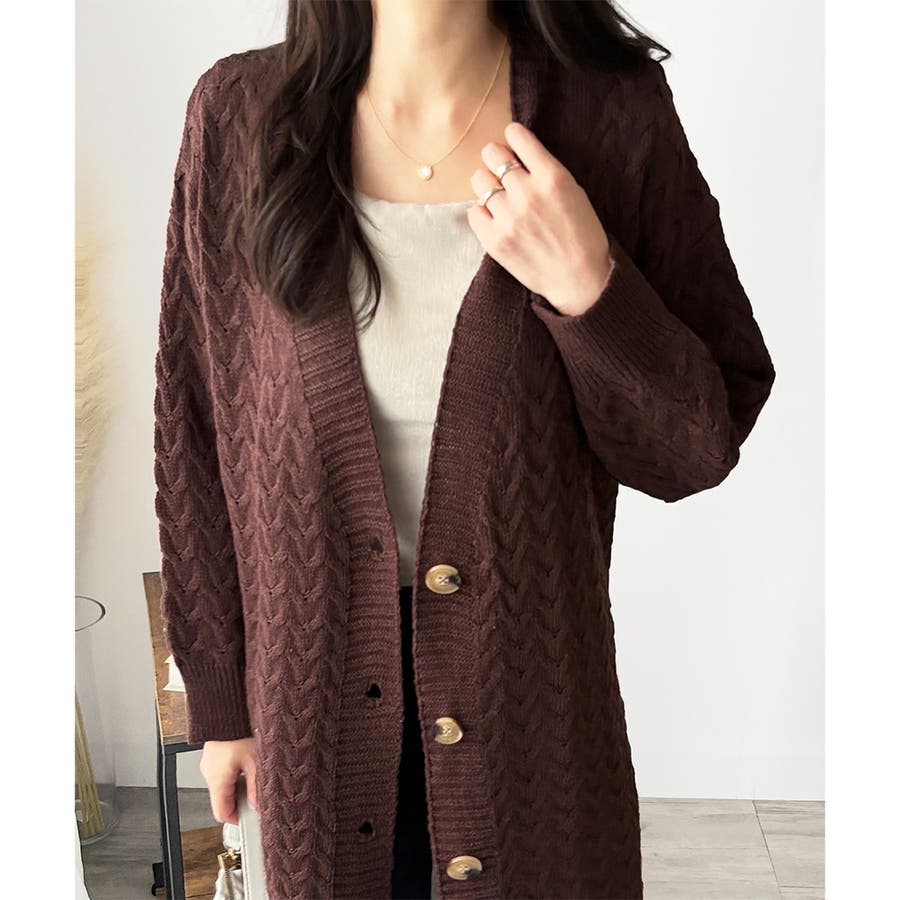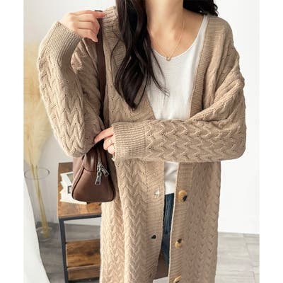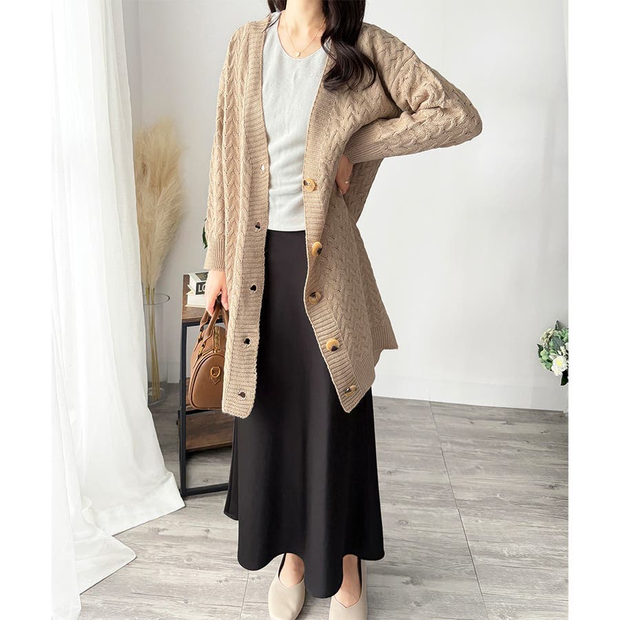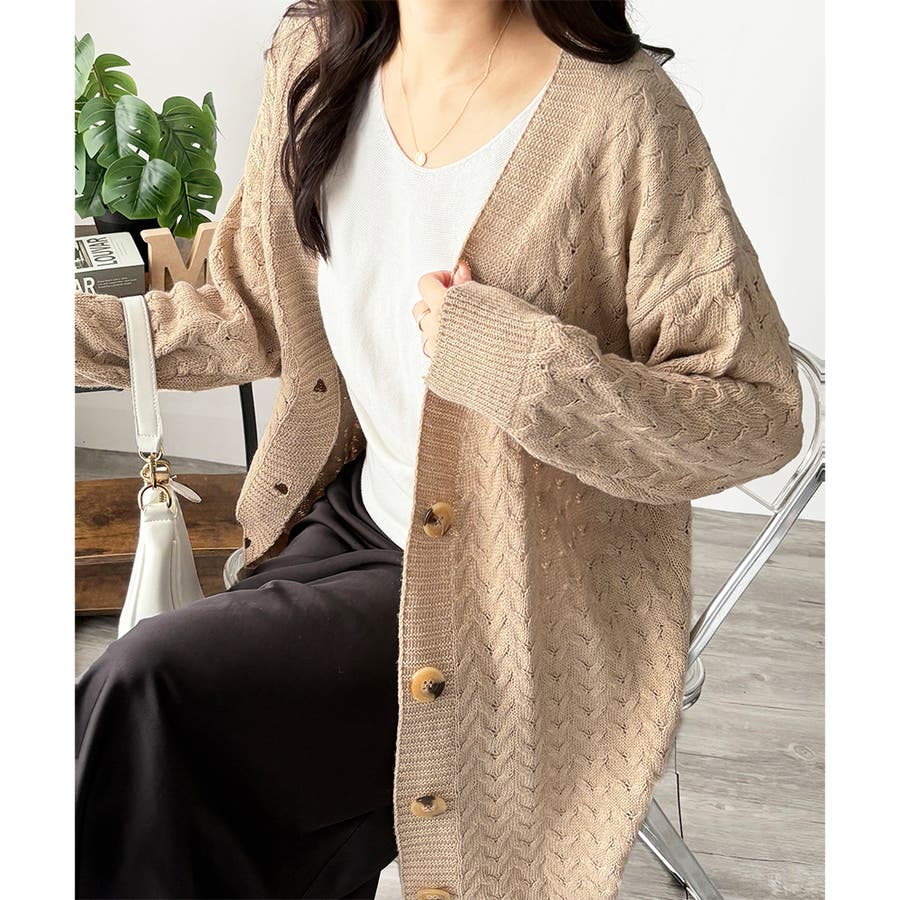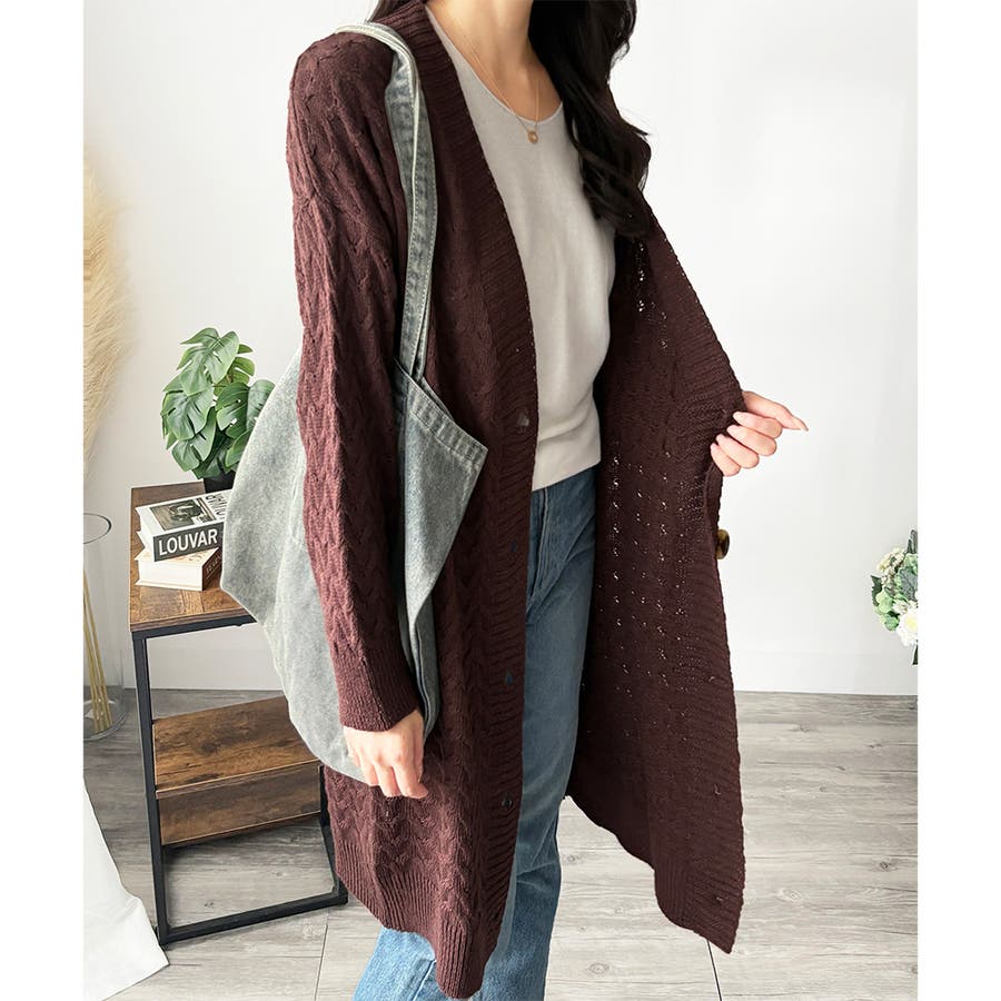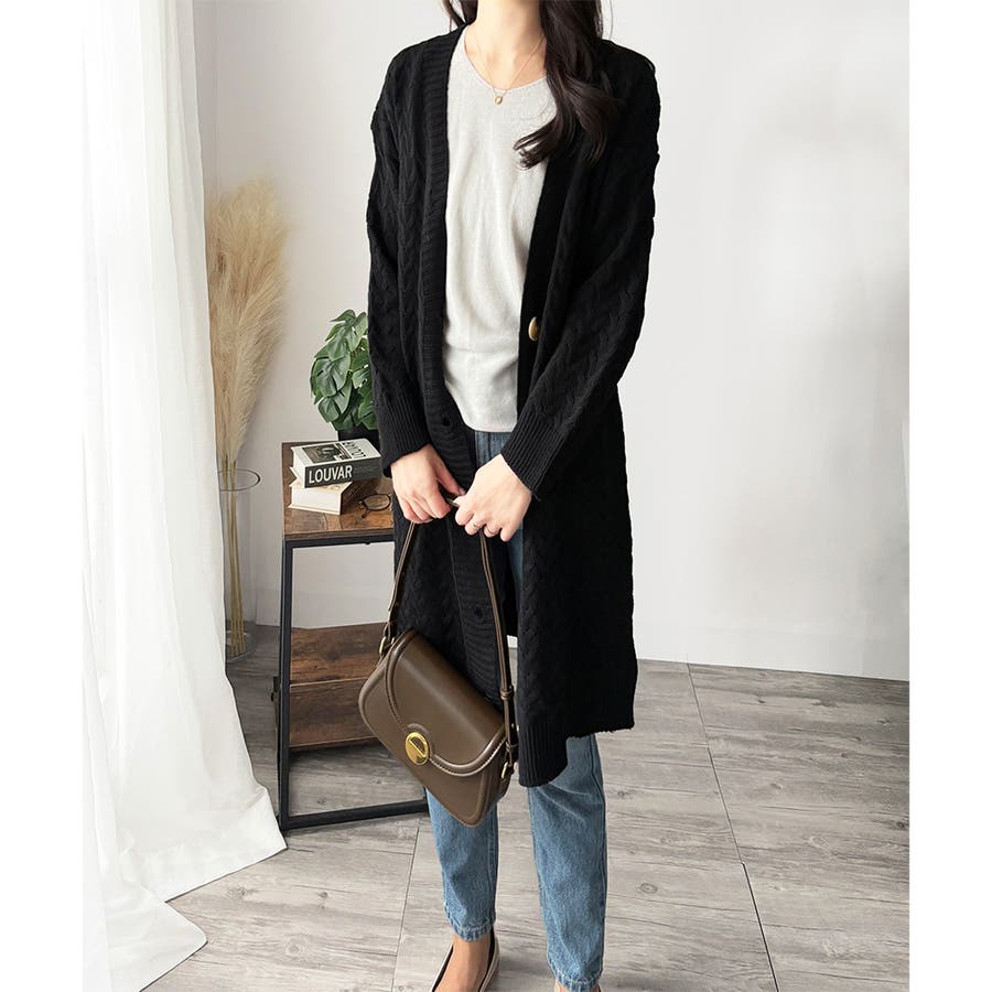 深めのVネックと大きめボタンが特徴的なロング丈カーディガンです。