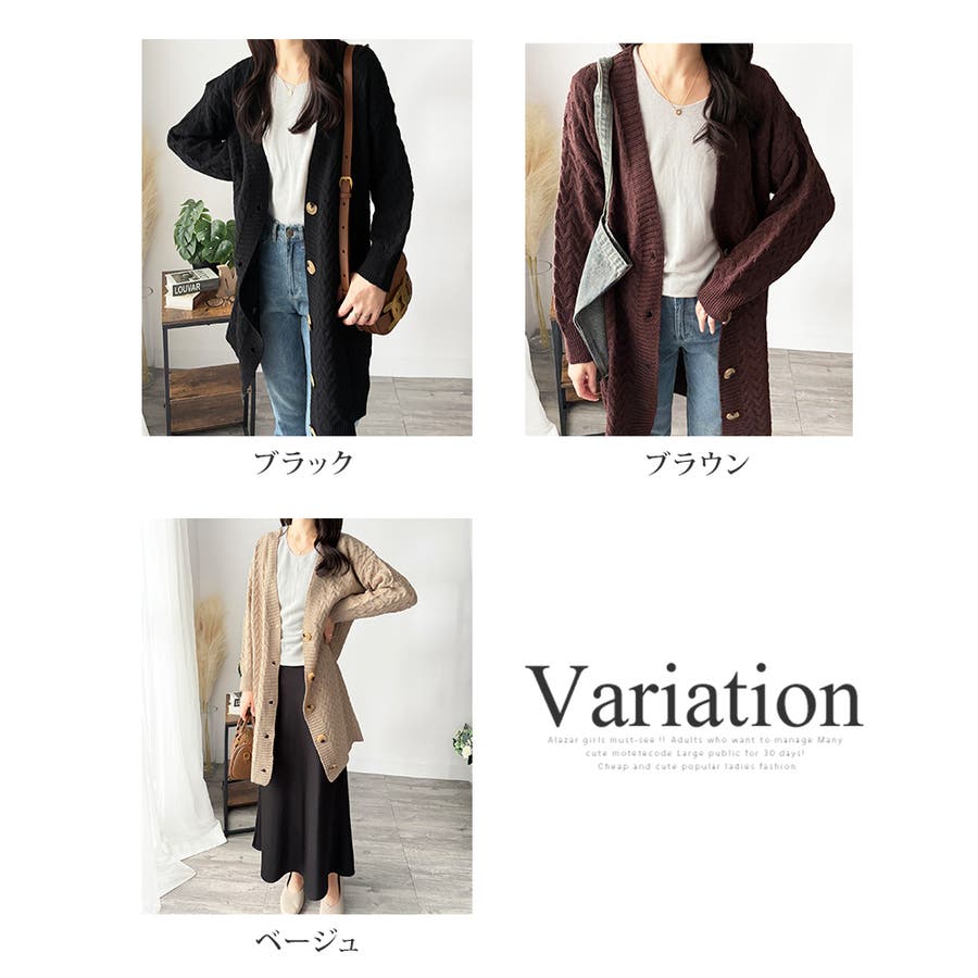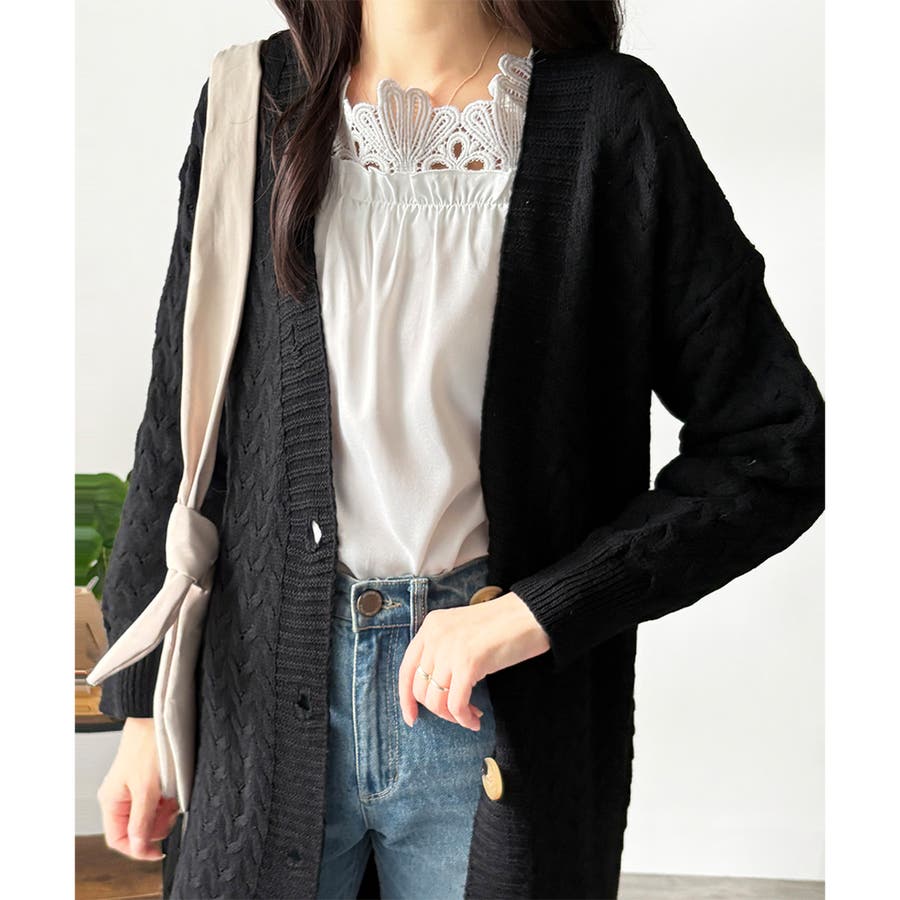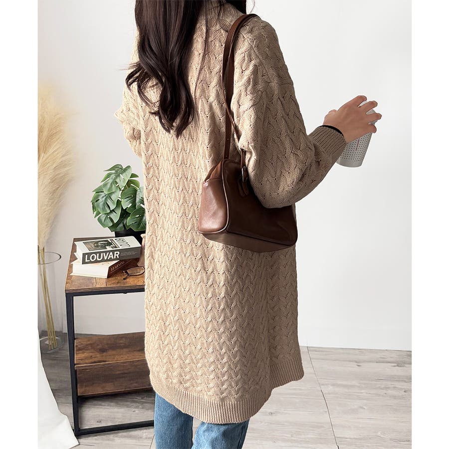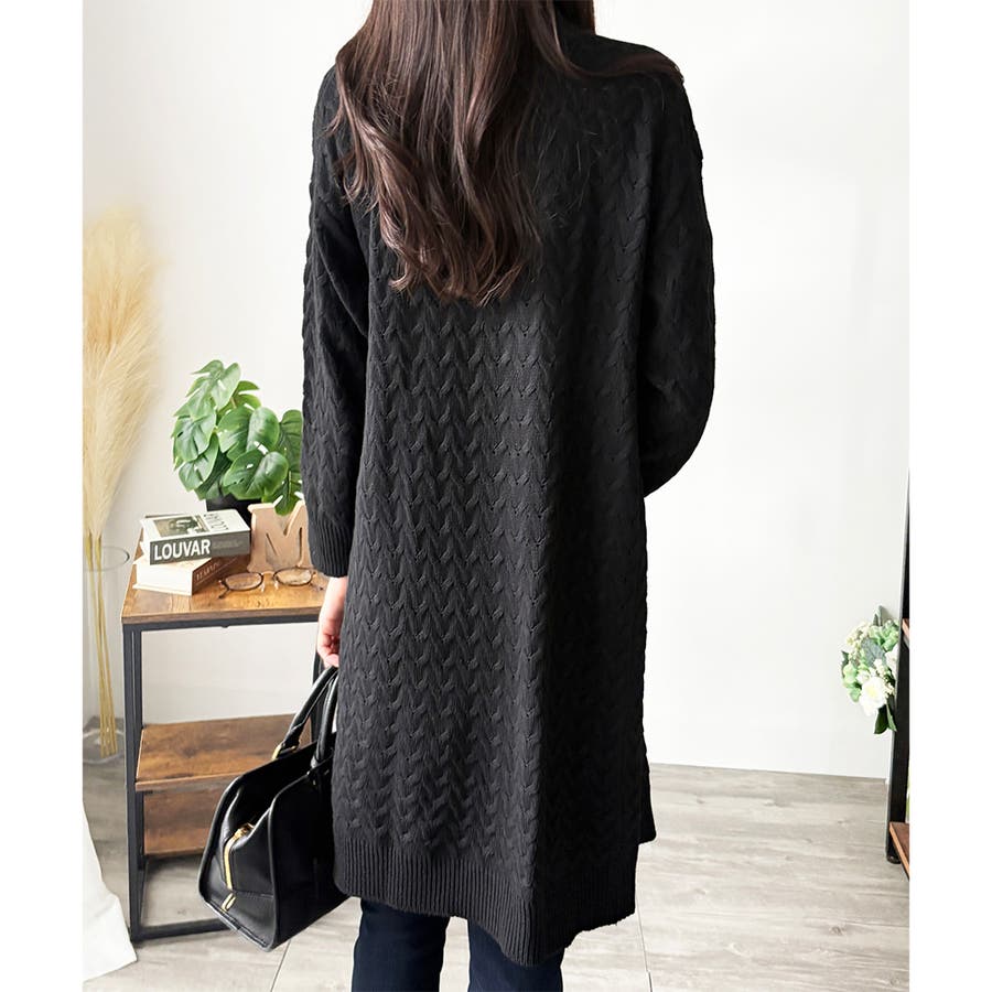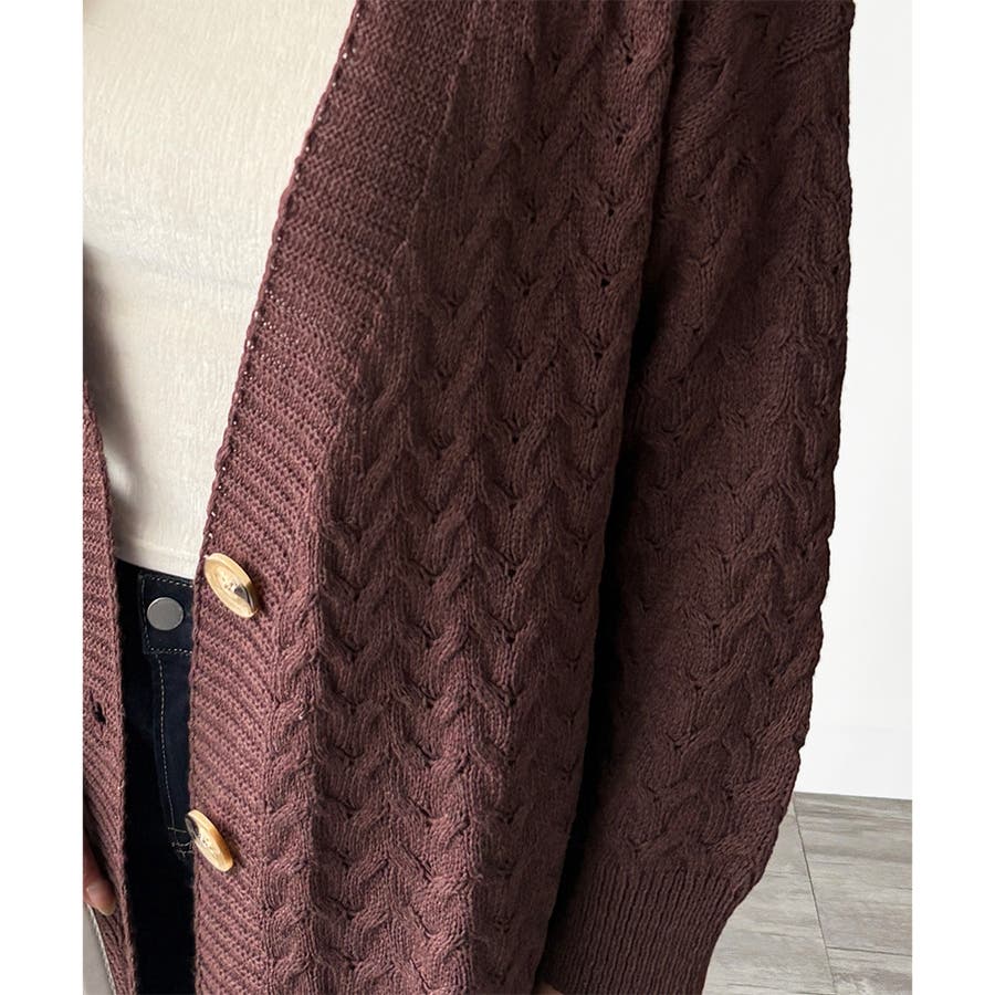 深めのVネックと大きめボタンが特徴的なロング丈カーディガンです。