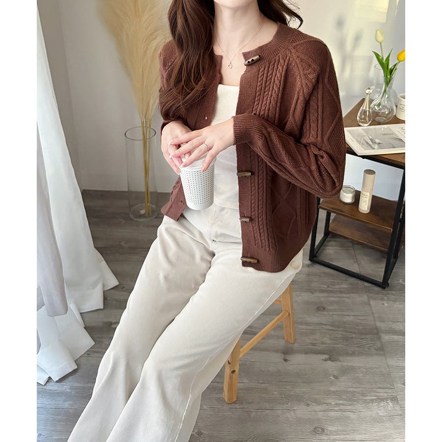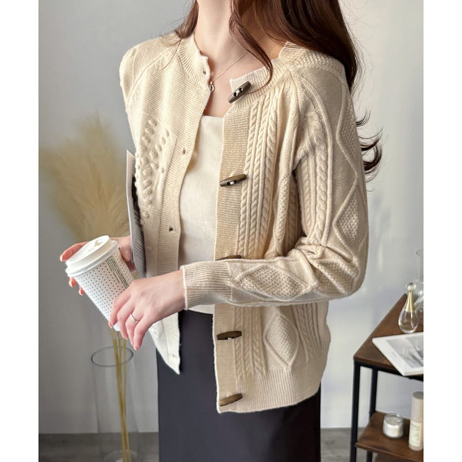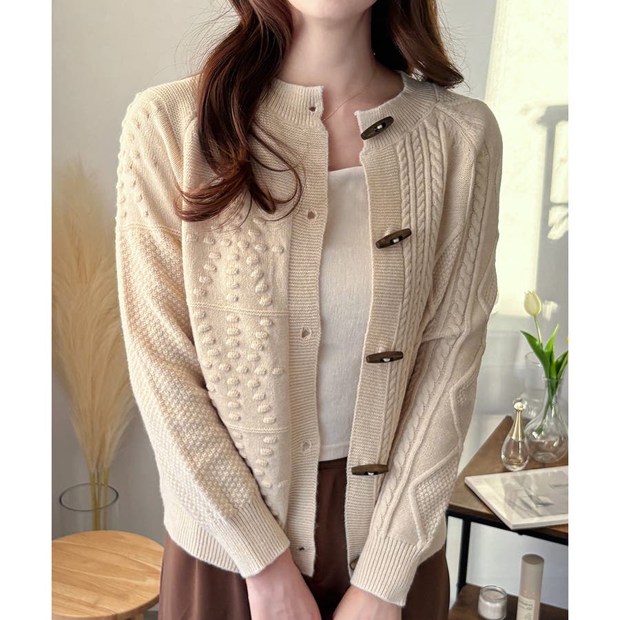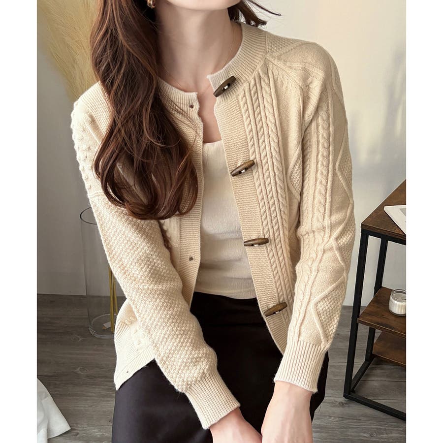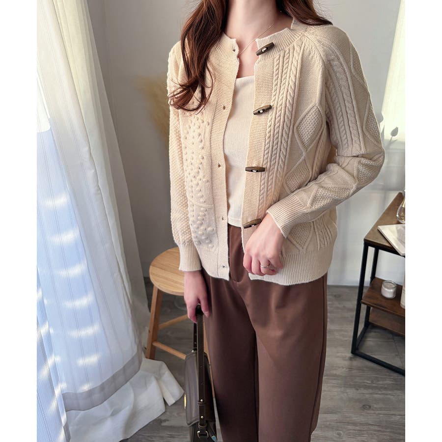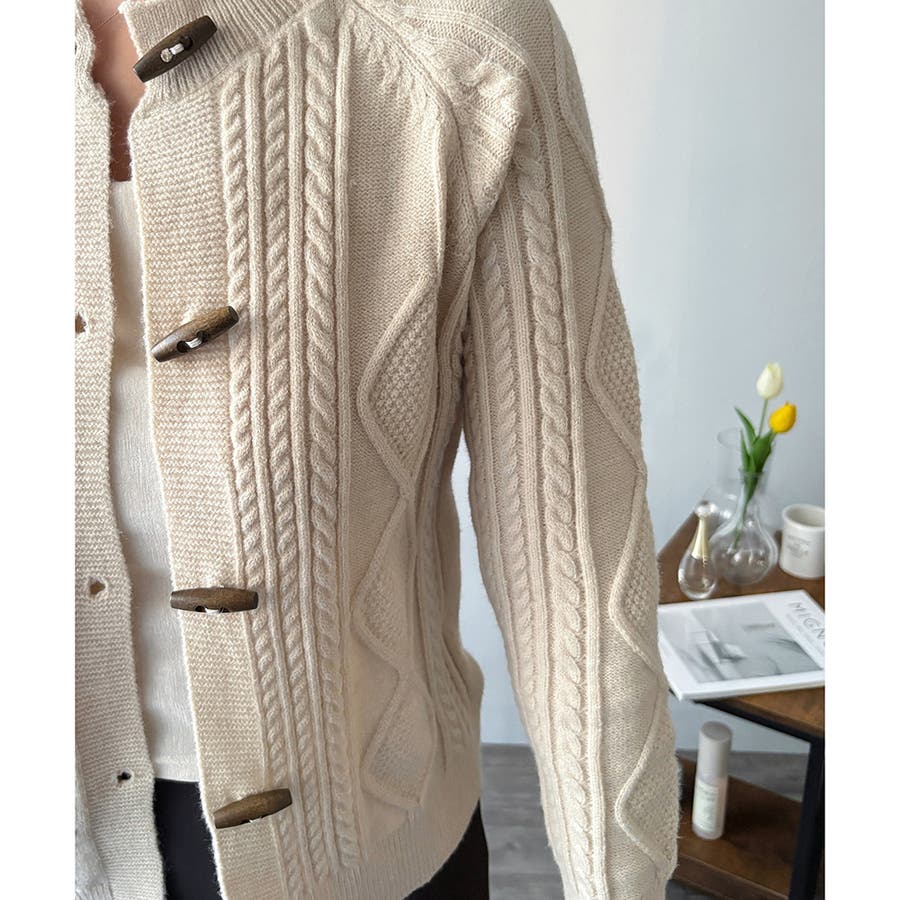 木調のトグルボタンがアクセントになった、温かみのあるナチュラルカーディガン。