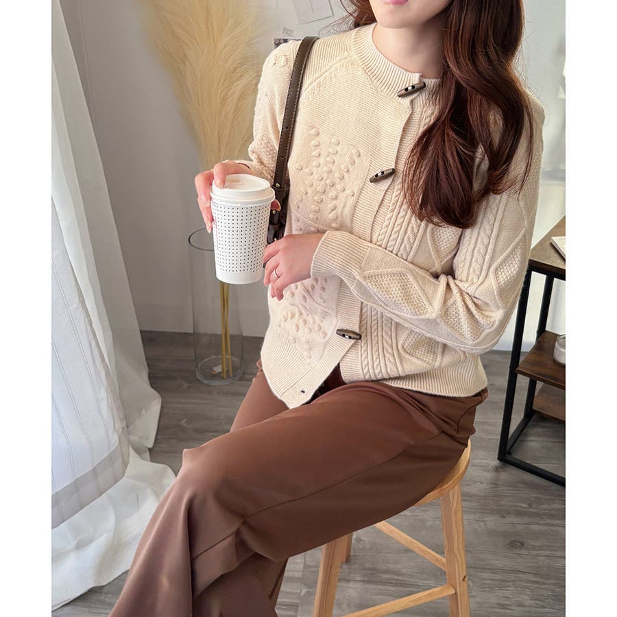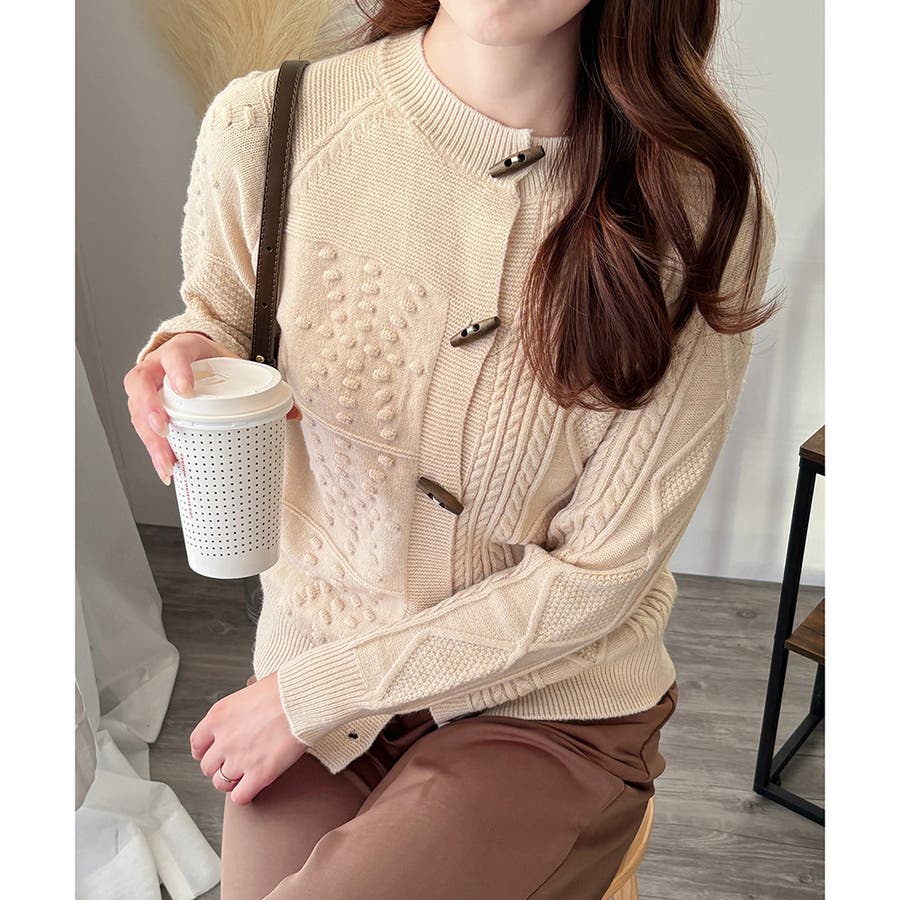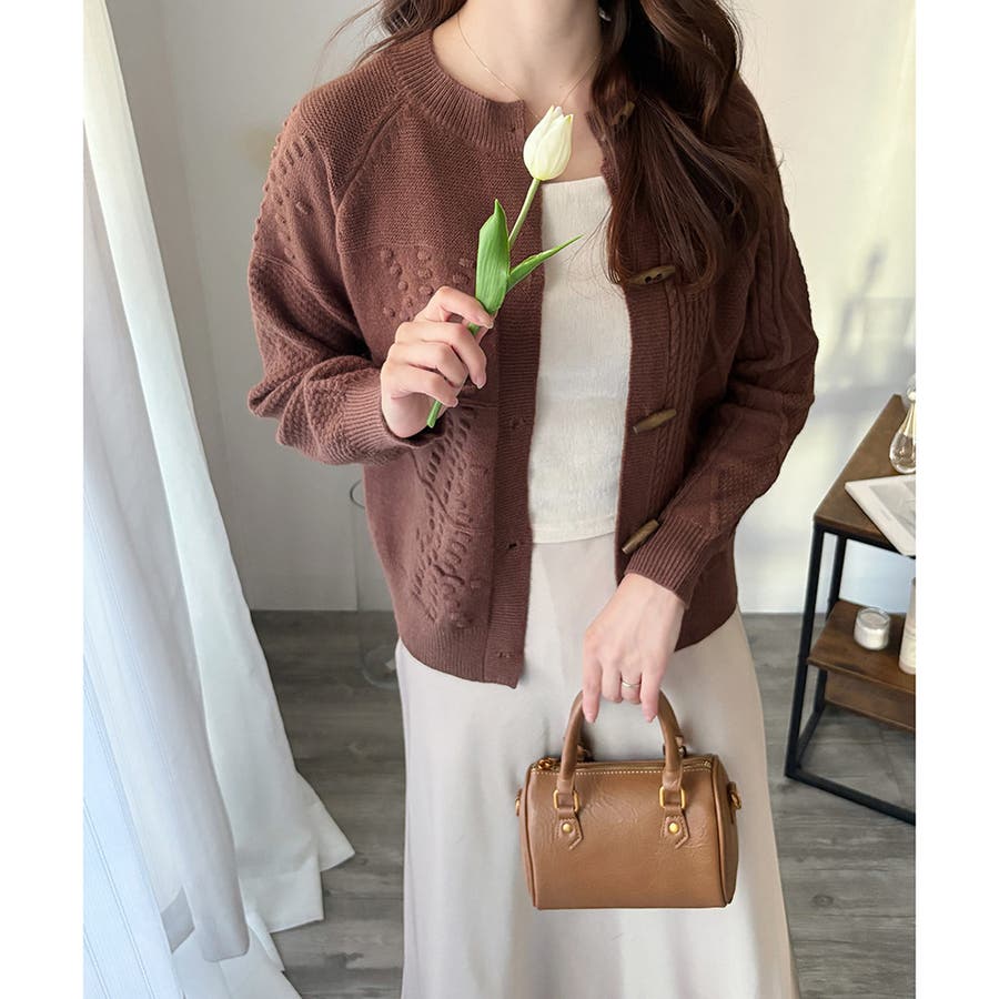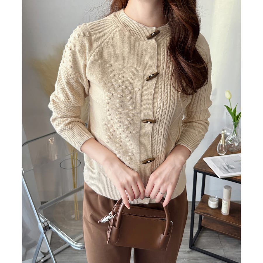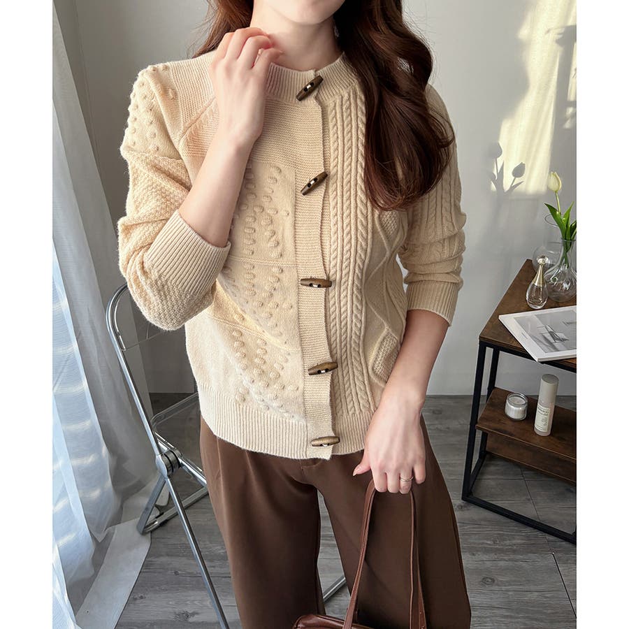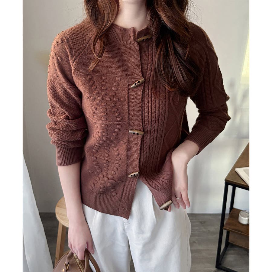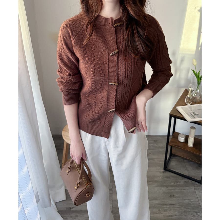 木調のトグルボタンがアクセントになった、温かみのあるナチュラルカーディガン。