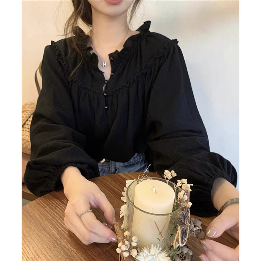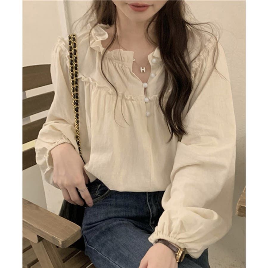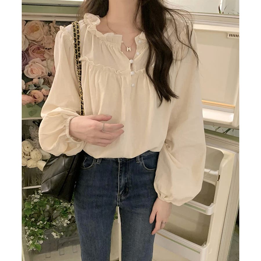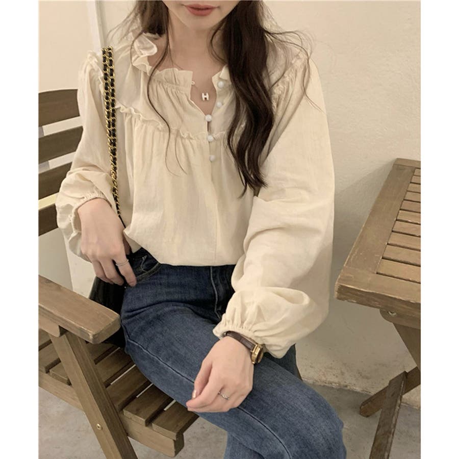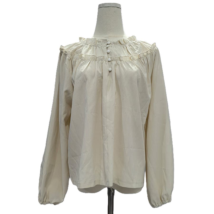 首元のフリルがほどよい甘さを添える、大人可愛いブラウス◎