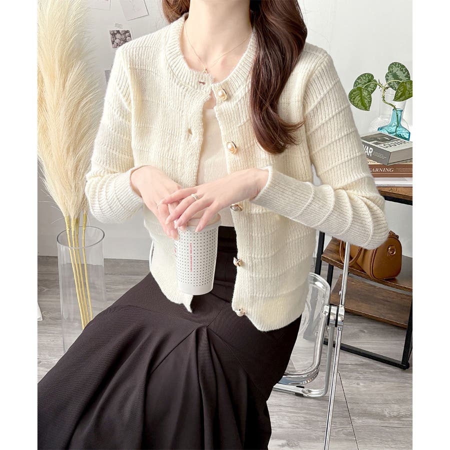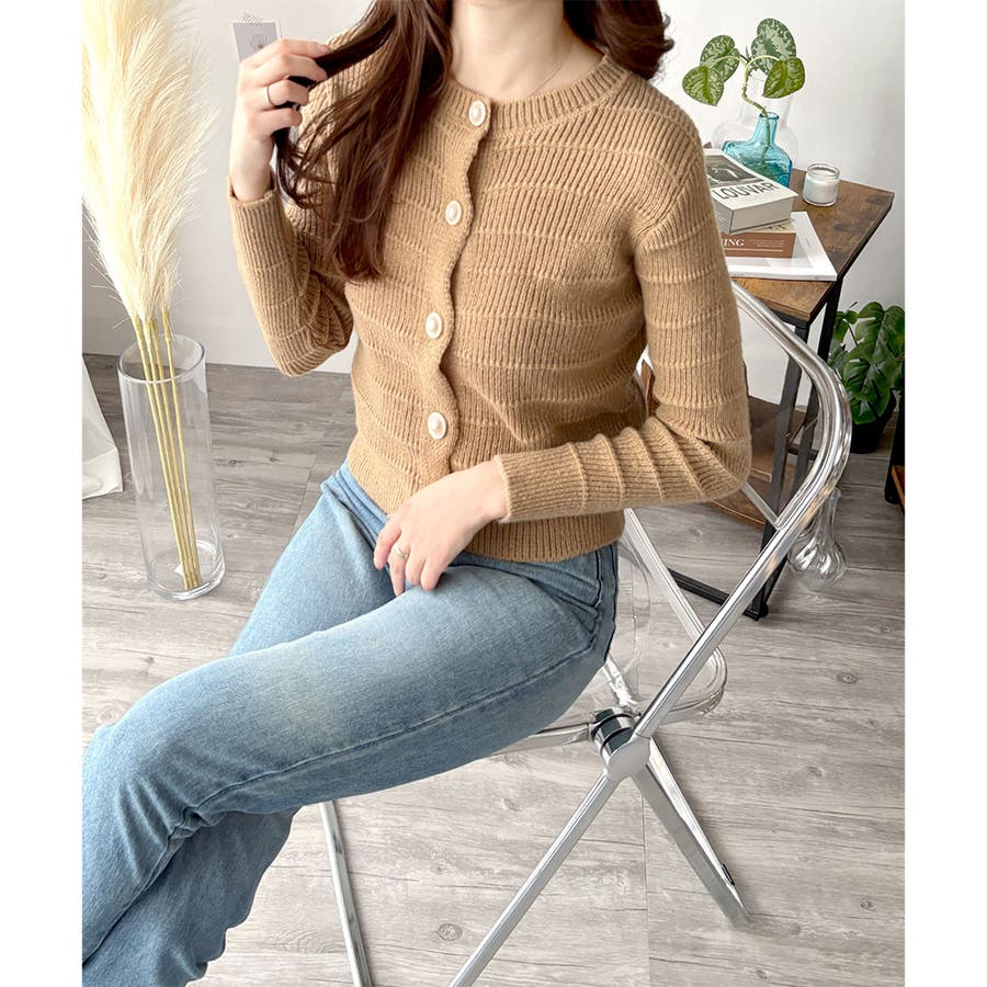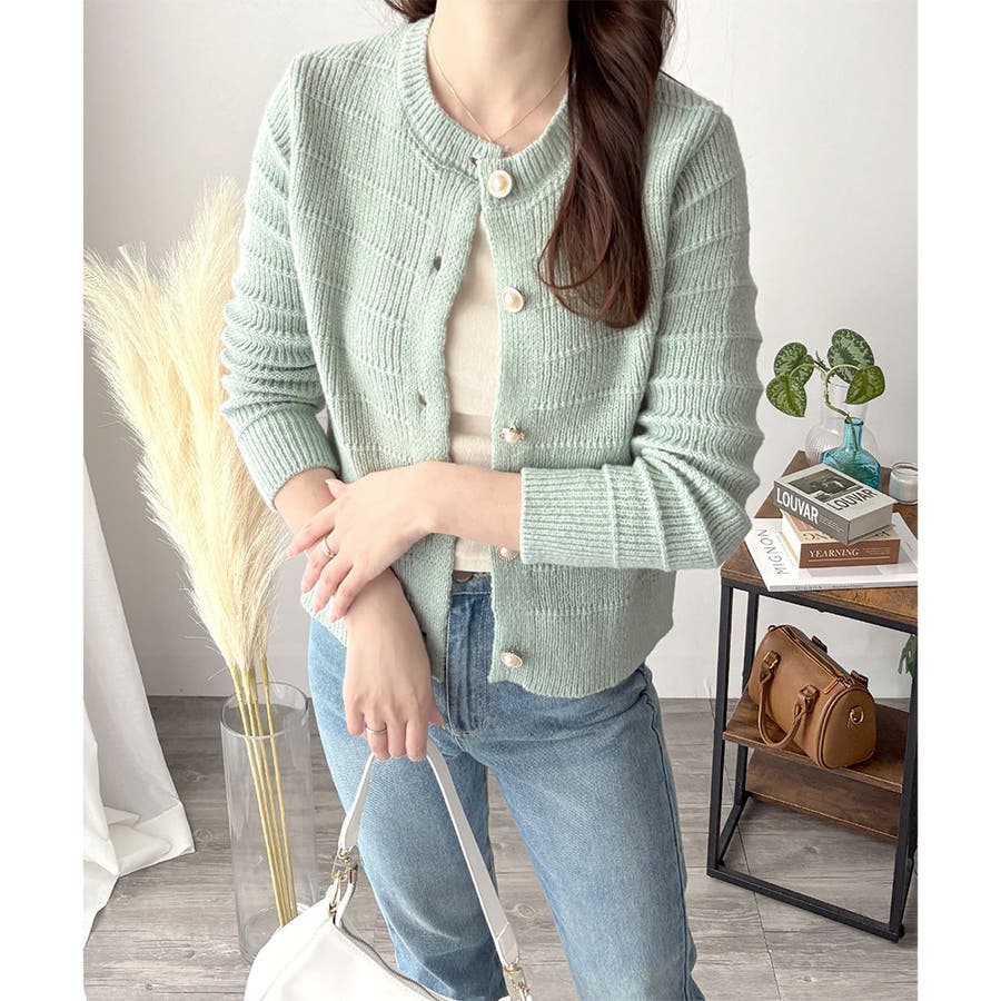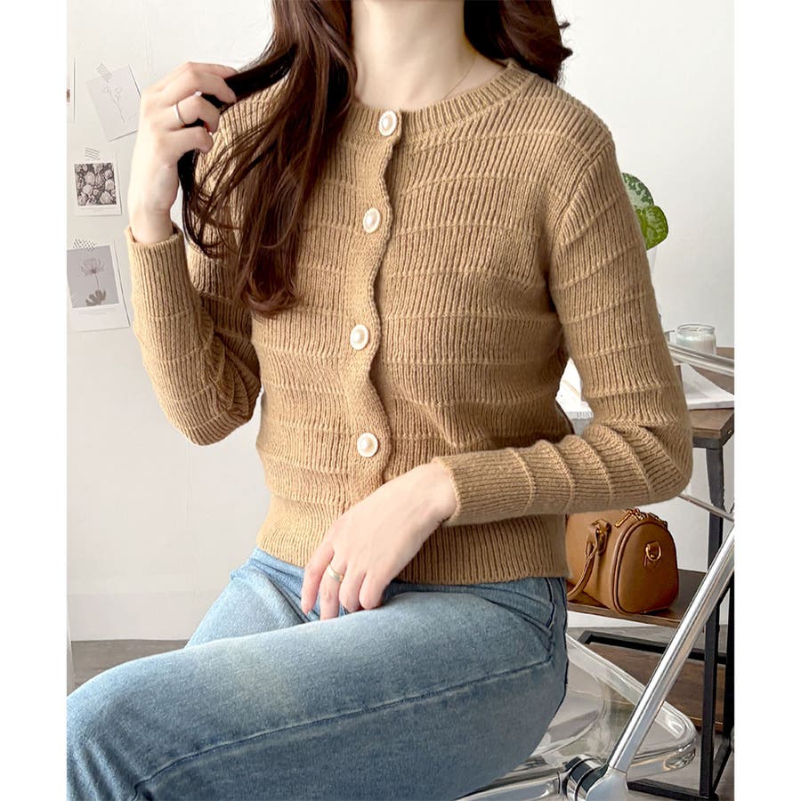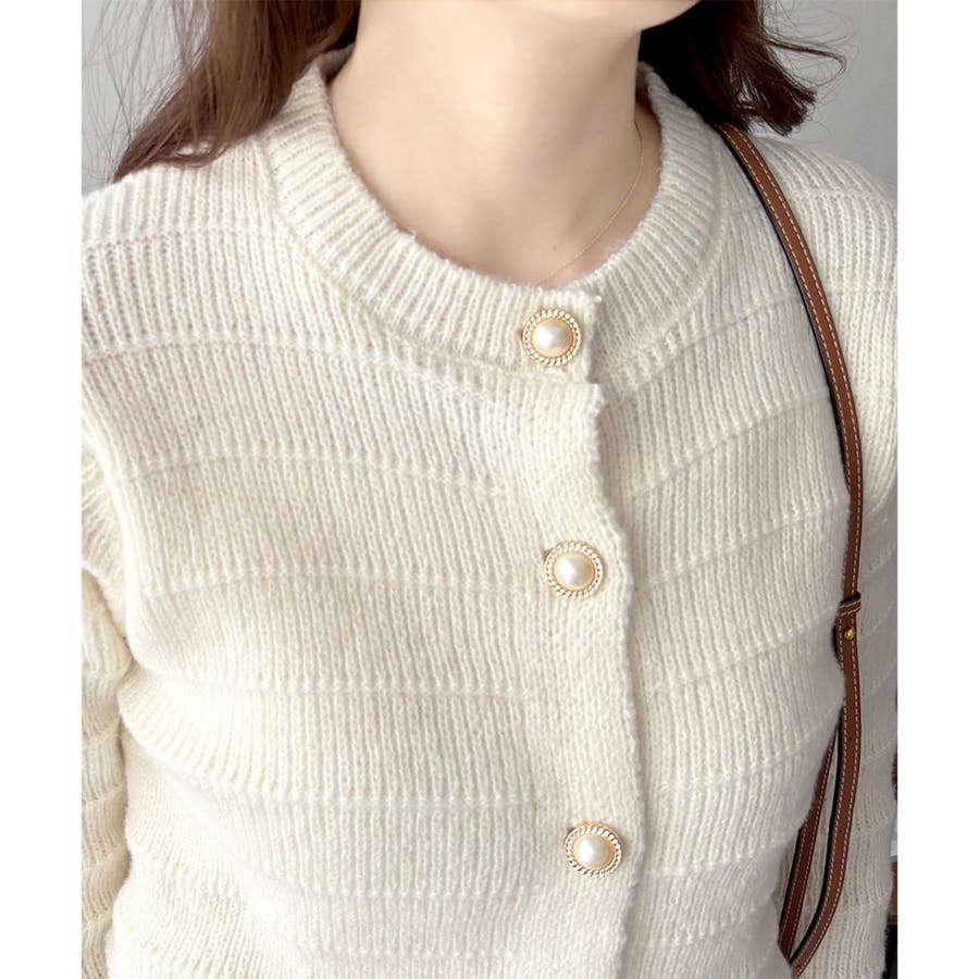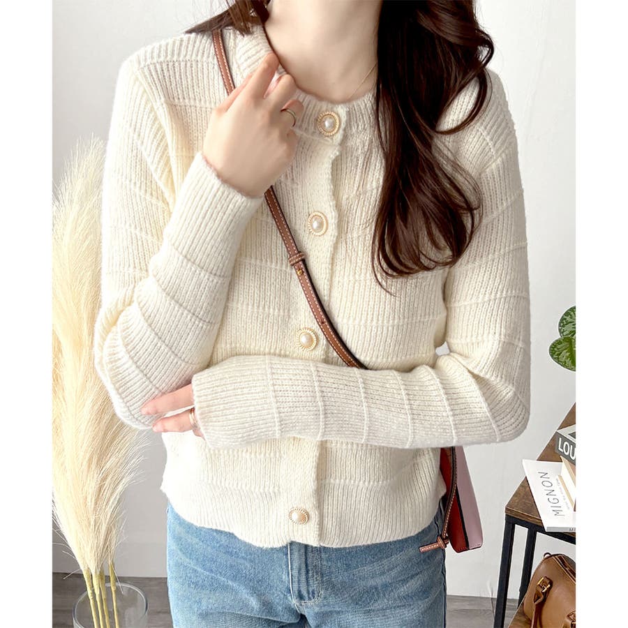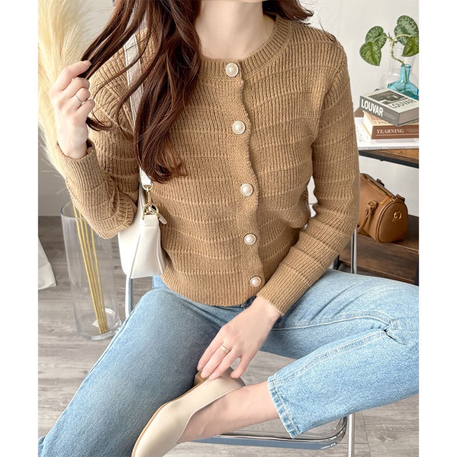 シンプルながらも立体感のある編み地が魅力のクルーネックカーディガン。