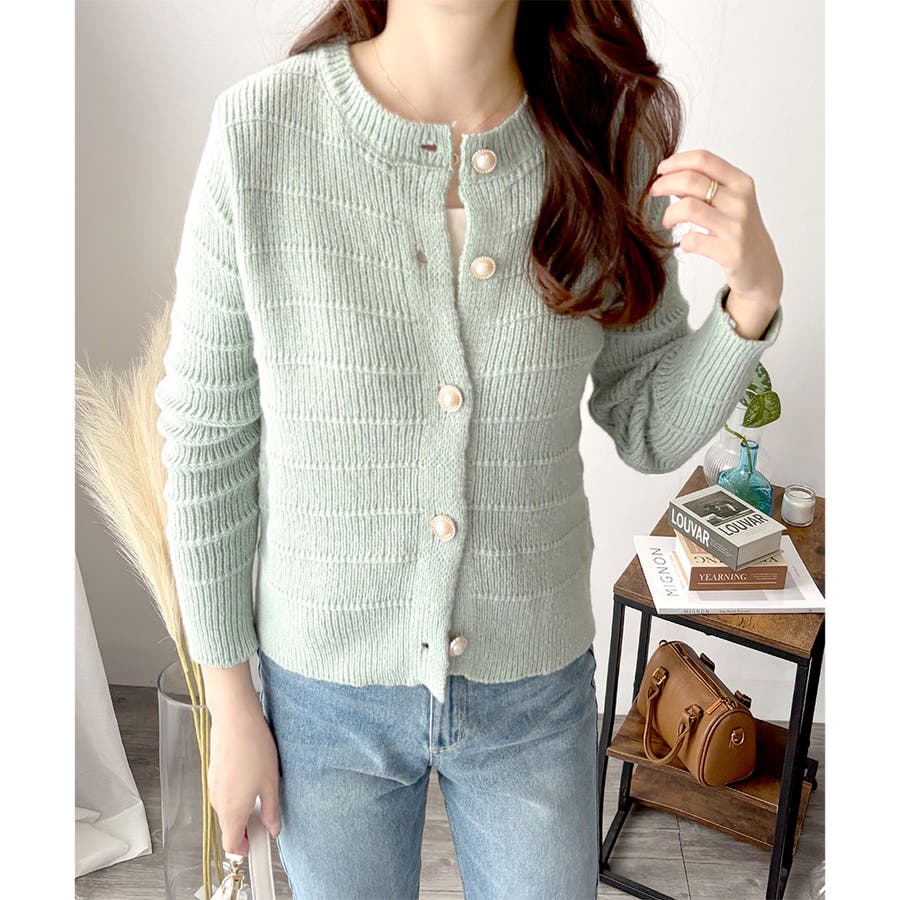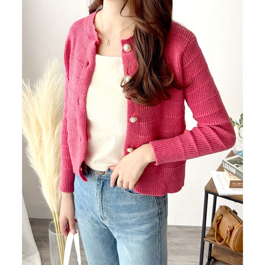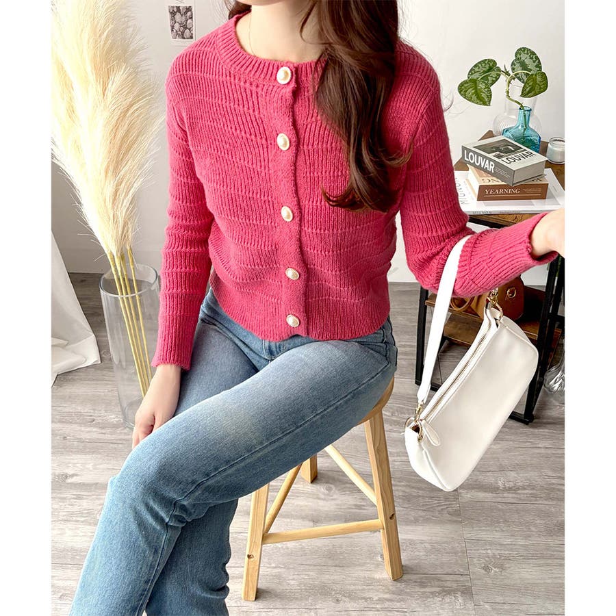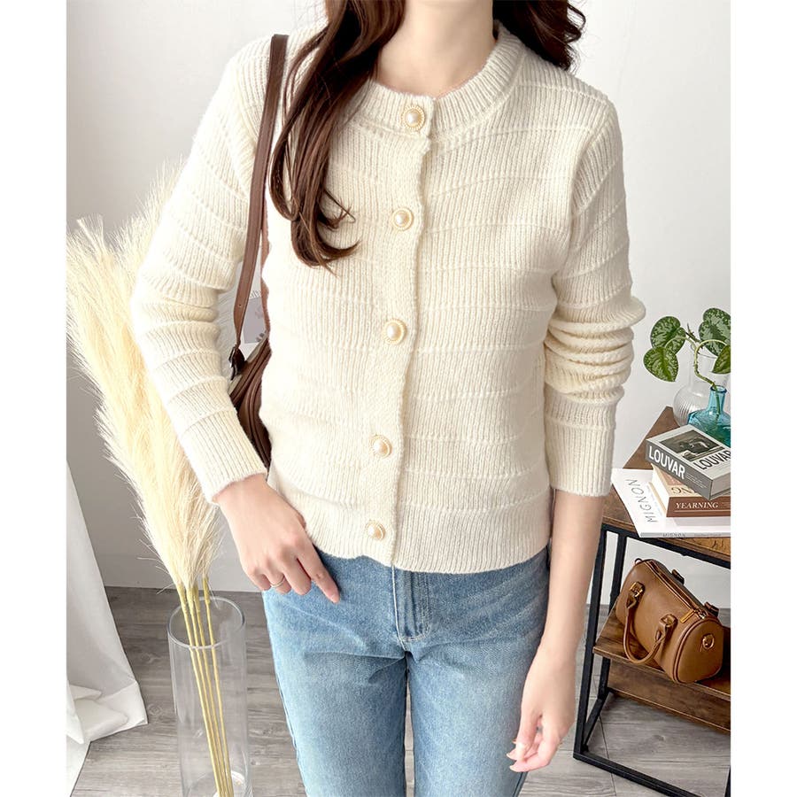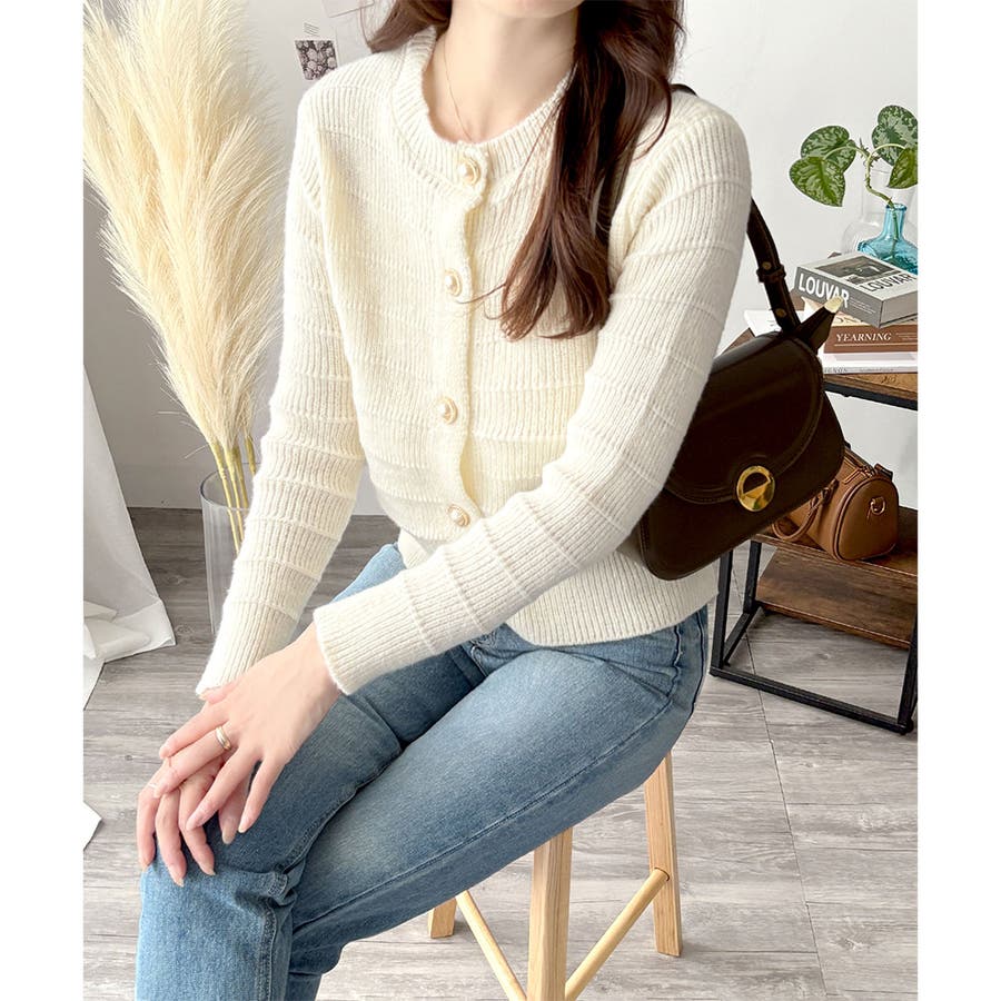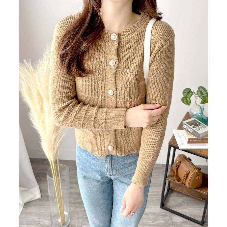 シンプルながらも立体感のある編み地が魅力のクルーネックカーディガン。