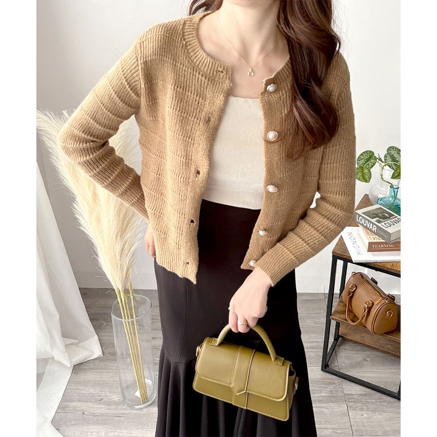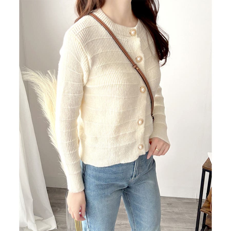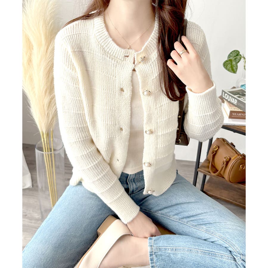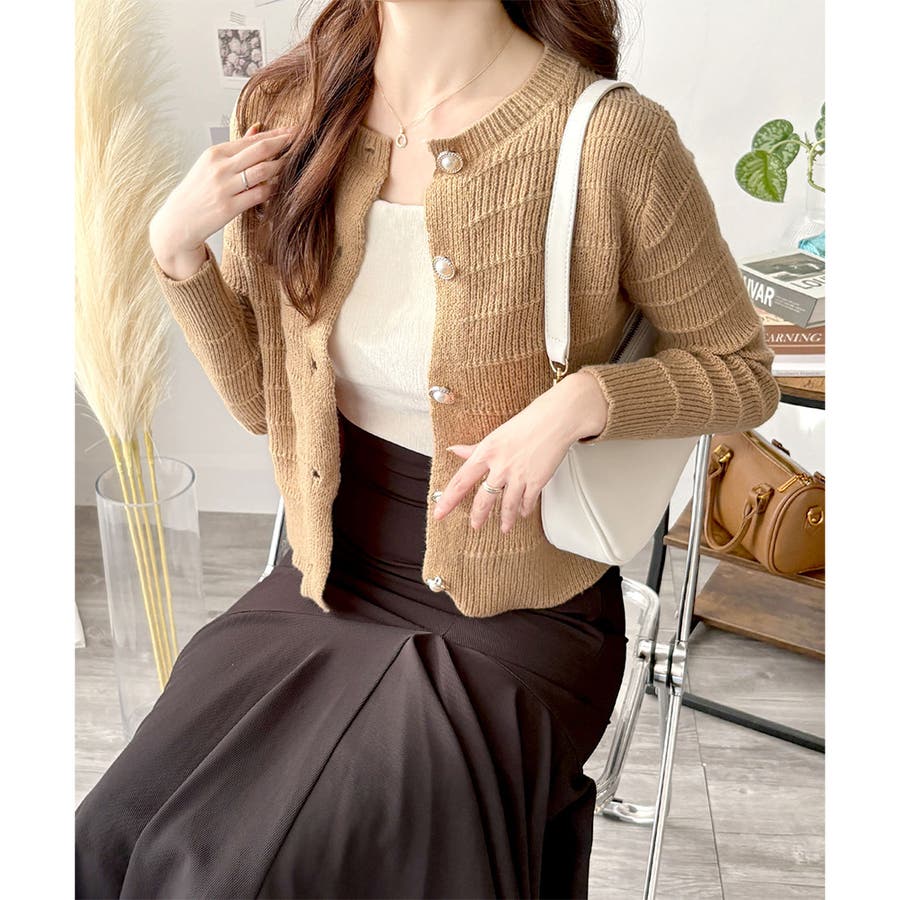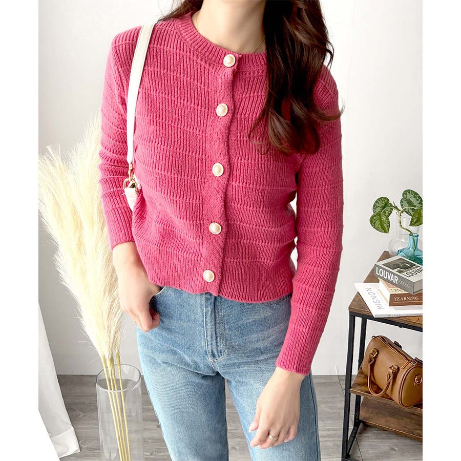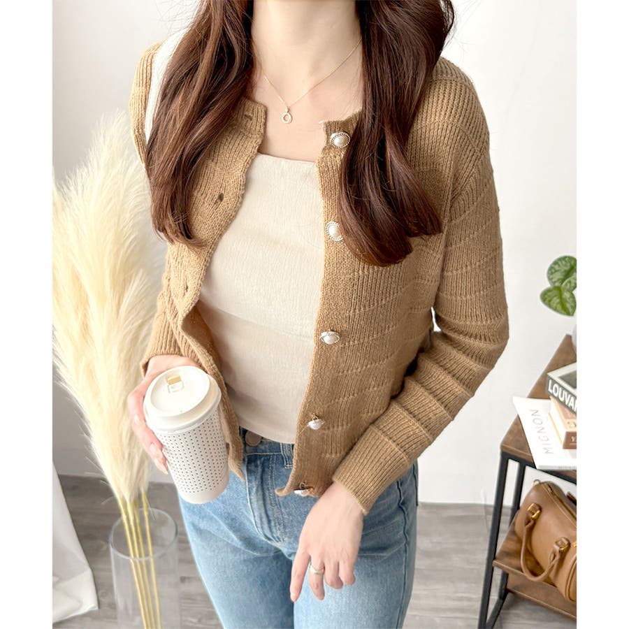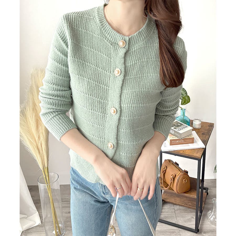シンプルながらも立体感のある編み地が魅力のクルーネックカーディガン。