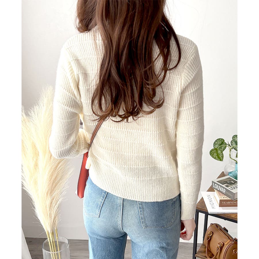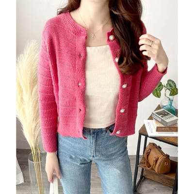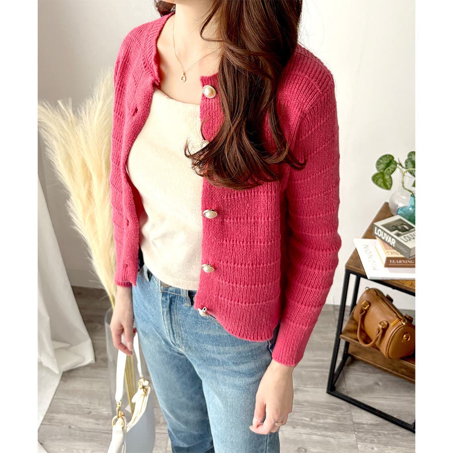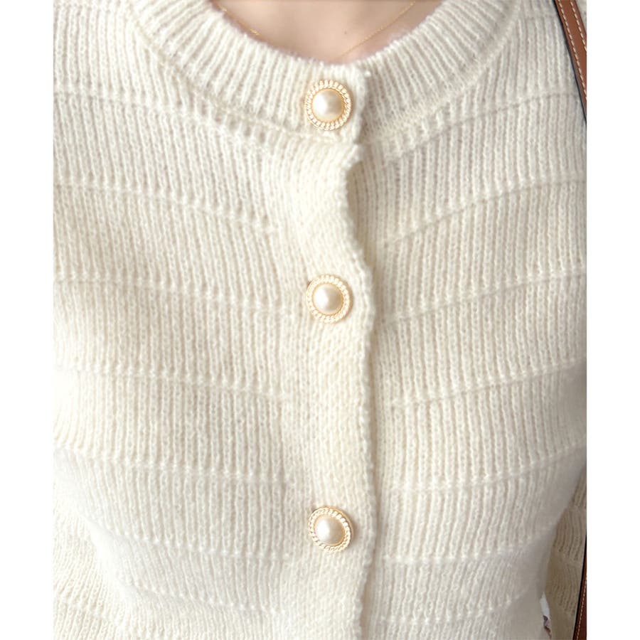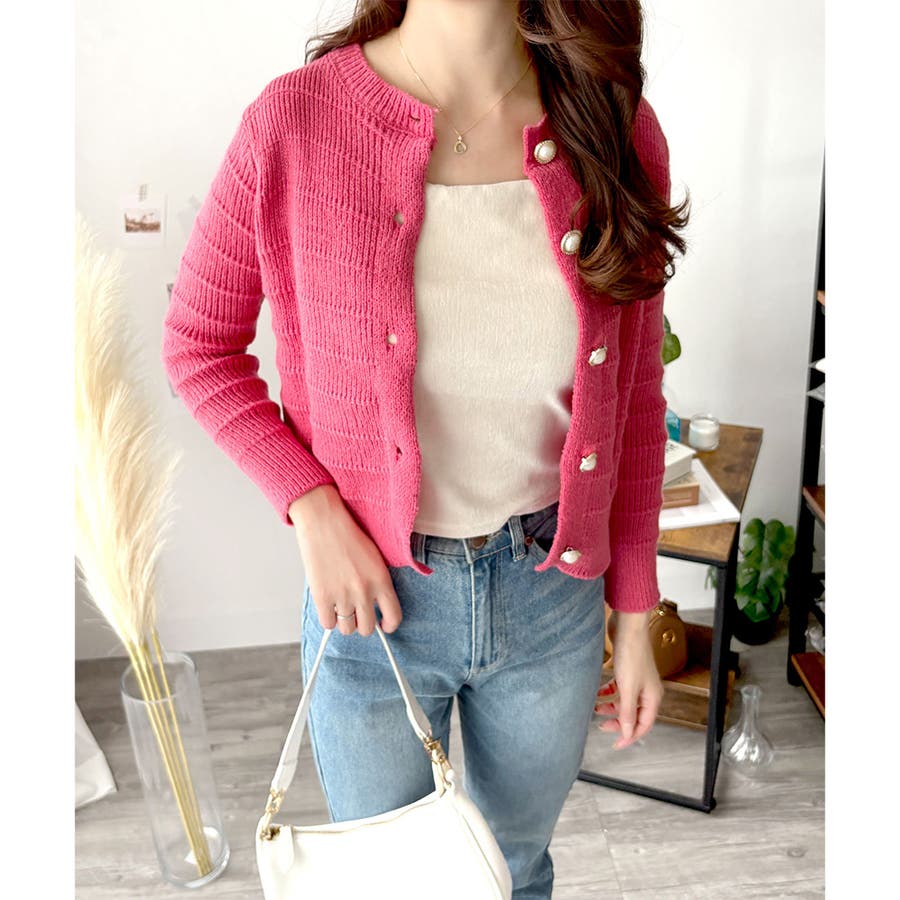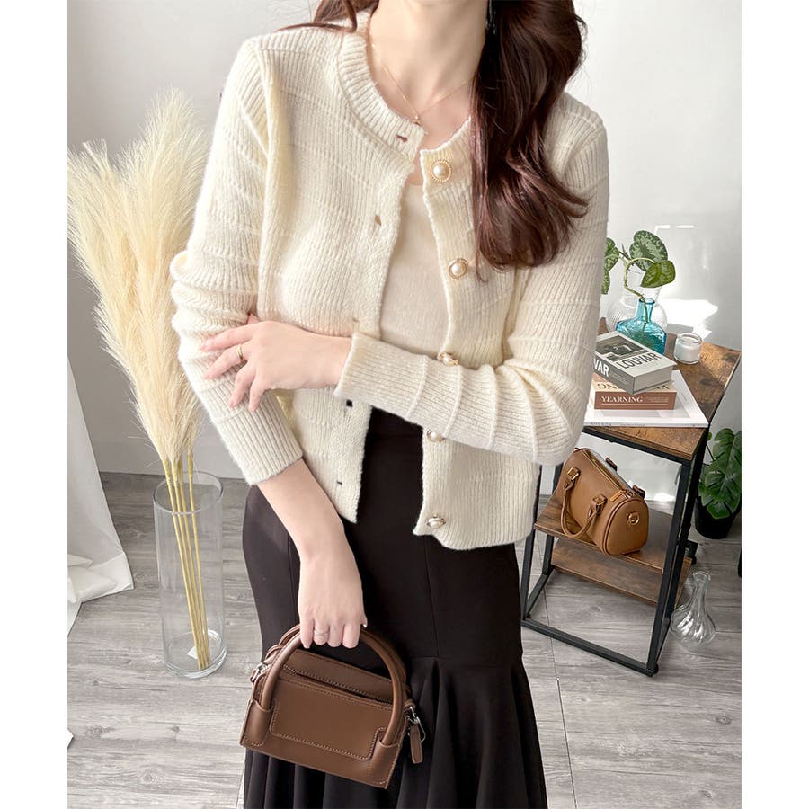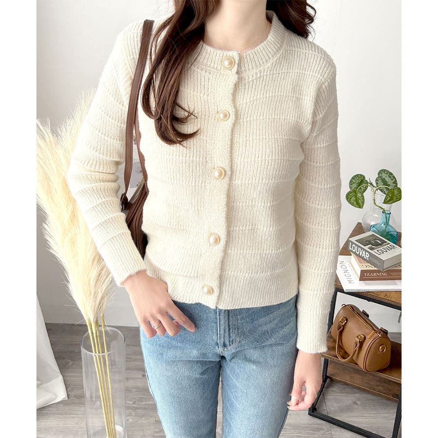 シンプルながらも立体感のある編み地が魅力のクルーネックカーディガン。